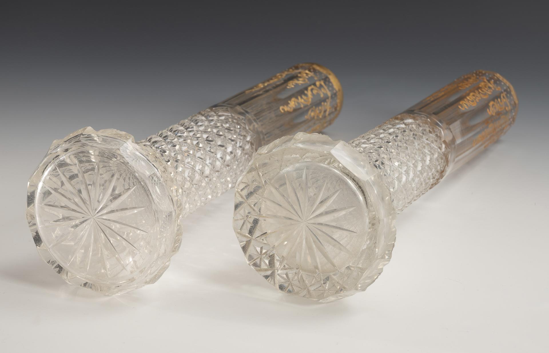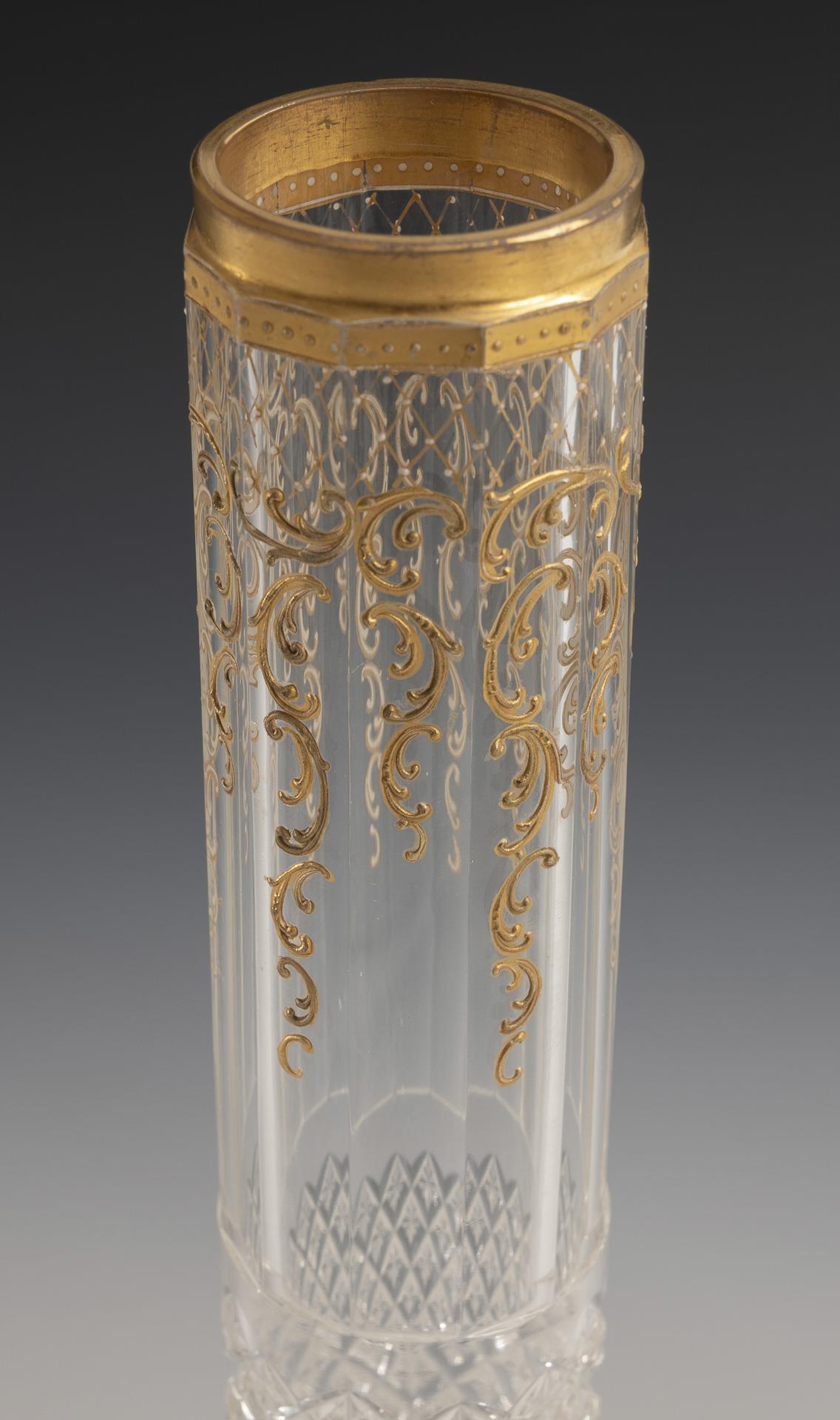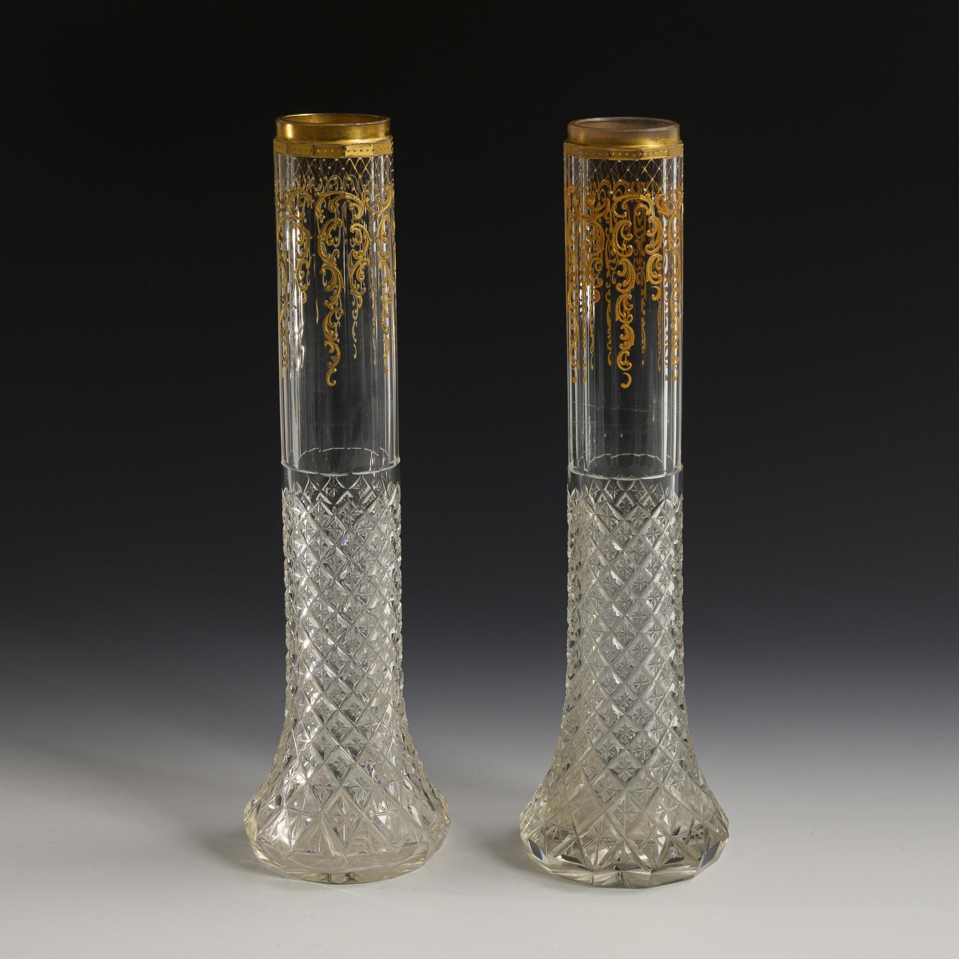 Schlanke Zylindervasen aus farblosem Glas mit breitem Stand. Mit Facetten- und Steinelschliff sowie Rocaille- und Grillagemalerei in Reliefemail und Gold. 1x kleine Bestoßung am Mündungsrand (Ø ca. 2 mm), Gold teils berieben.