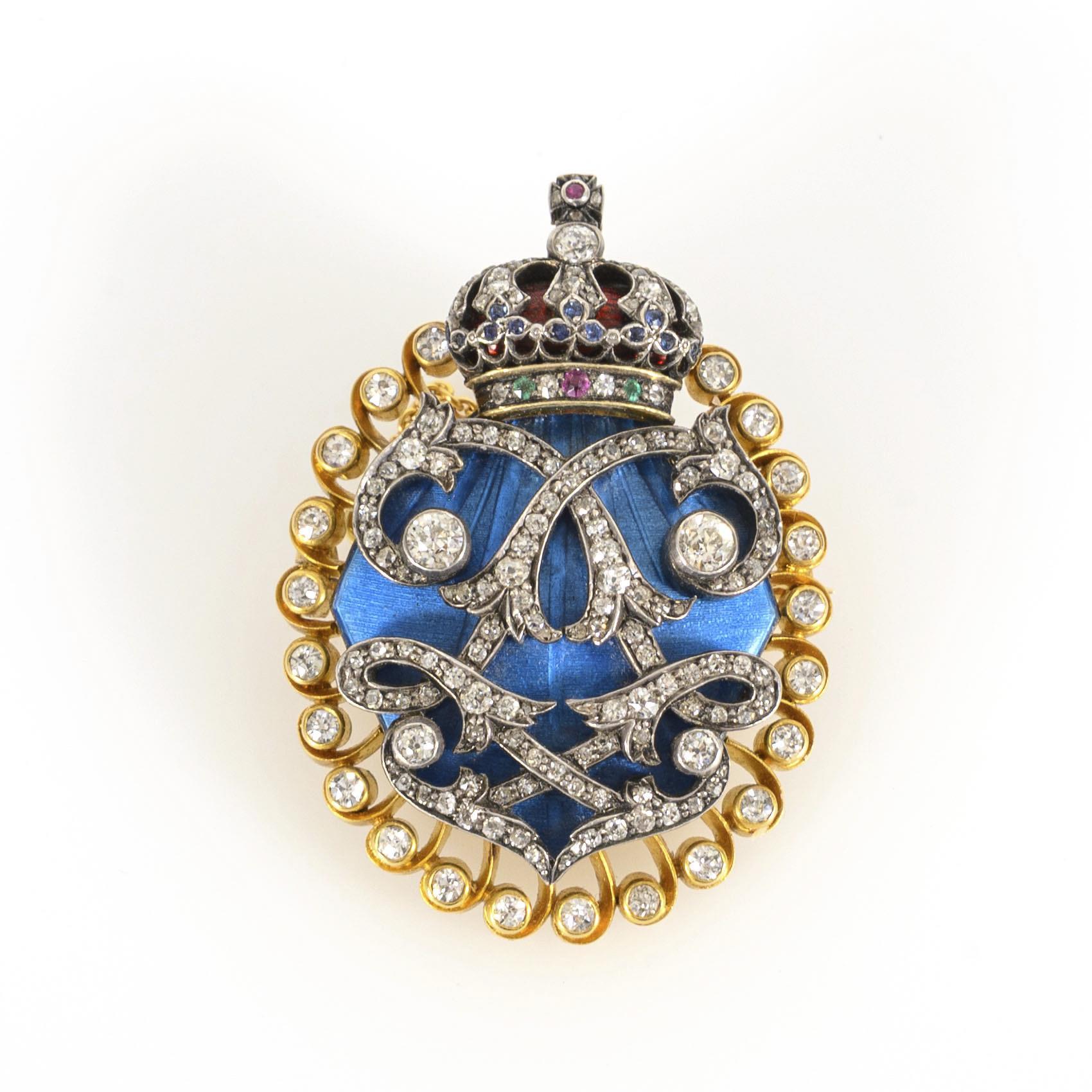 Brosche mit dem bekrönten Spiegelmonogramm König Ludwigs II. (1845-1886; im Volksmund als der "Märchenkönig" und als Erbauer von Schloss Neuschwanstein bekannt) von Bayern. Das Monogramm mit in Silber gefassten Altschliff-Brillanten und Diamanten vor einer blauen Emaillierung, darüber, teils rot emailliert, die ebenfalls mit Diamanten, sowie roten, grünen und blauen Farbsteinen, wohl Rubinen, Smaragden und Saphiren besetzte bayrische Königskrone. Einfacher Hakenverschluss und Sicherungskettchen. Die Gestaltung der Brosche mit dem gespiegelten Monogramm des Königs, der Krone sowie die besonders hochwertige Auswahl der Materialien zeigen, dass es sich um eine speziell für den König als Ehrengeschenk gefertigte Arbeit handelt. Die Brosche befindet sich in ihrem Originaletui des Würzburger Juweliers Lucas Lortz (seit dem 09.04.1889 Königlich Bayerischer Hofjuwelier). Die Schließe des Etuis ist ebenfalls in Form der bayrischen Königskrone gearbeitet.
