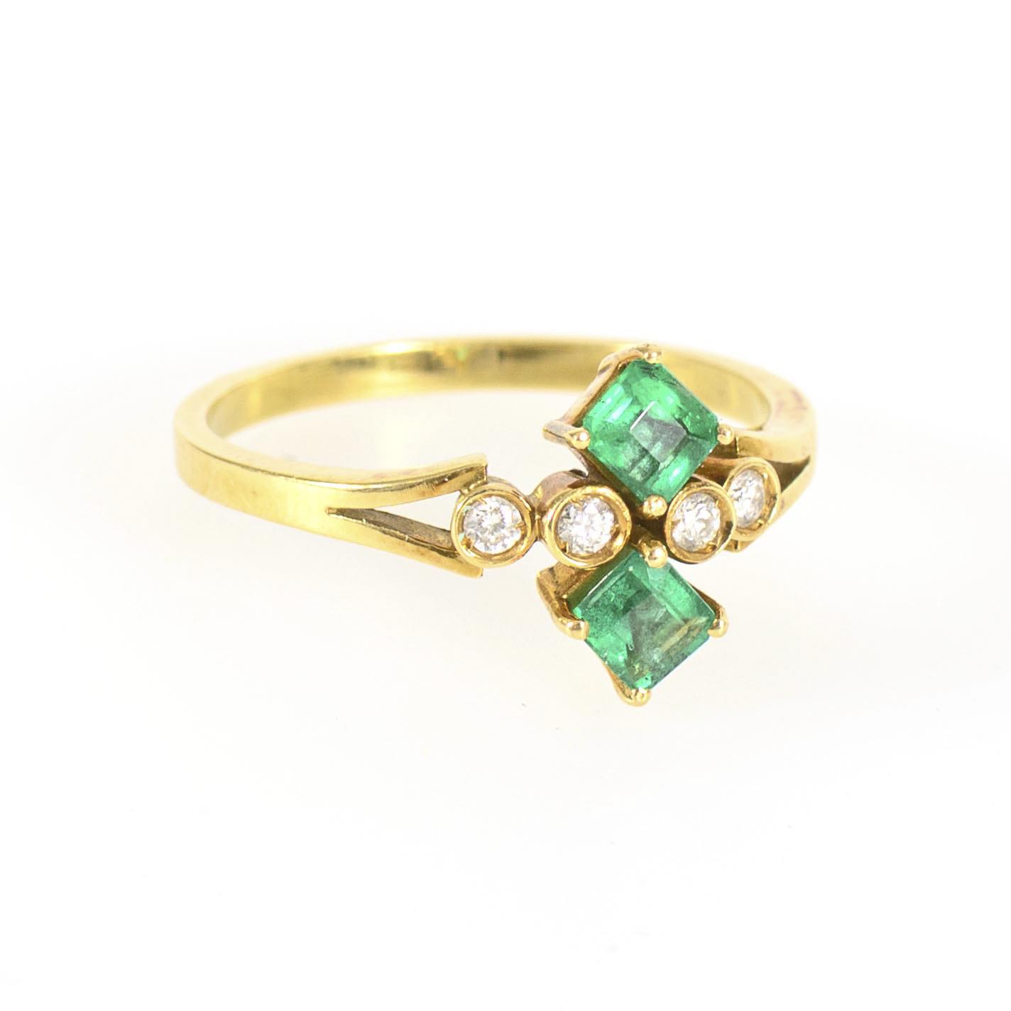 Ring mit vier zargengefassten Brillanten, an die ober- und unterseitig je ein grünes Farbstein-Carré, wohl Smaragde, angesetzt sind. Unterseitig mit leichten Tragespuren, an den Ringschultern leichte Oxydationsspuren.