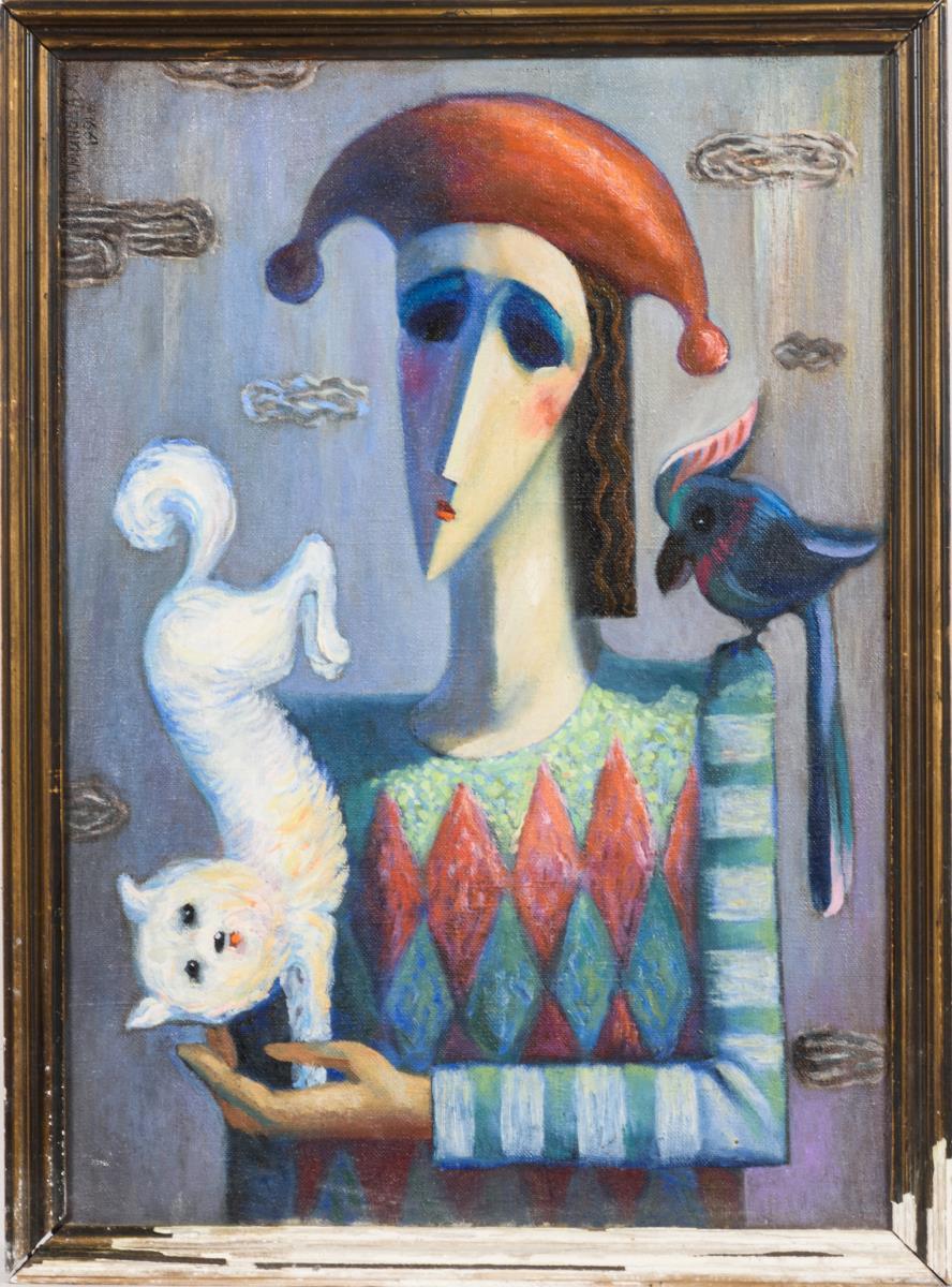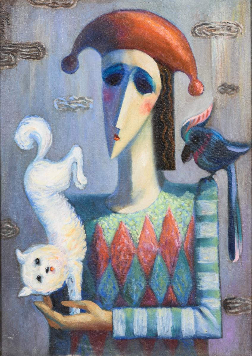 Russischer Maler: Harlekin mit Paradiesvogel und Hund