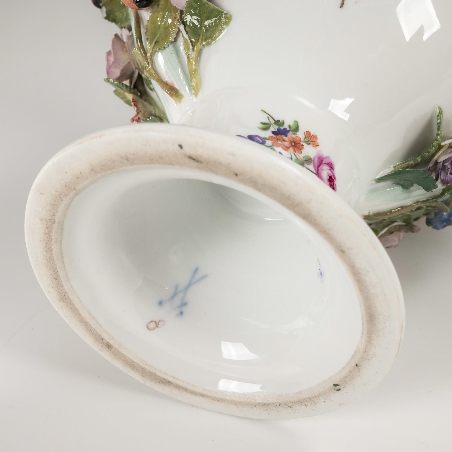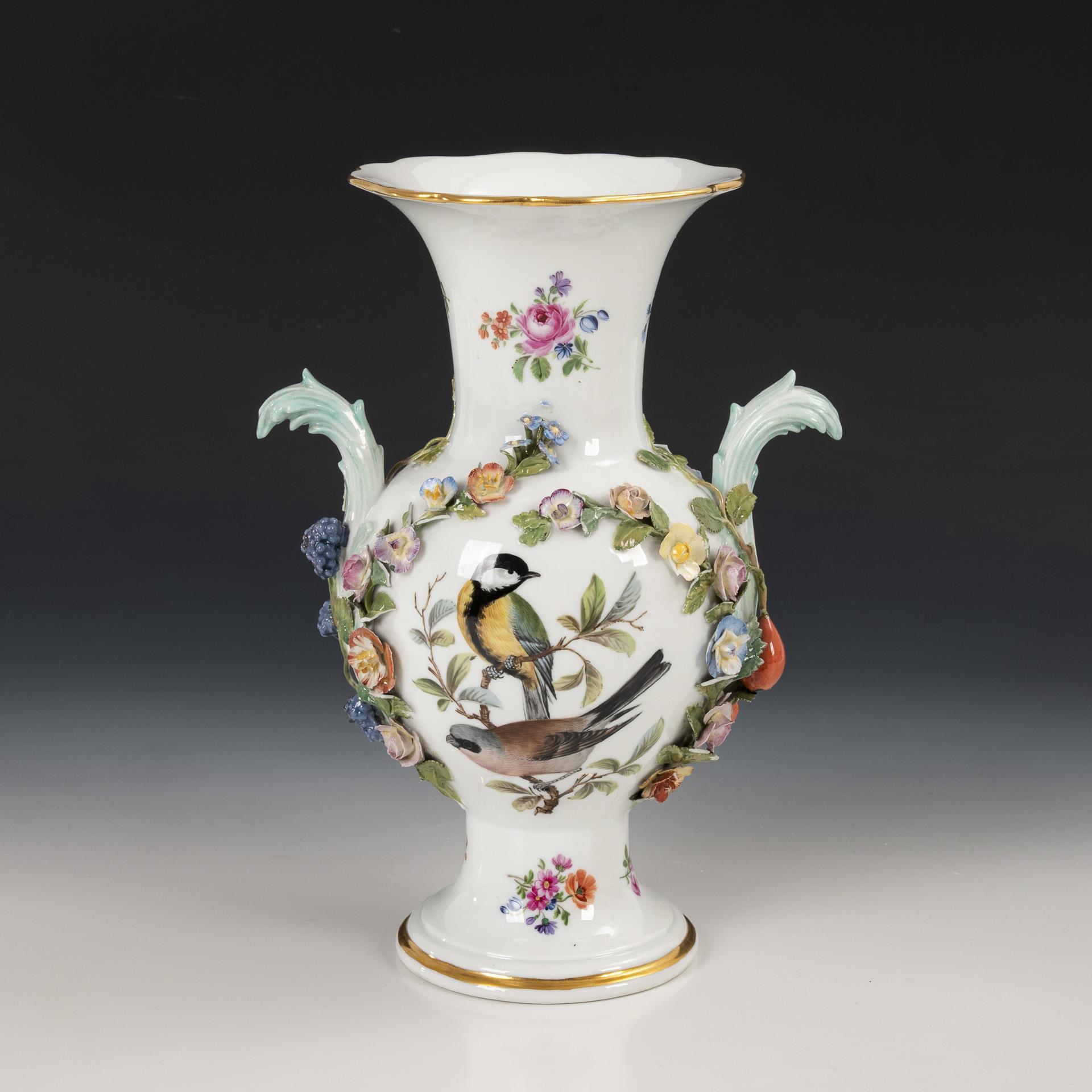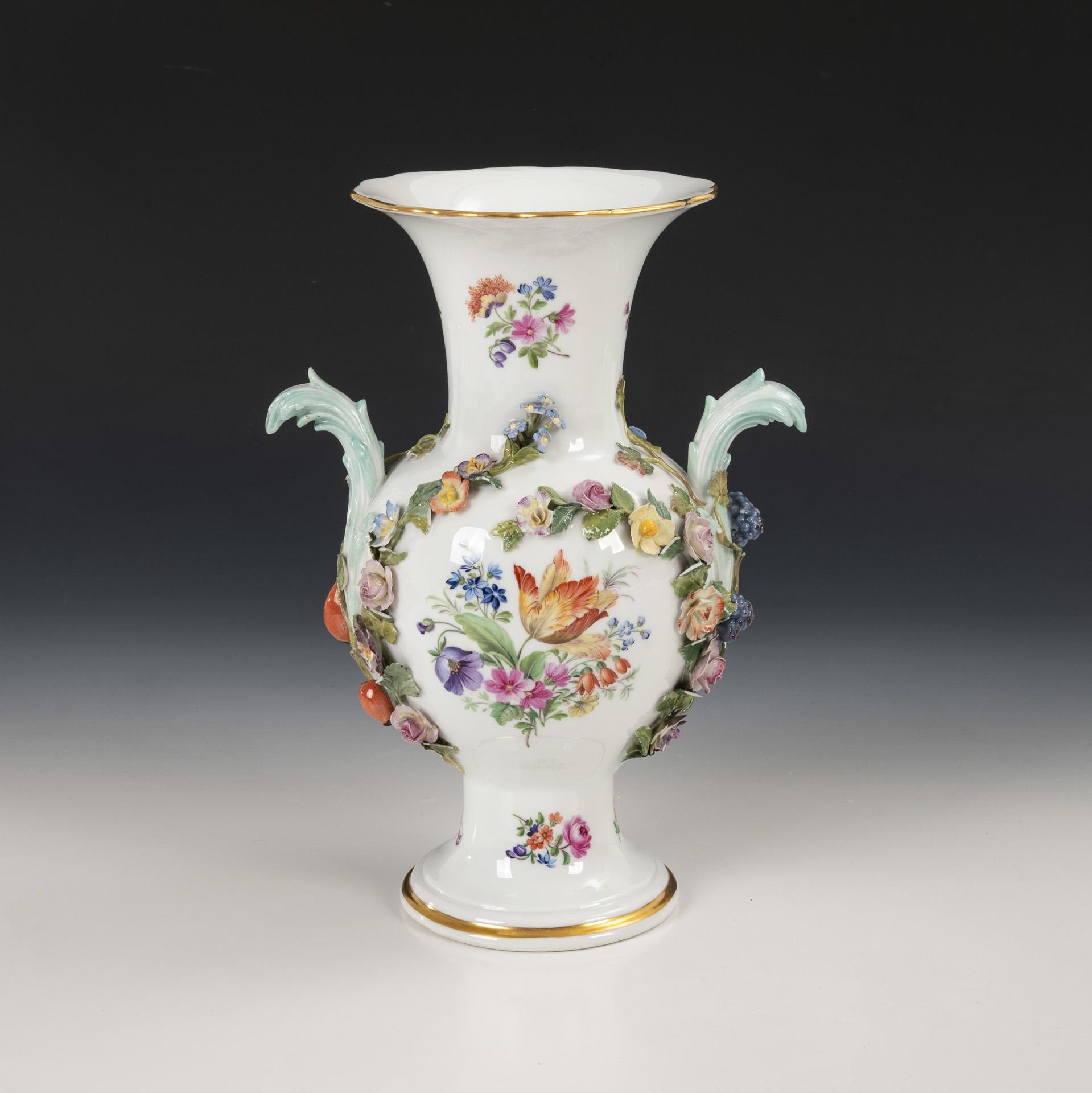 Balustervase mit Kraterhals und zwei Blatthandhaben. Auf der Wandung Vogel- und Blumenmalerei sowie aufgelegte Blüten- und Fruchtgirlanden. Belag bestoßen.