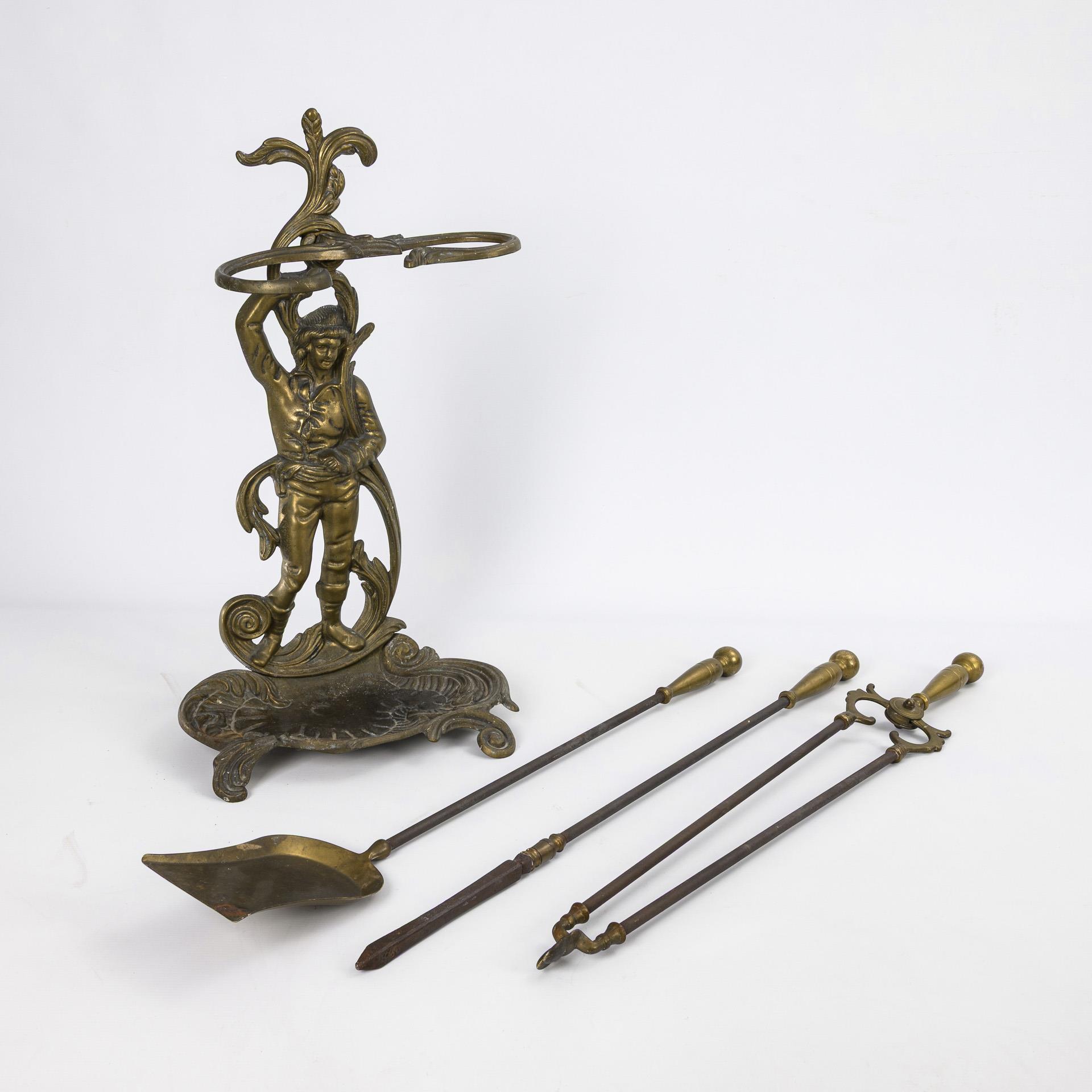 In Anlehnung an das Rokoko mit Blattrocaillen gestalteter Ständer mit der Relieffigur eines stehenden jungen Mannes. Zange, Schaufel und gerader "Schürhaken". Wenige Alters-/Gebrauchsspuren.