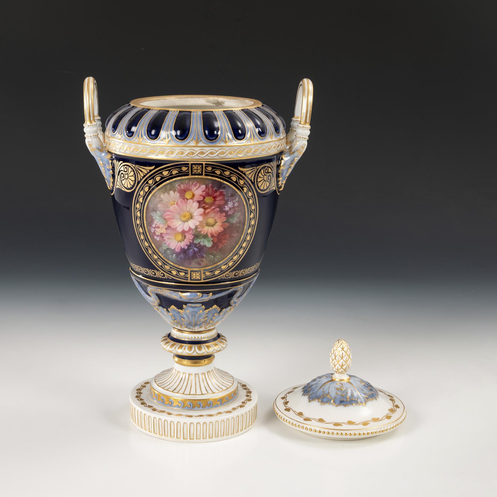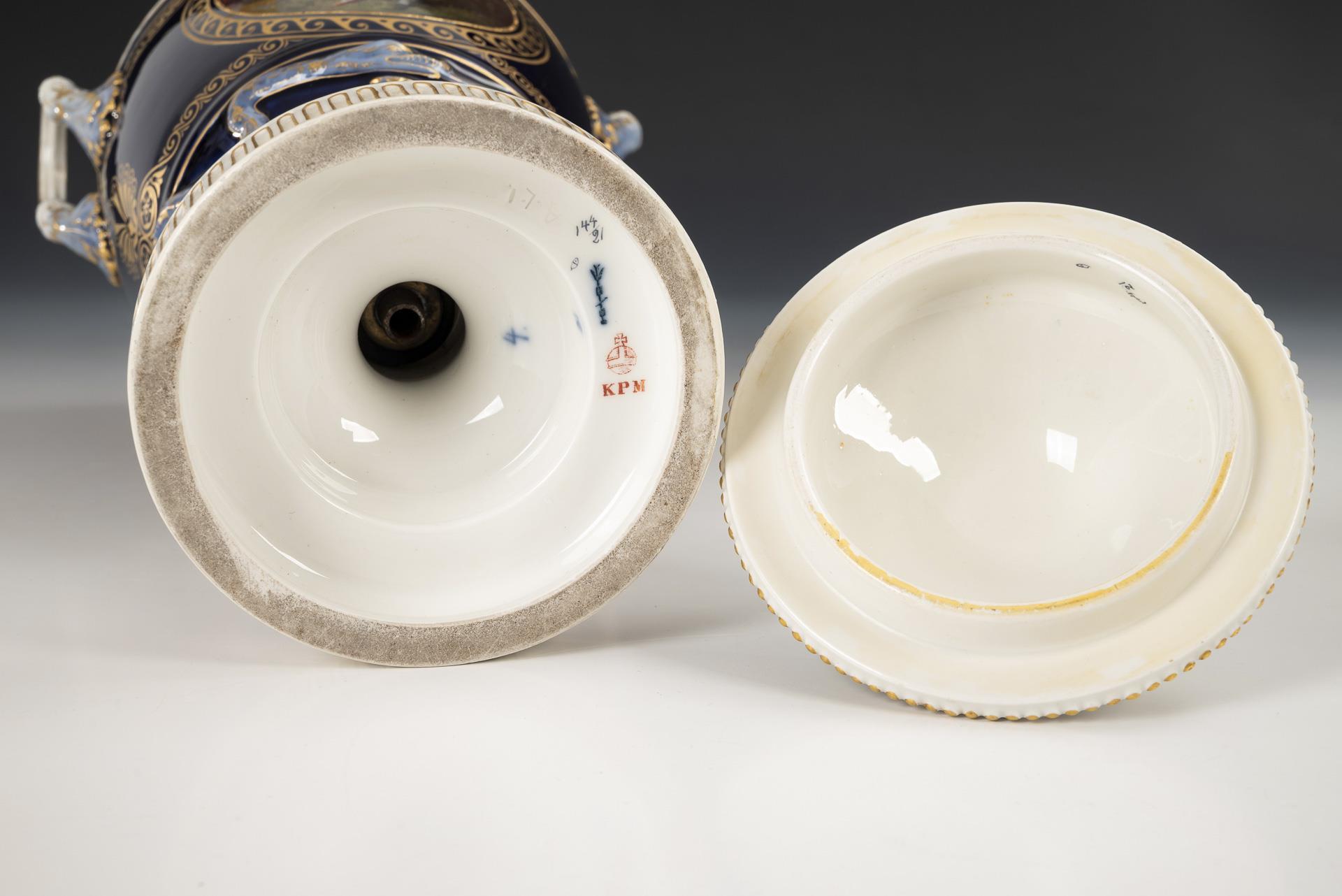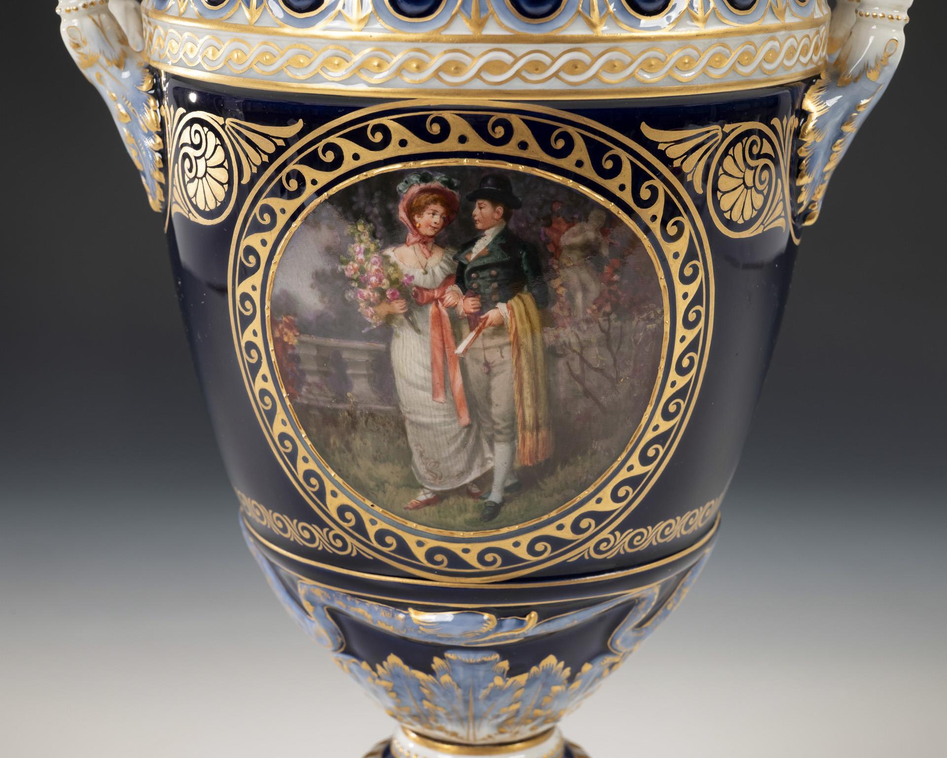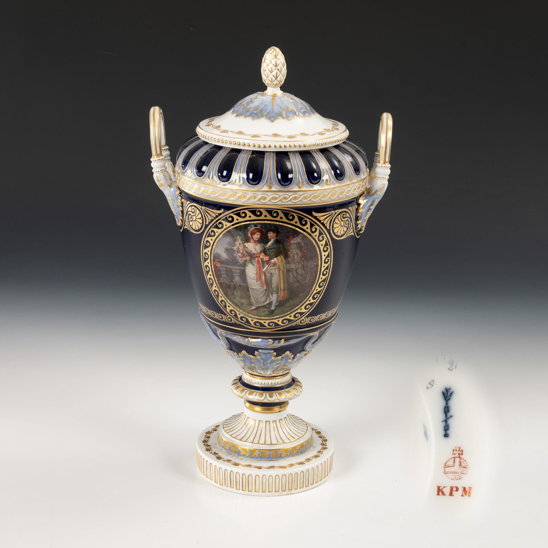 Sogenannte Weimar-Vase. Ovoider Korpus mit Zungenbandrelief, zwei Akanthusblatthenkeln, Knaufdeckel, kanneliertem Rundfuß, auf Rundplinthe. Unterglasurblauer Fond, schauseitig ein von einem goldenen Wellenband gerahmtes Medaillon mit der Darstellung eines Paares in einer Parklandschaft, verso ein Blumenbukett im Stil der Weichmalerei. Deckel restauriert.