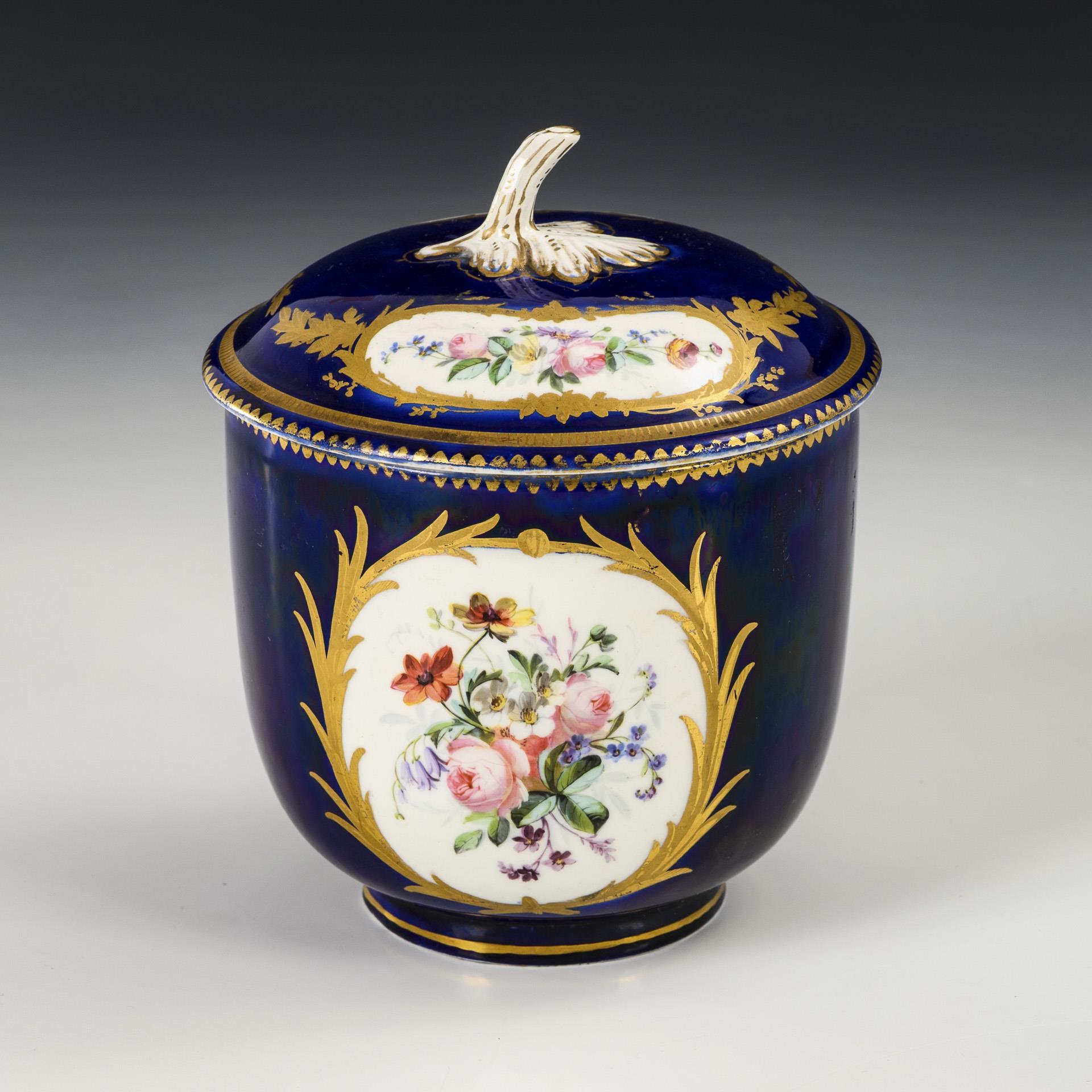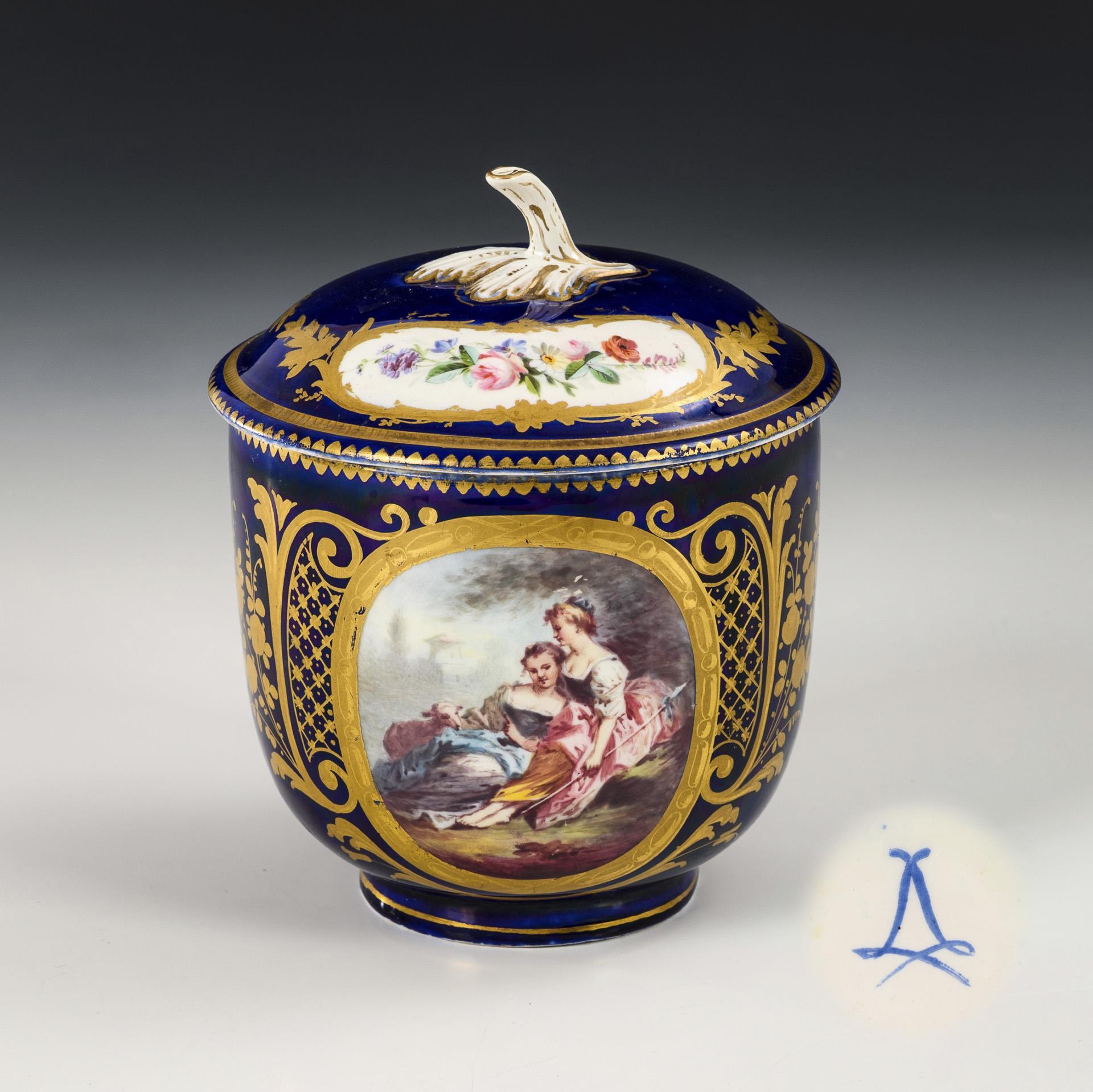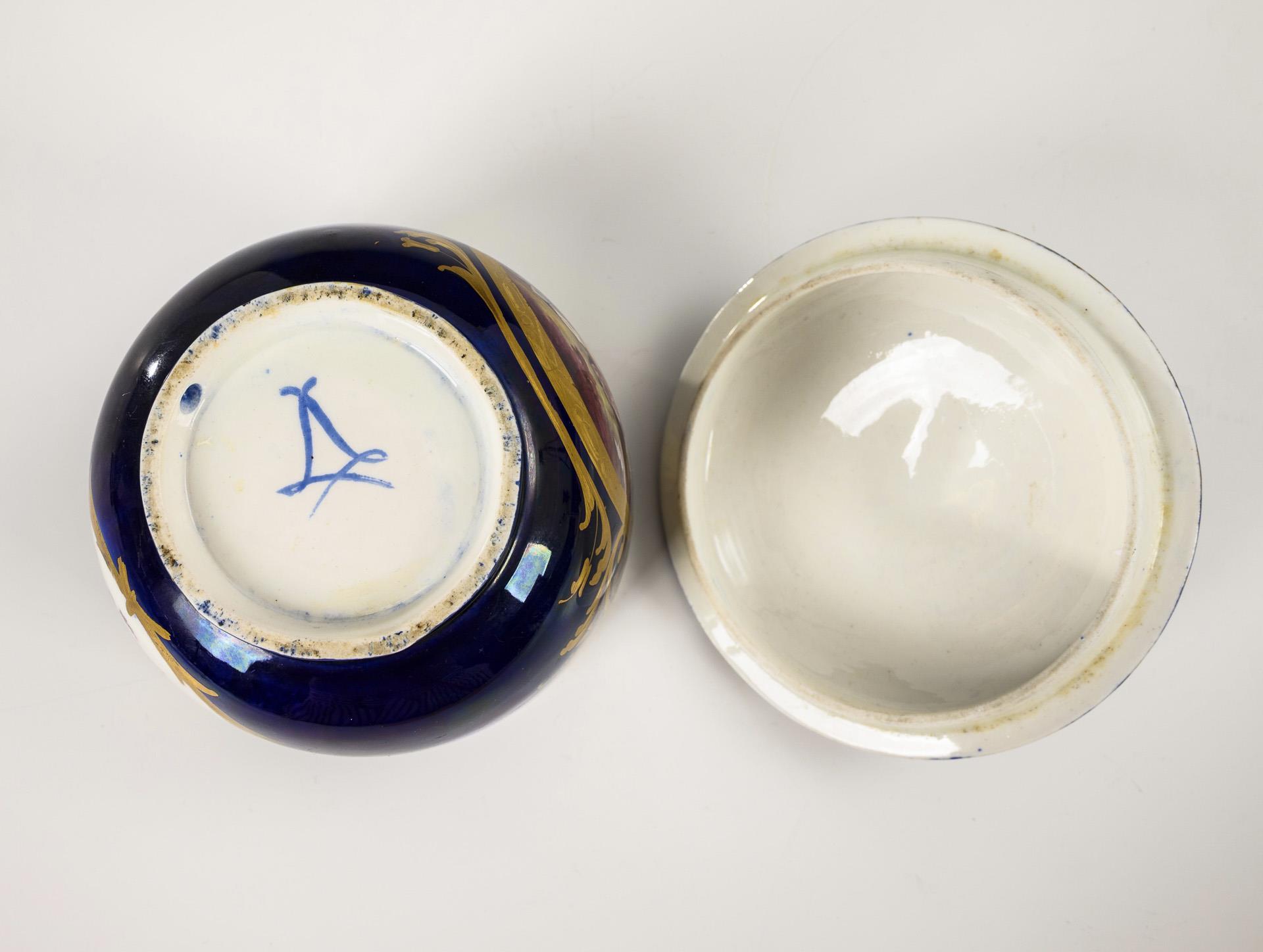Dose mit Kobaltfond und Watteau-Malerei.