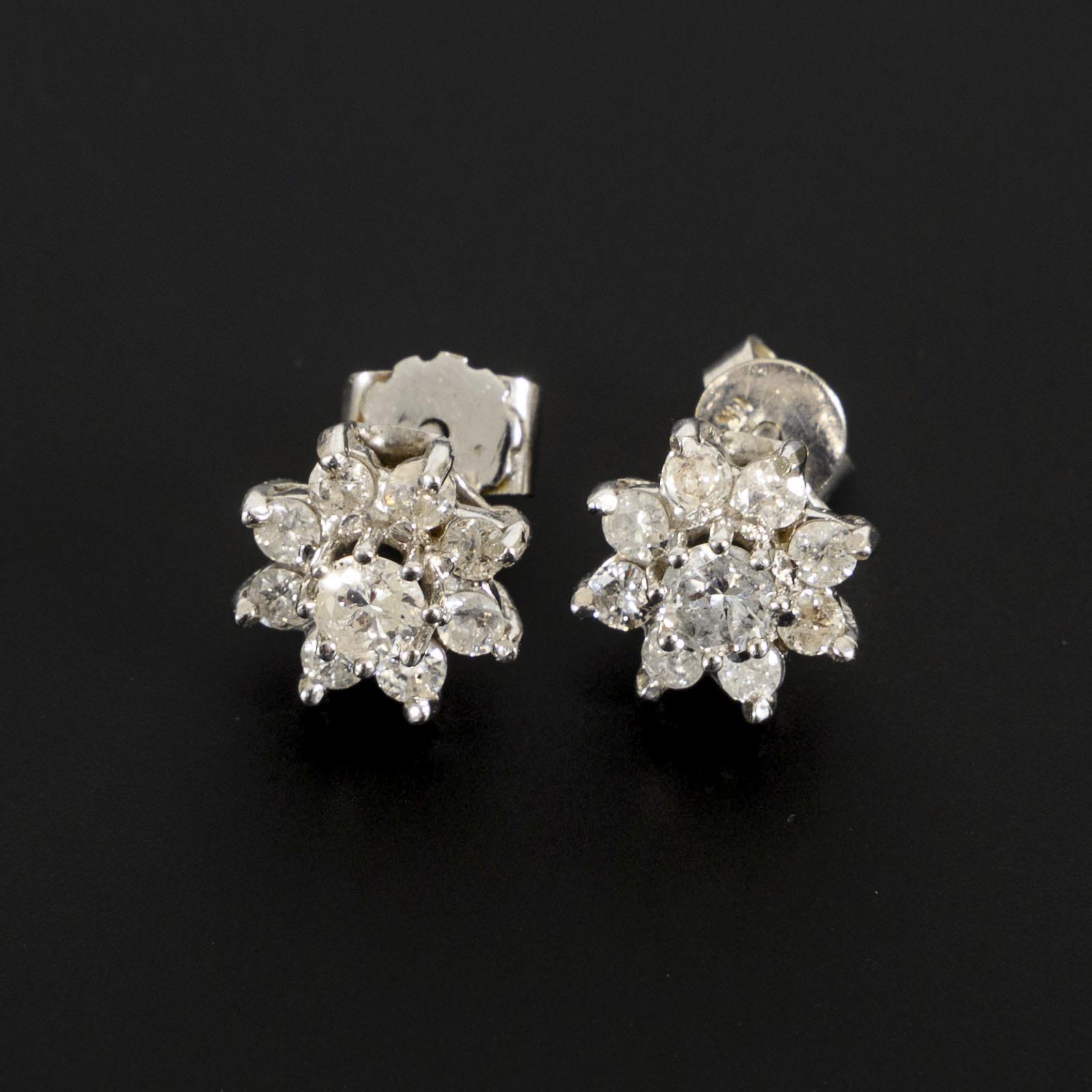 Ohrstecker in Form von Blüten, bestehend aus je einem größeren zentralen und 8 kleineren, krappengefassten Brillanten. Die Ohrmuttern unterschiedlich, beide wohl ergänzt.