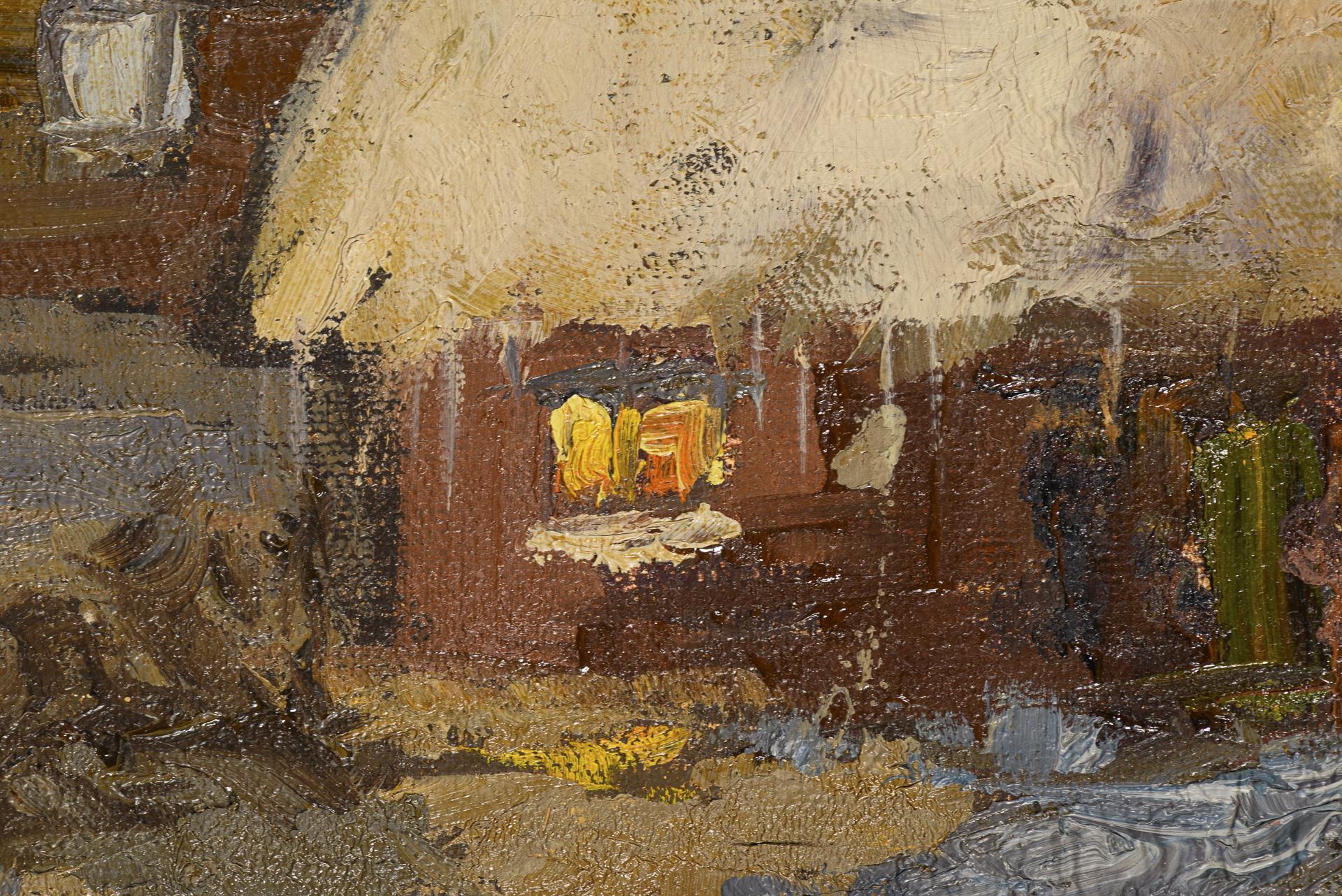 Verschneit in der Dunkelheit stehende reetgedeckte Häuser am Waldrand.
