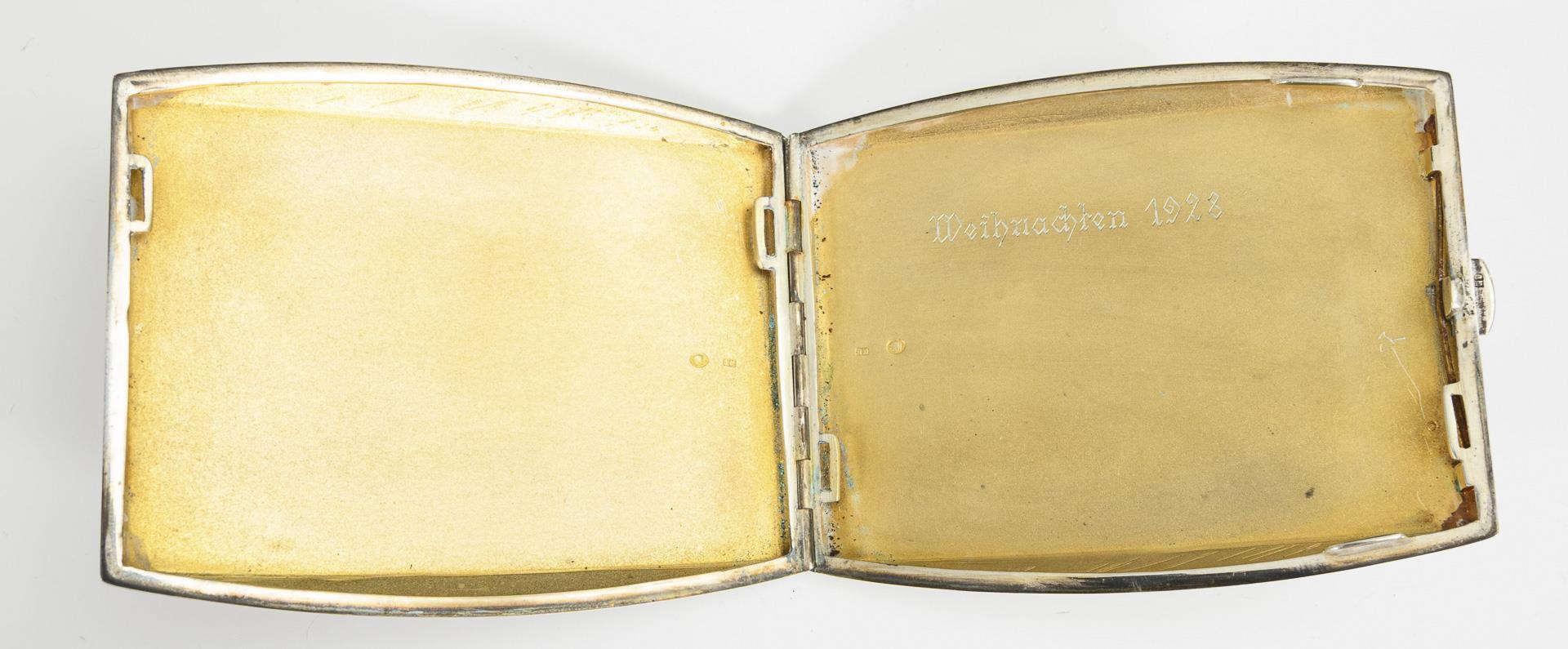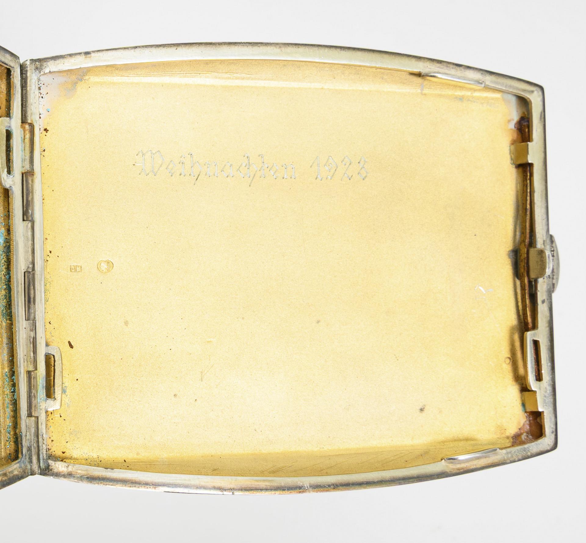 Fein guillochiertes Etui mit 2 blauen Emailleeinlagen und Monogrammgravur "GW". Innen vergoldet mit Datierung: "Weihnachten 1928". Unterseitig Delle.