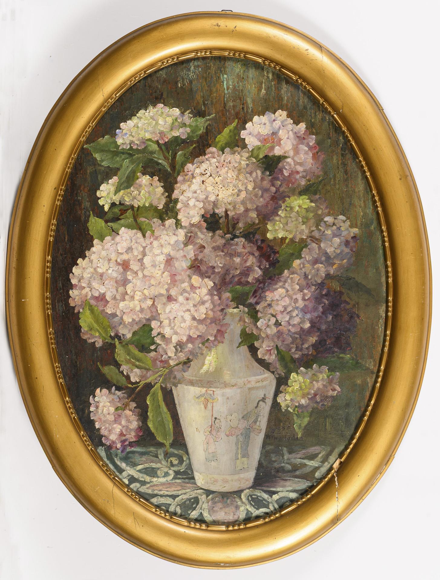 Ovales Blumenstillleben mit Flieder