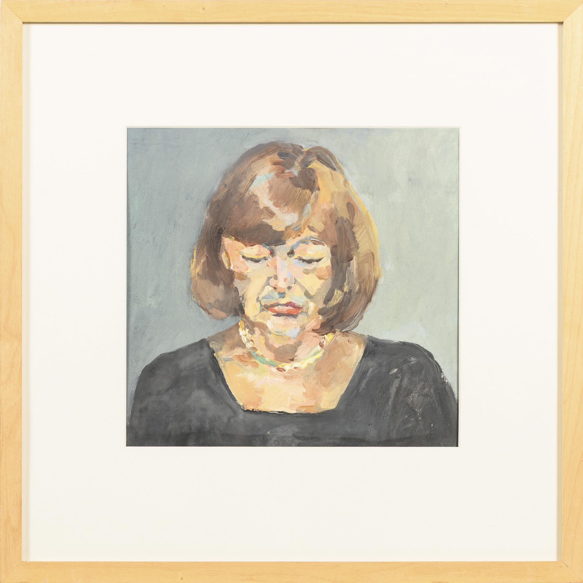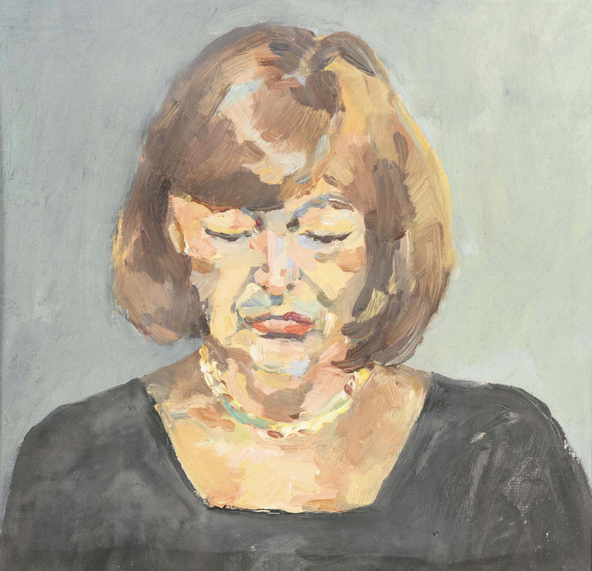 Frontales Porträt einer Frau mit Goldkette und gesenktem Blick.