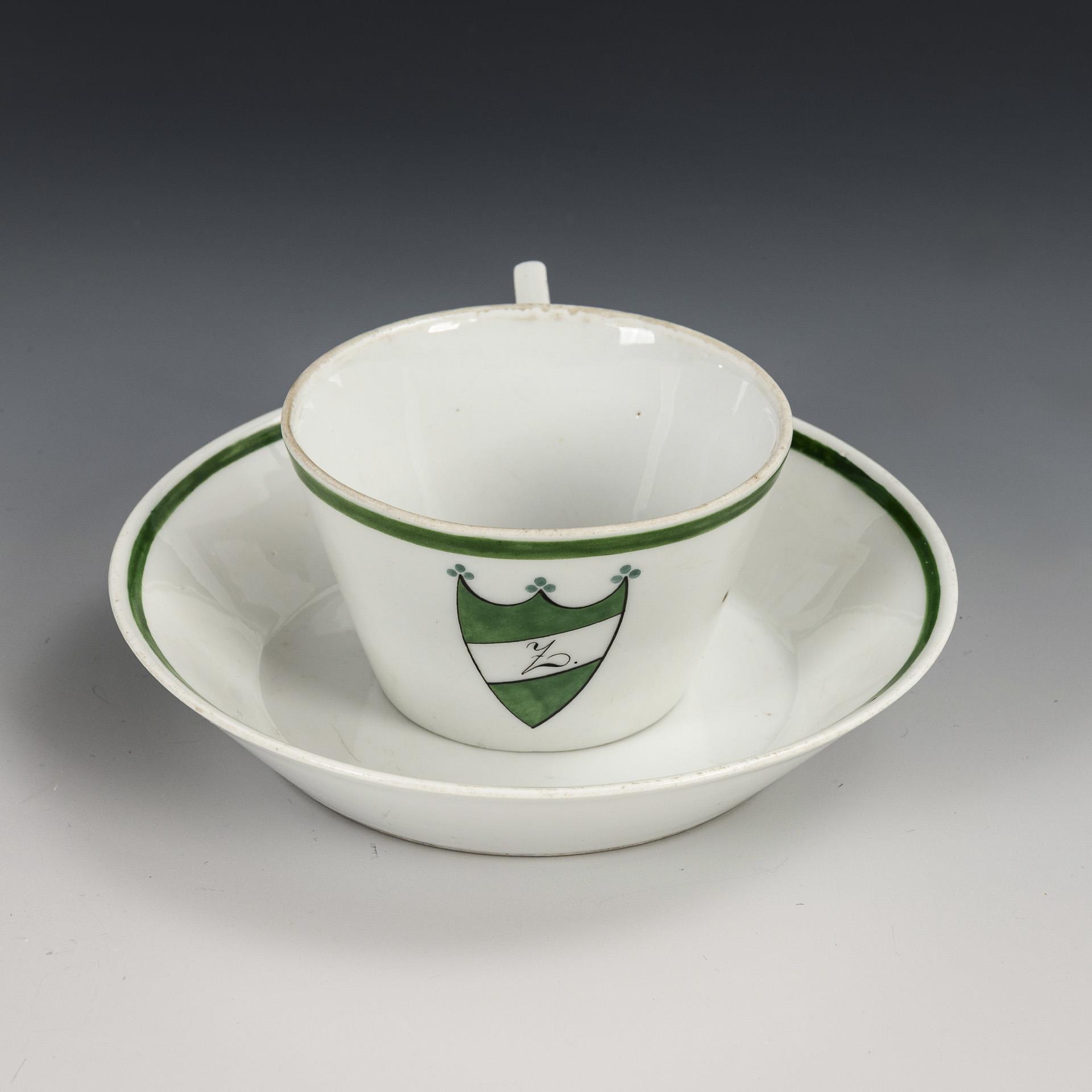 Konische Tasse mit gewinkeltem Henkel. Unter einem grünem Rand ein grün-weiß-grün gestreiftes Wappenschild mit dem Buchstaben "Z.", im Spiegel der Untertasse ein entsprechendes Wappenschild mit dem Buchstaben "Q.".