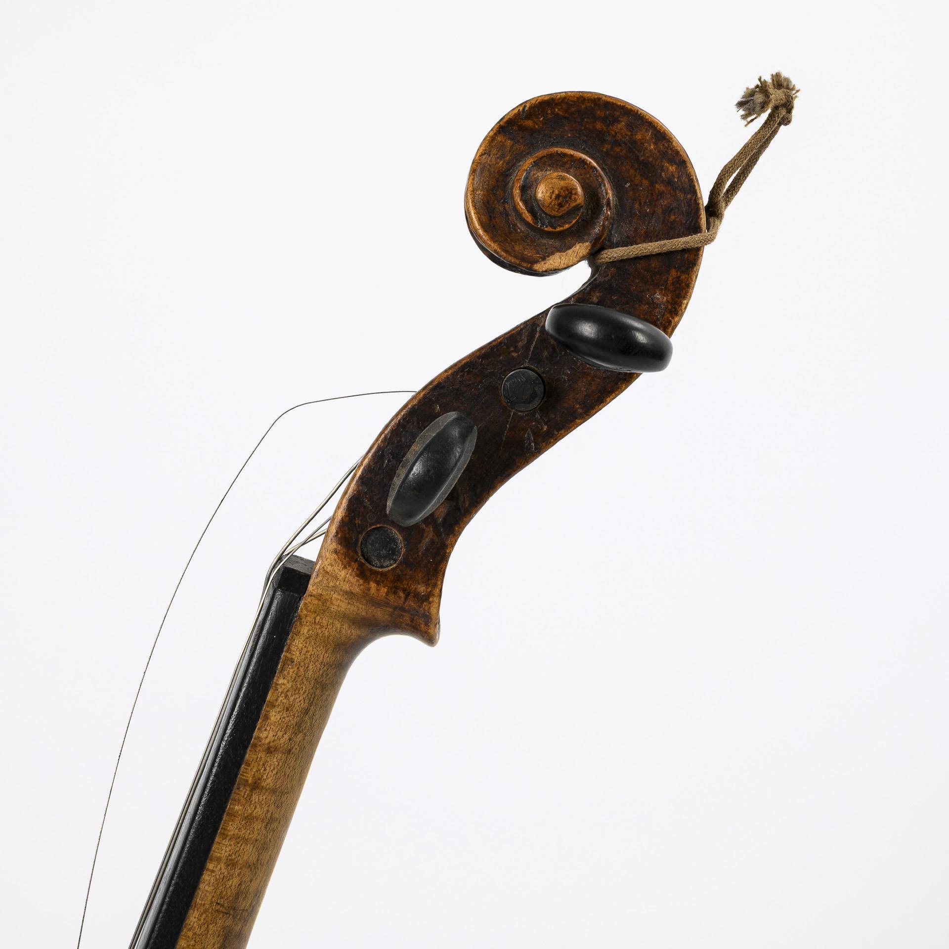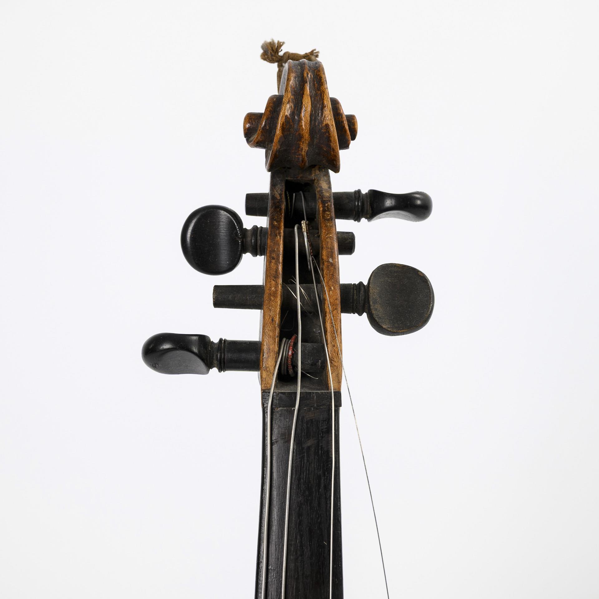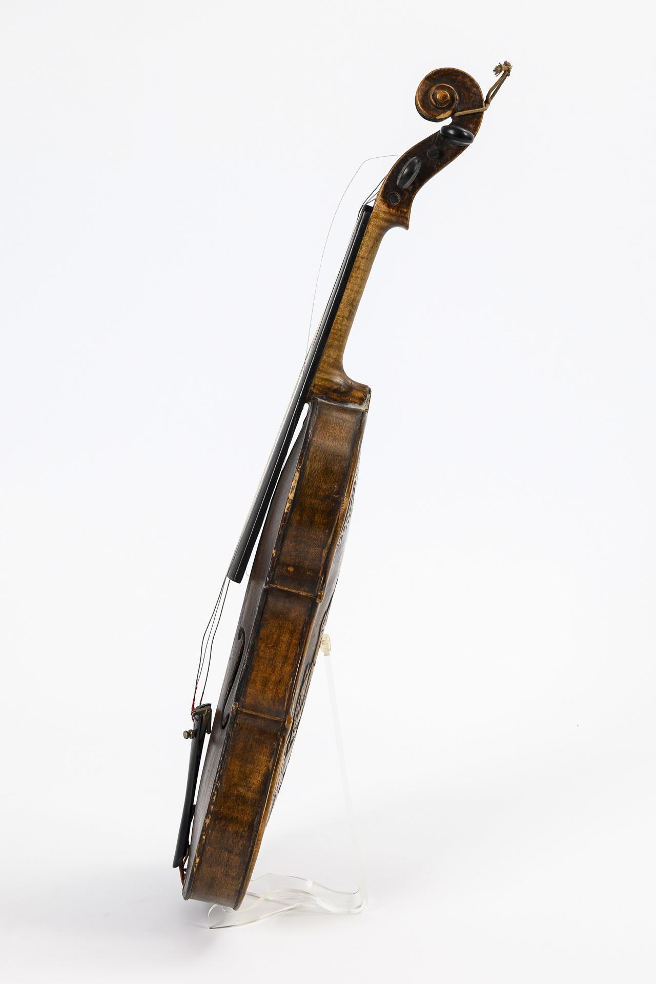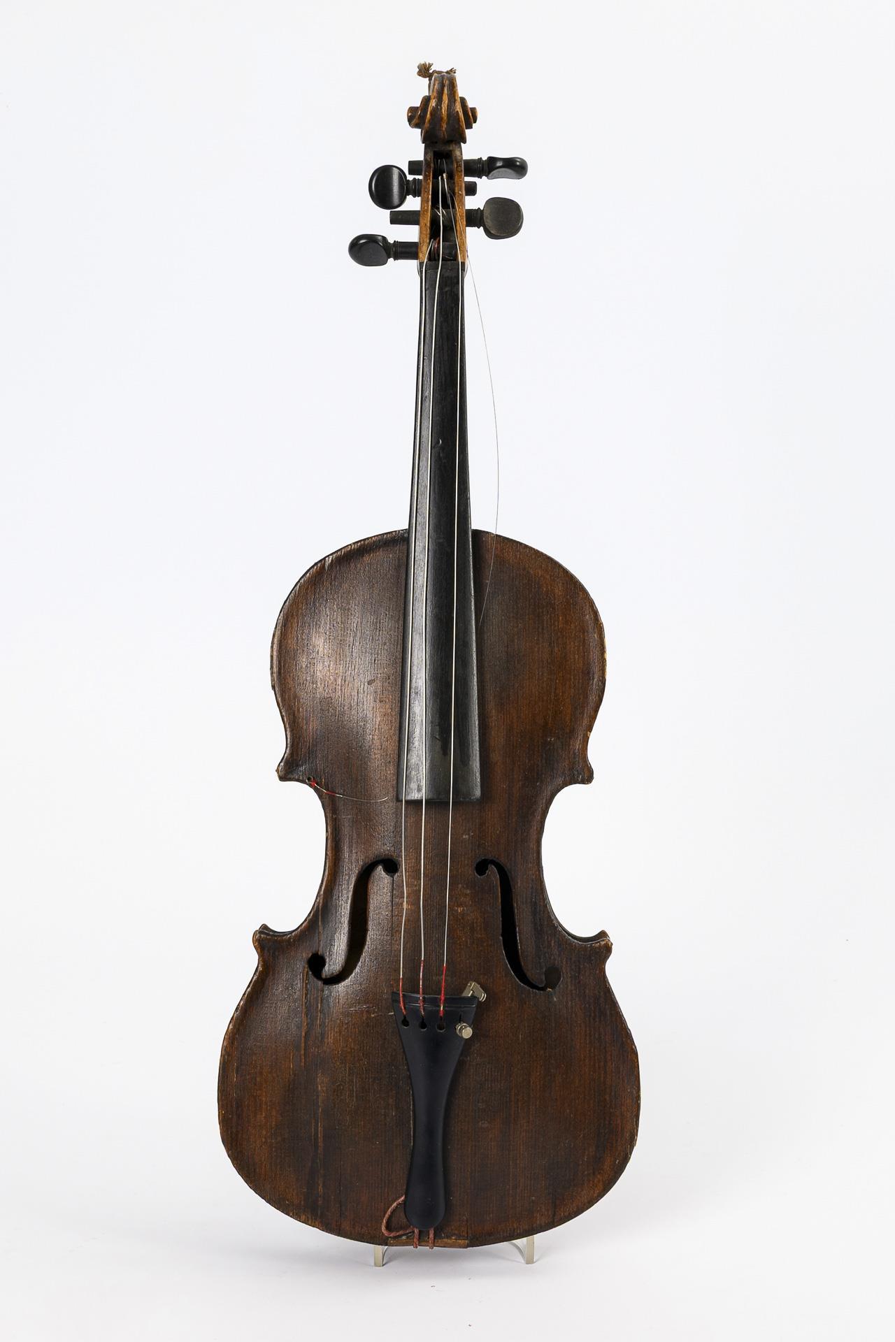 Violine restaurierungsbedürftig (Zarge und Decke mehrfach gerissen, Untersattel alt ergänzt, Schaftansatz alt geklebt, Haarrisse und kleiner Ausbruch am Wirbelkasten).