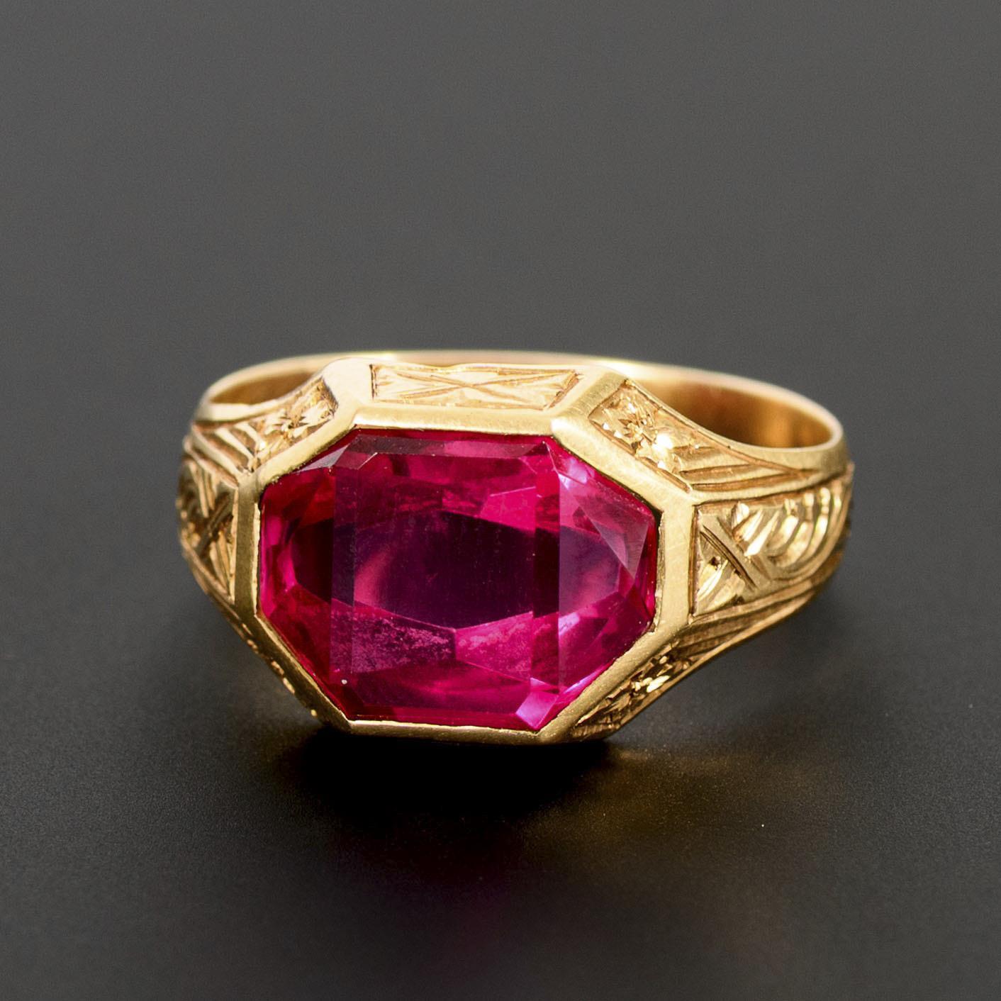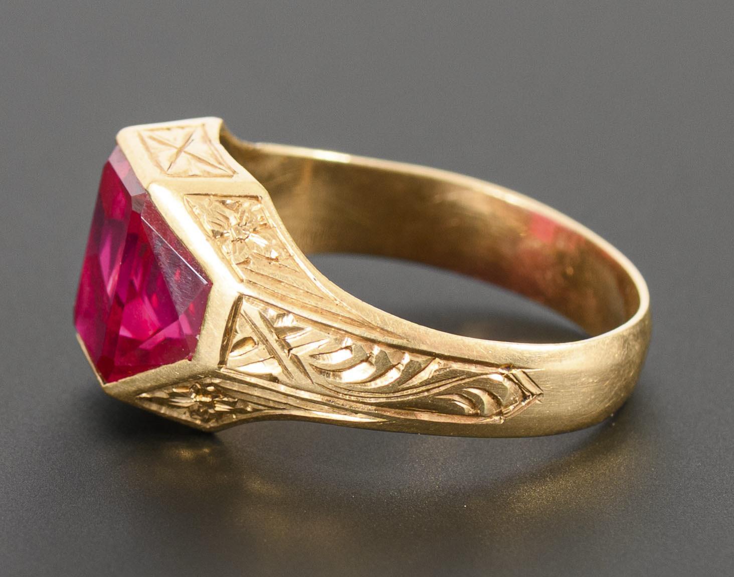 Außergewöhlicher Ring wohl mit kirschroter Spinell-Synthese in einem Fantasie-Schliff, umgeben von vegetabilen Gravuren.