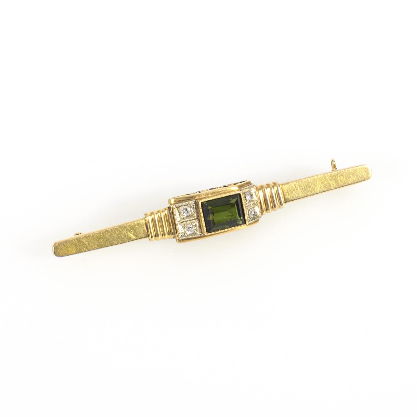 Brosche mit grünem Farbstein, wohl Turmalin, und Diamanten.