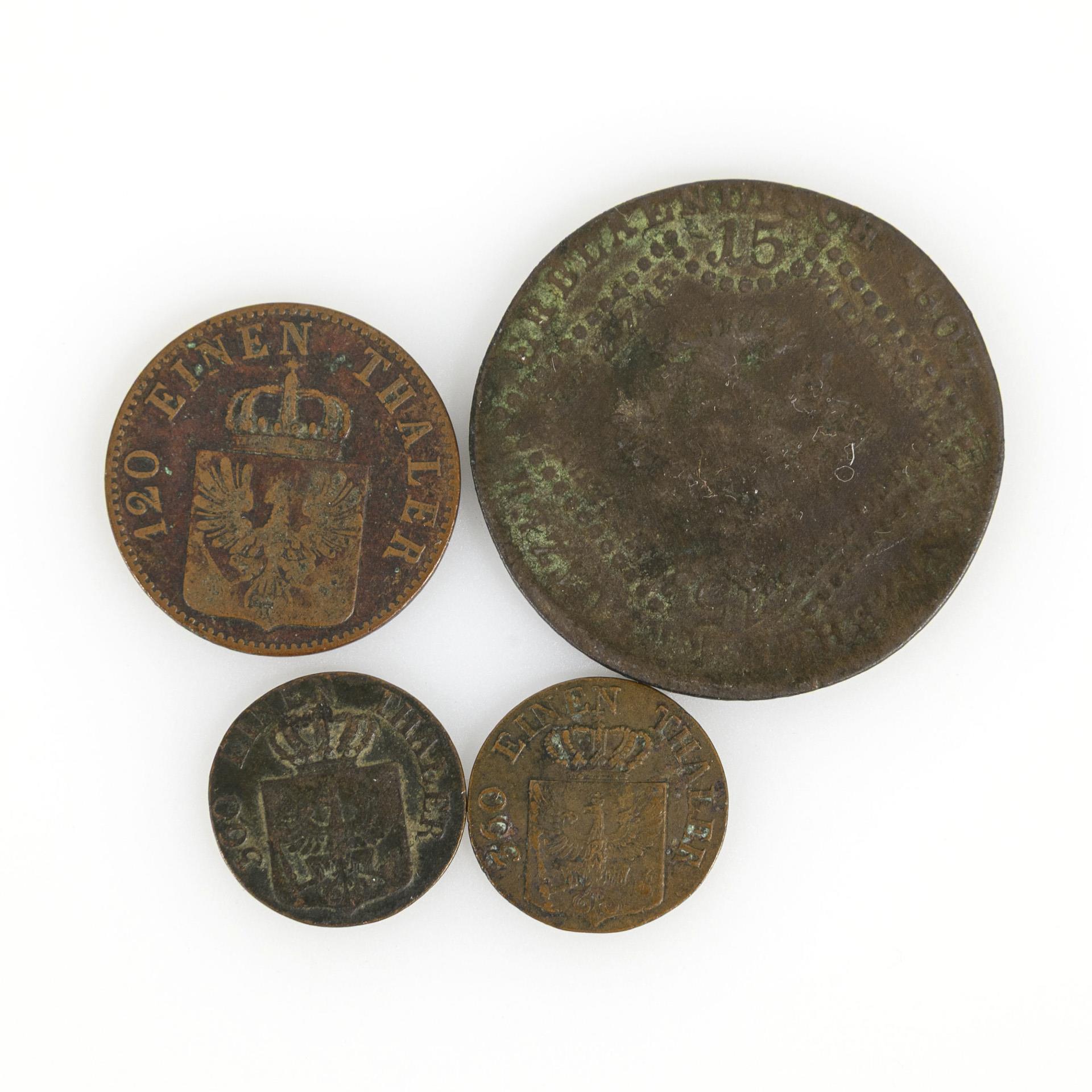 15 Kreuzer, 1807, Franz II.(I.) 1792-1835, stark abgegriffen. / "120 Einen Thaler", "Scheide Münze 3 Pfenninge (!) 1851", Münzort A, Preußen unter Friedrich Wilhelm IV. / "360 Einen Thaler", "Scheide Münze 1 Pfenning 1852". Münzort A, Preußen unter Friedrich Wilhelm IV. / wie vorher 1822, unter Friedrich Wilhelm III..
