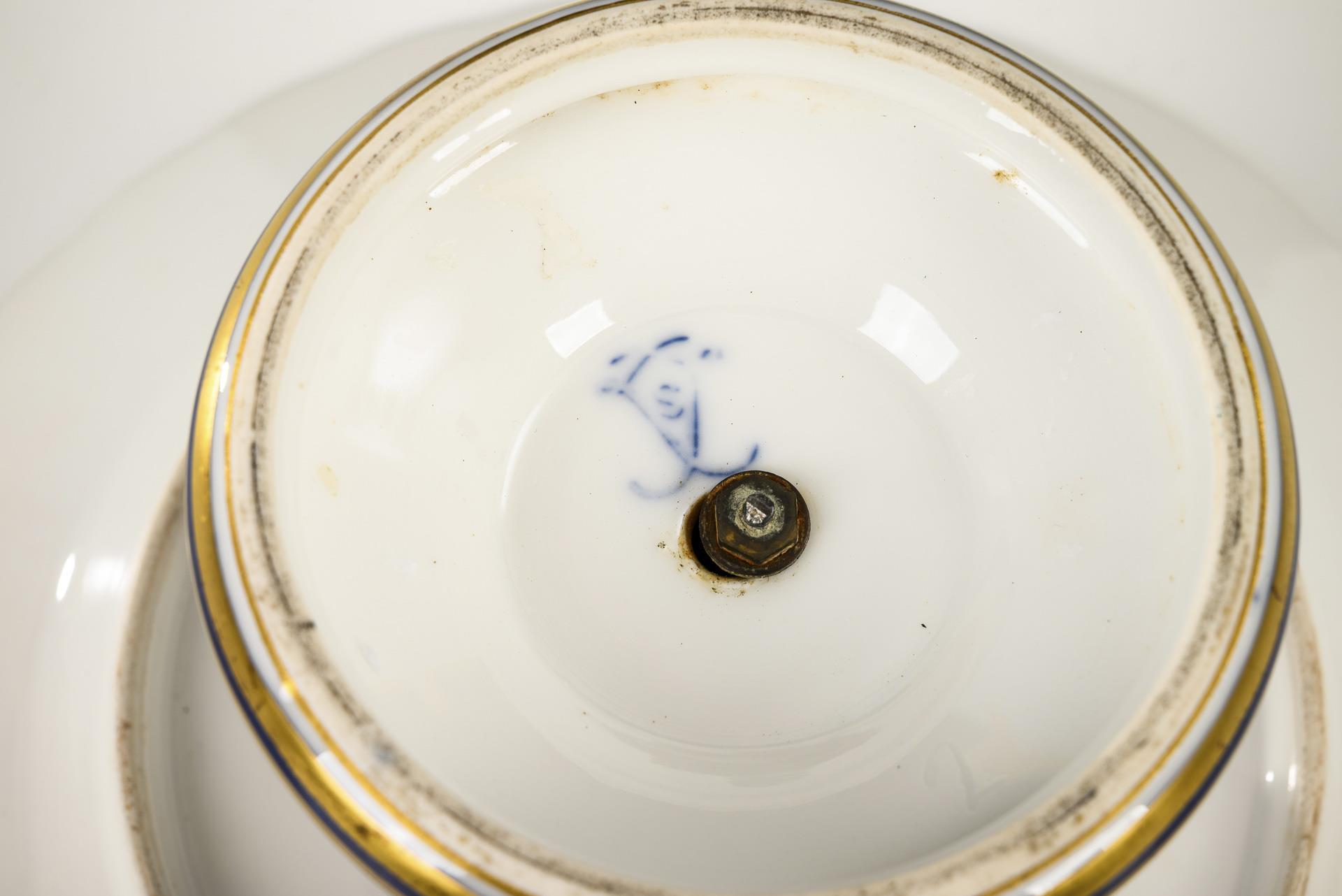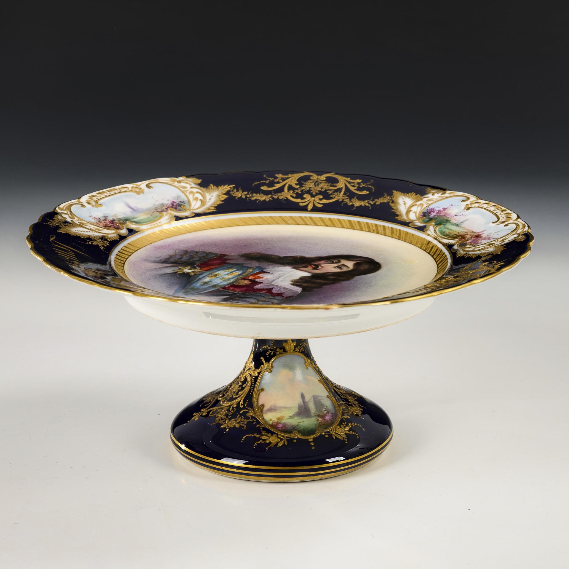 Passiger Teller auf Rundfuß. Im Spiegel das bezeichnete Bildnis König Ludwig XIII. von Frankreich (1601-1643). Fahne und Fuß mit floraler Goldreliefmalerei auf Kobaltfond sowie Rocailleschildern mit Landschaftsdarstellungen.
