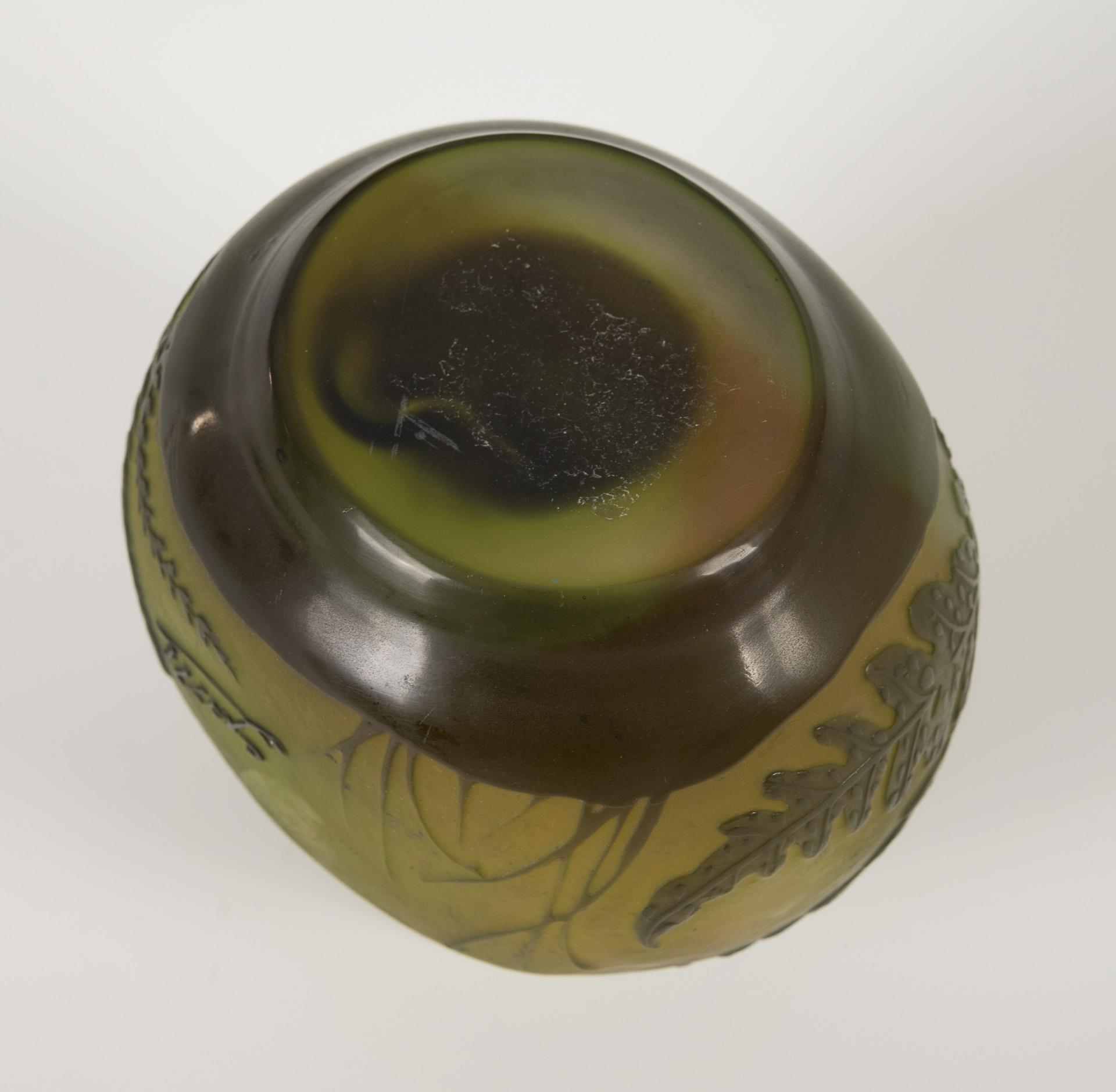 Leicht geplattete Kugelbauchvase mit zylindrischem Hals, ausgekugelter Abriss. Schauseitig eine geätzte Farnpflanze.