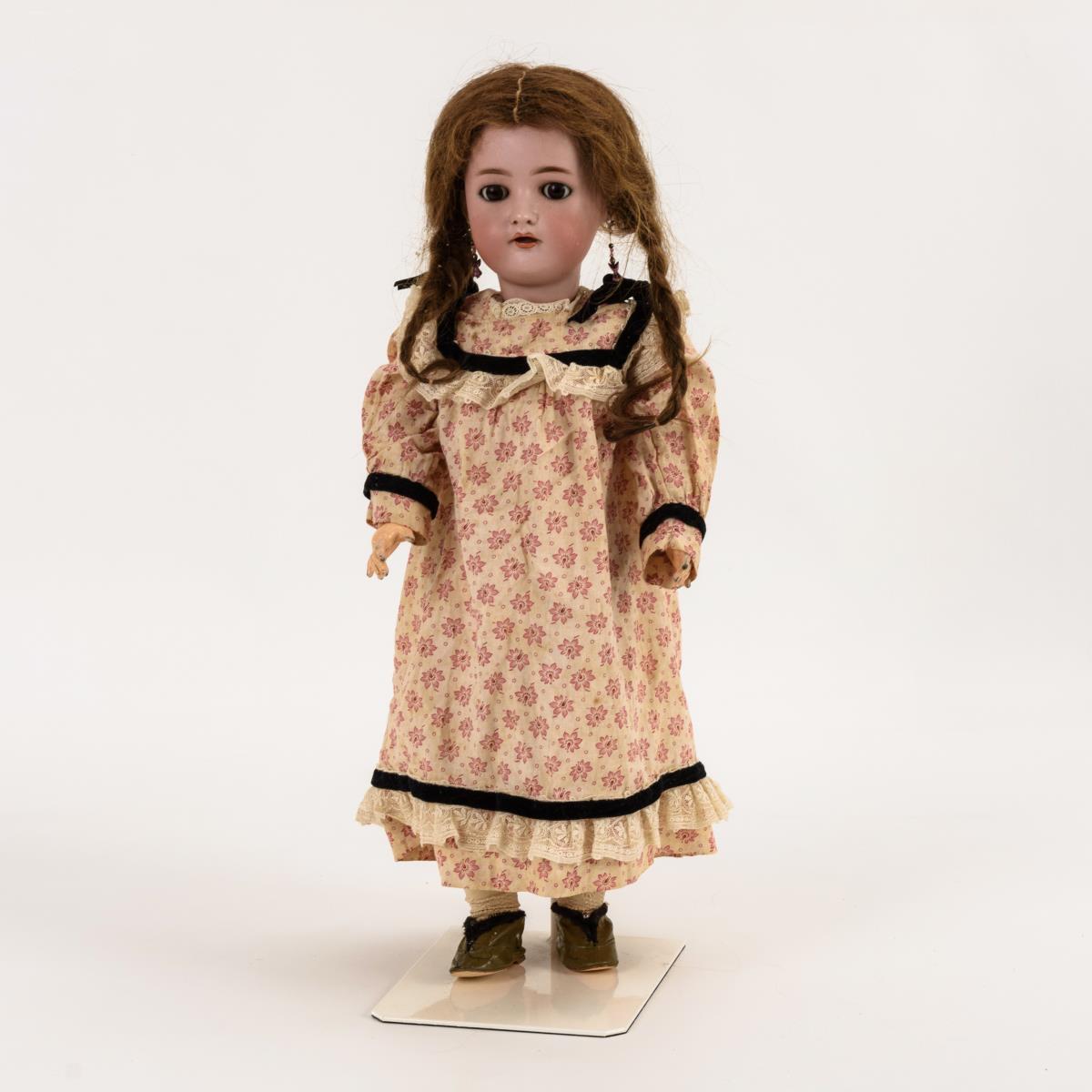 Kurbelkopf, braune Schlafaugen, offener Mund mit Zahnreihe, Ohrringe, braune Echthaarperücke mit Zöpfen. 15-teiliger Gliederkörper mit rotem Stempel "Germany 3 1/2". Helles Kleid mit rotem Blütendruck, alte grüne Wachstuchschuhe. Bestoßenes linkes Ohr mit Branddefekt.