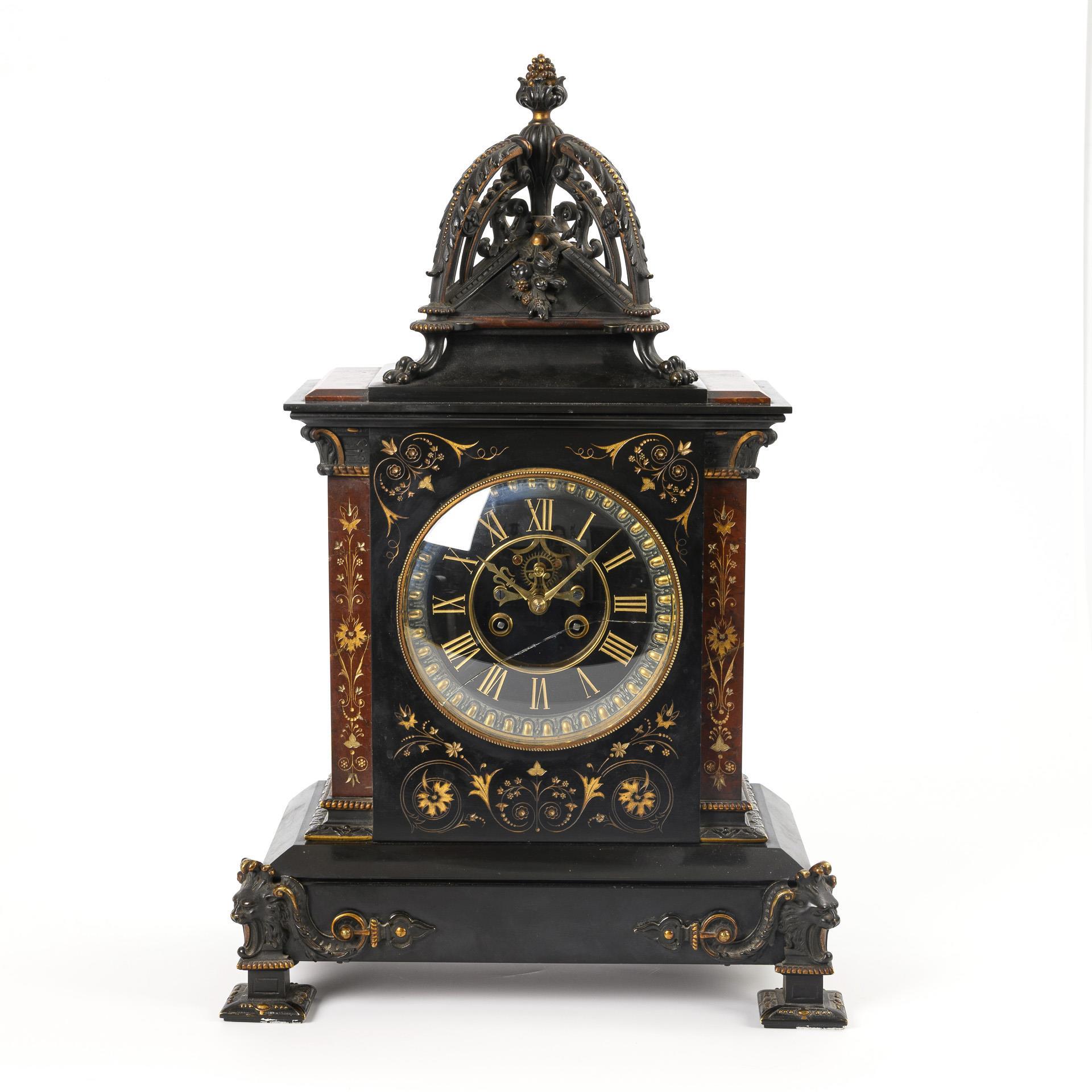 Architektonisches Gehäuse mit durchbrochenem und zapfenbekröntem Kuppeldach, floraler Kerbzier und teilplastischem historistischen Dekor, auf breitem Sockel mit 4 abgesetzten Podestfüßen. Dachplatten und Frontverglasung sind gesprungen, Fronttür nicht schließend, Marmor partiell bestoßen.