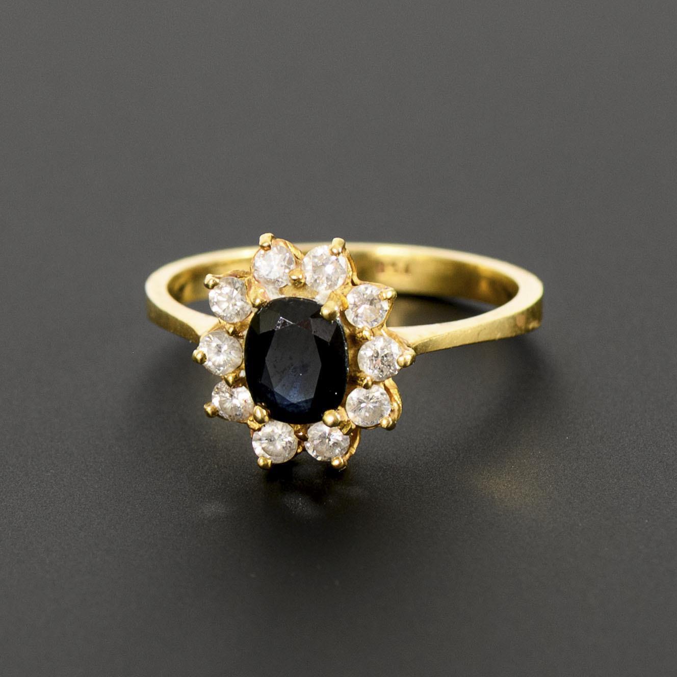 Entourage-Ring in klassischer Gestaltung in Anlehnung nach dem berühmten Vorbild, mit einem blauen Farbstein, wohl Saphir, umgeben von 10 chatongefassten Brillanten. Unterseitig mit leichten Tragespuren.