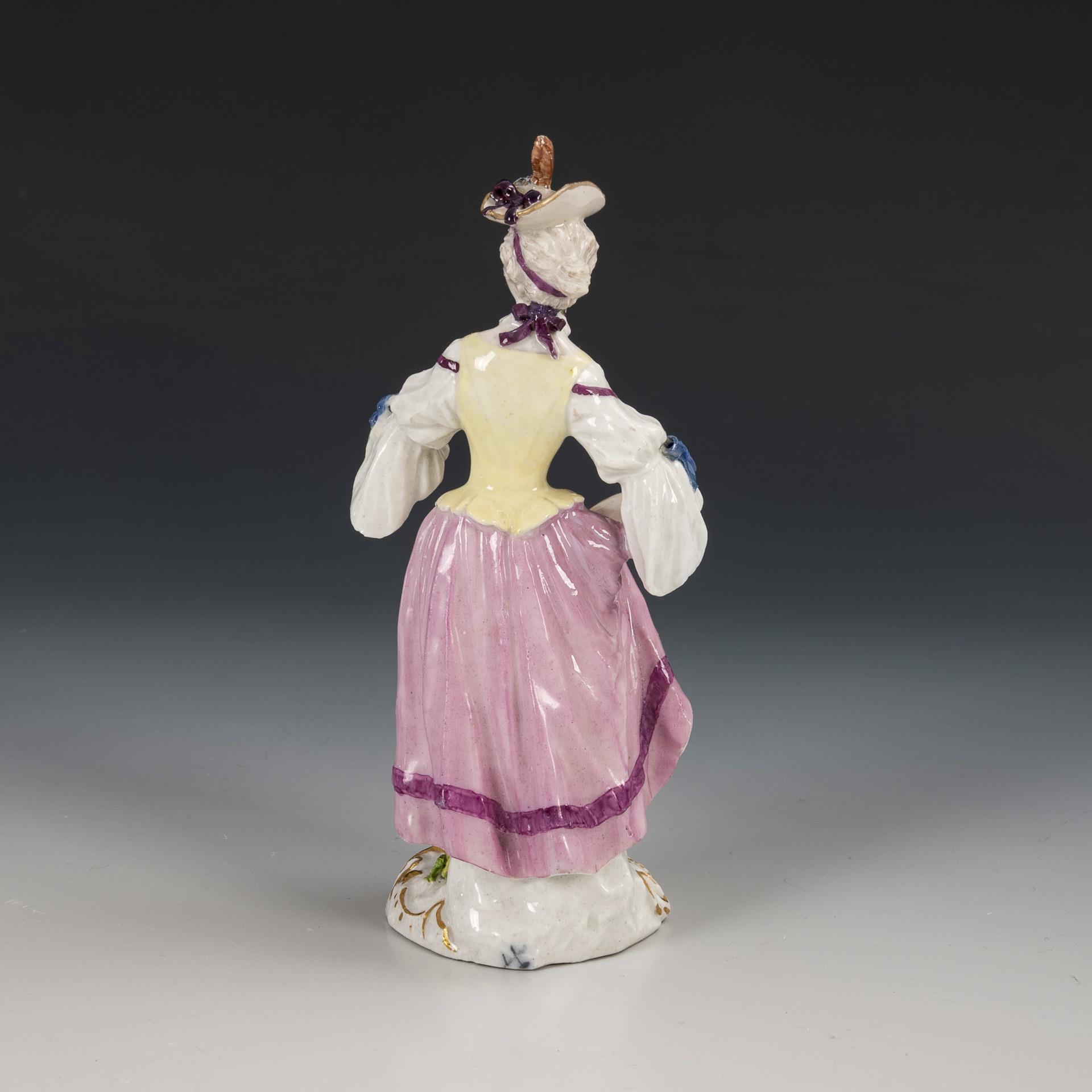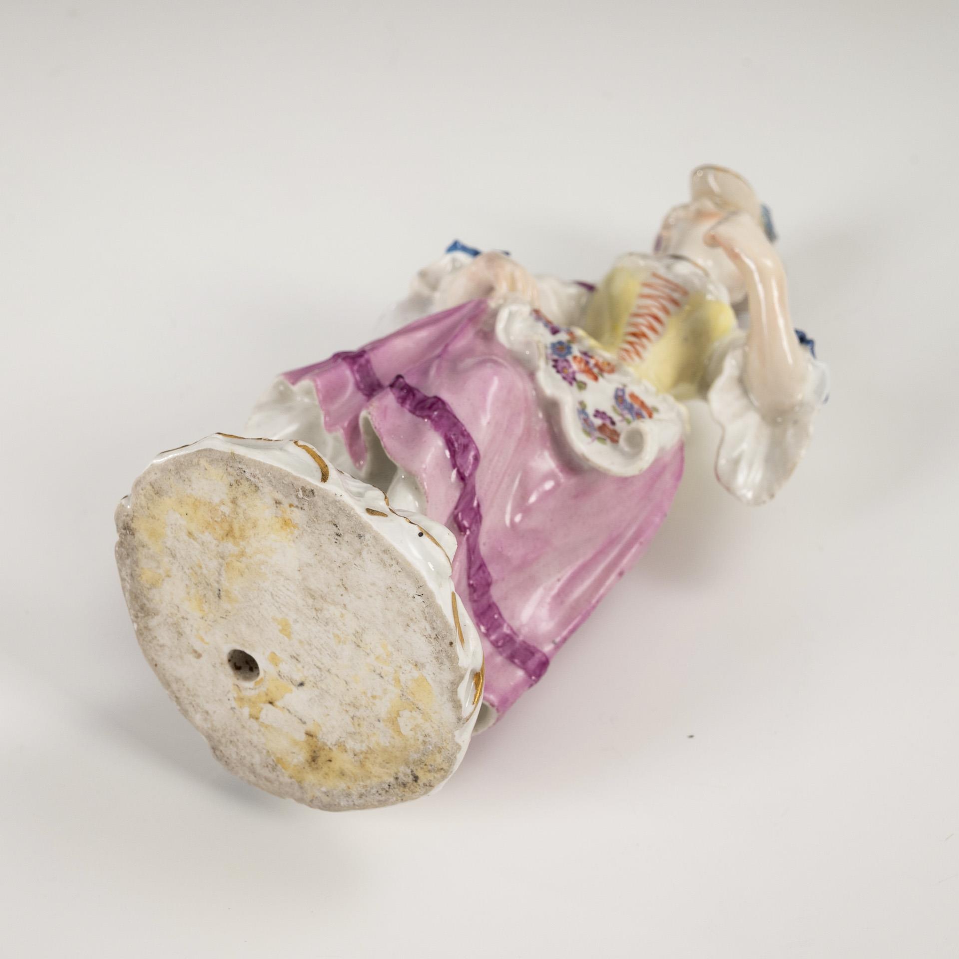 Auf einem Rocaillesockel stehende Rokokodame. Notenblatt fehlt, beide Hände, Oberkörper, Hals und Kopf mit Hut restauriert.
