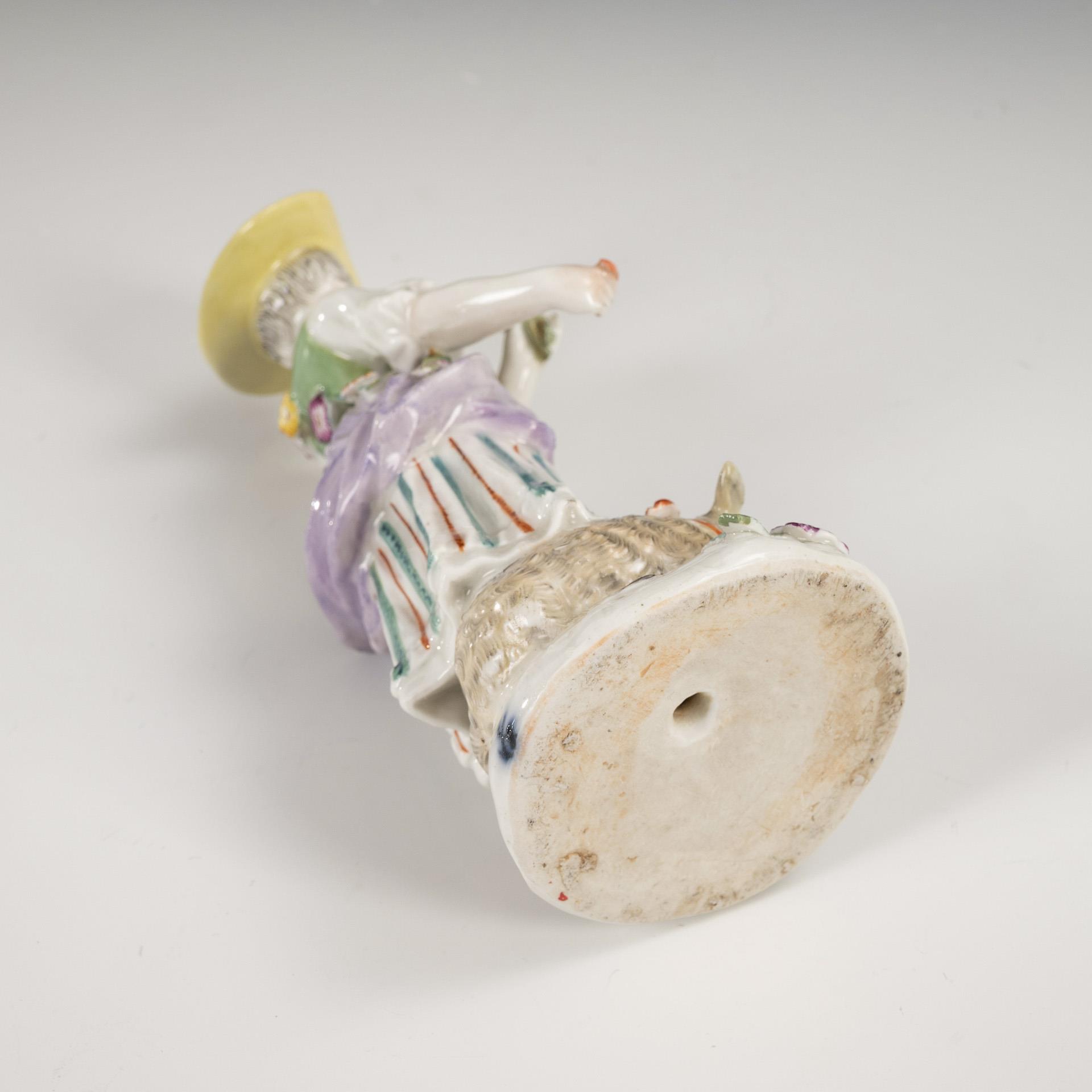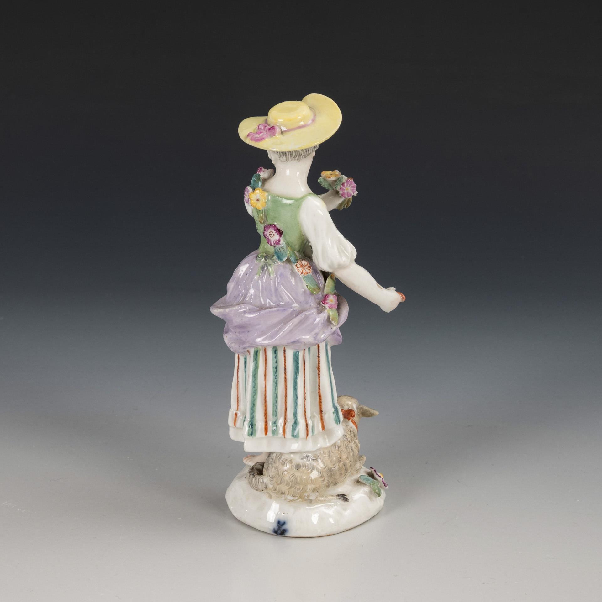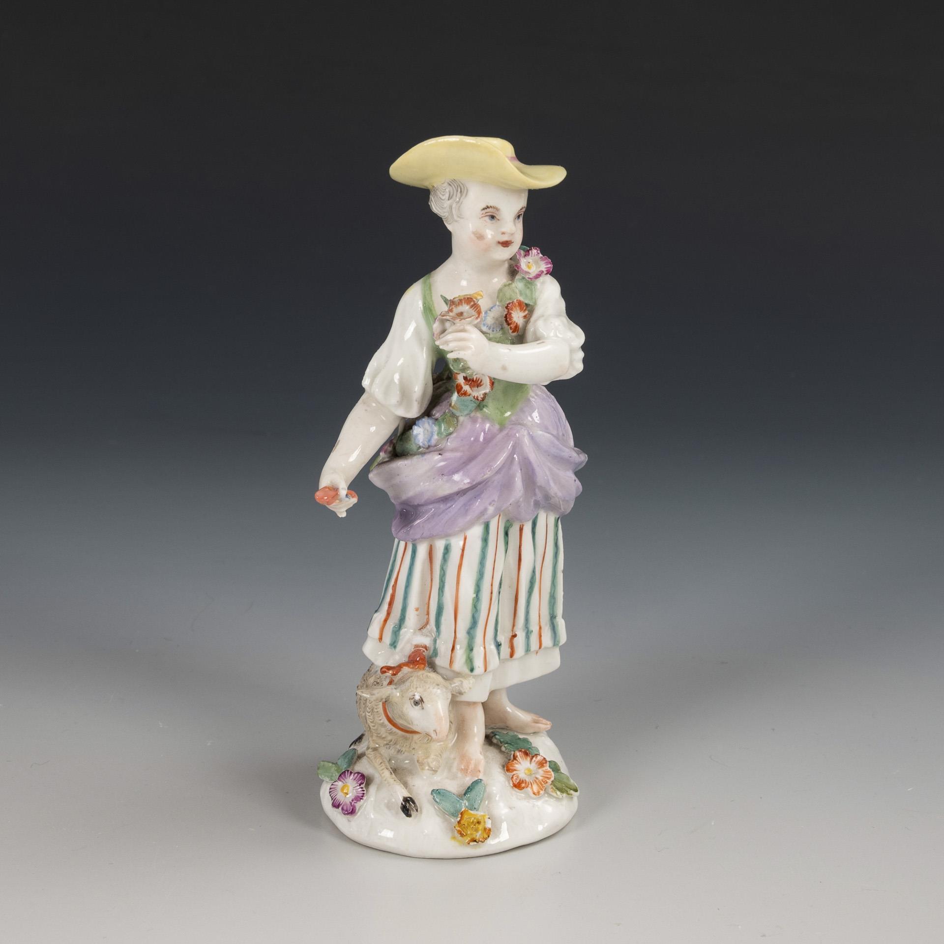 Auf einem blütenbelegten Sockel stehendes Mädchen, zu ihren Füßen ein Lamm mit Schleife liegend. Rechtes Schafohr und Hut restauriert.