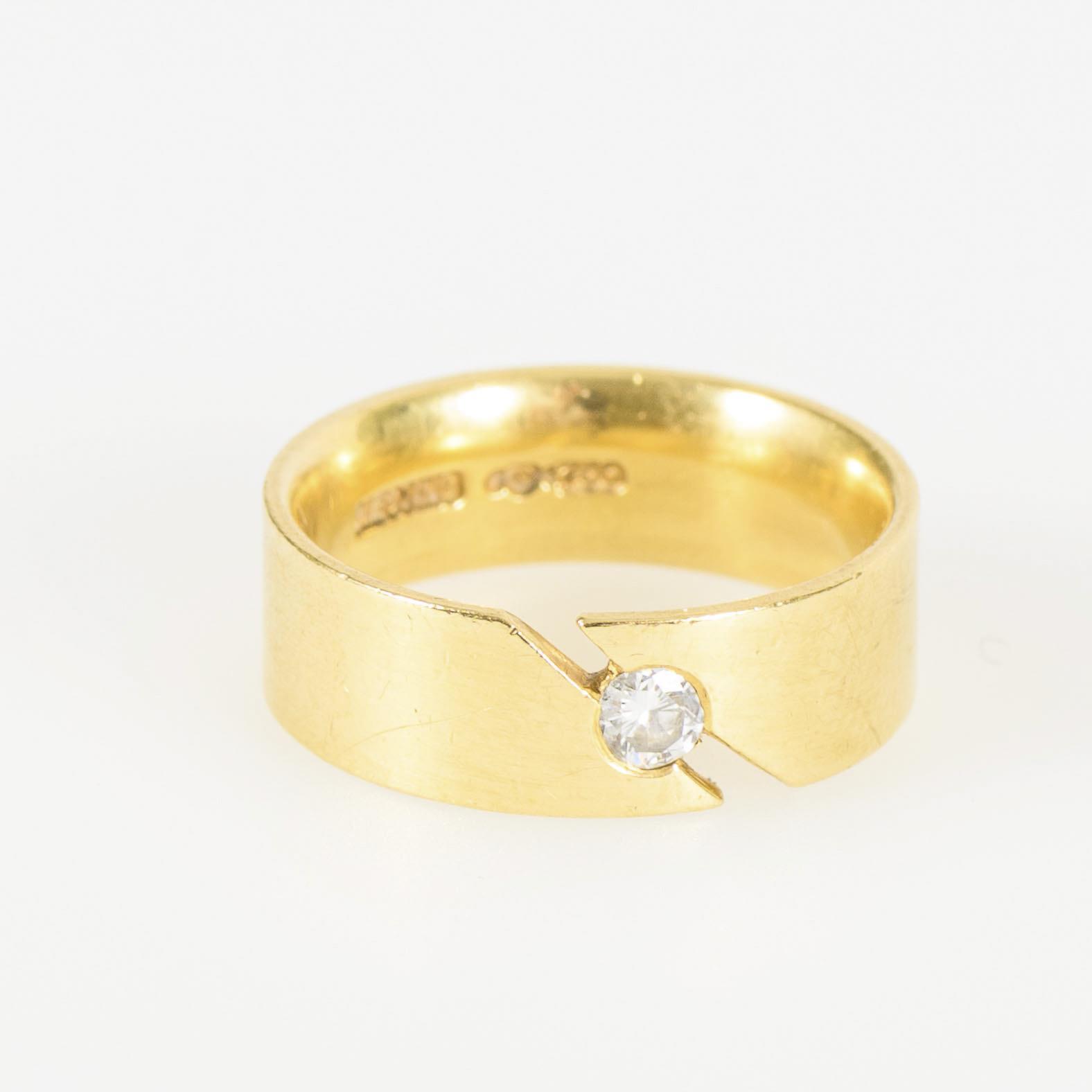 Ring mit zargengefasstem Brillant-Solitär zwischen einer angeschrägt teilgeöffneten Schiene. Tragespuren, Stein minimal gelockert, hält sicher in der Fassung.