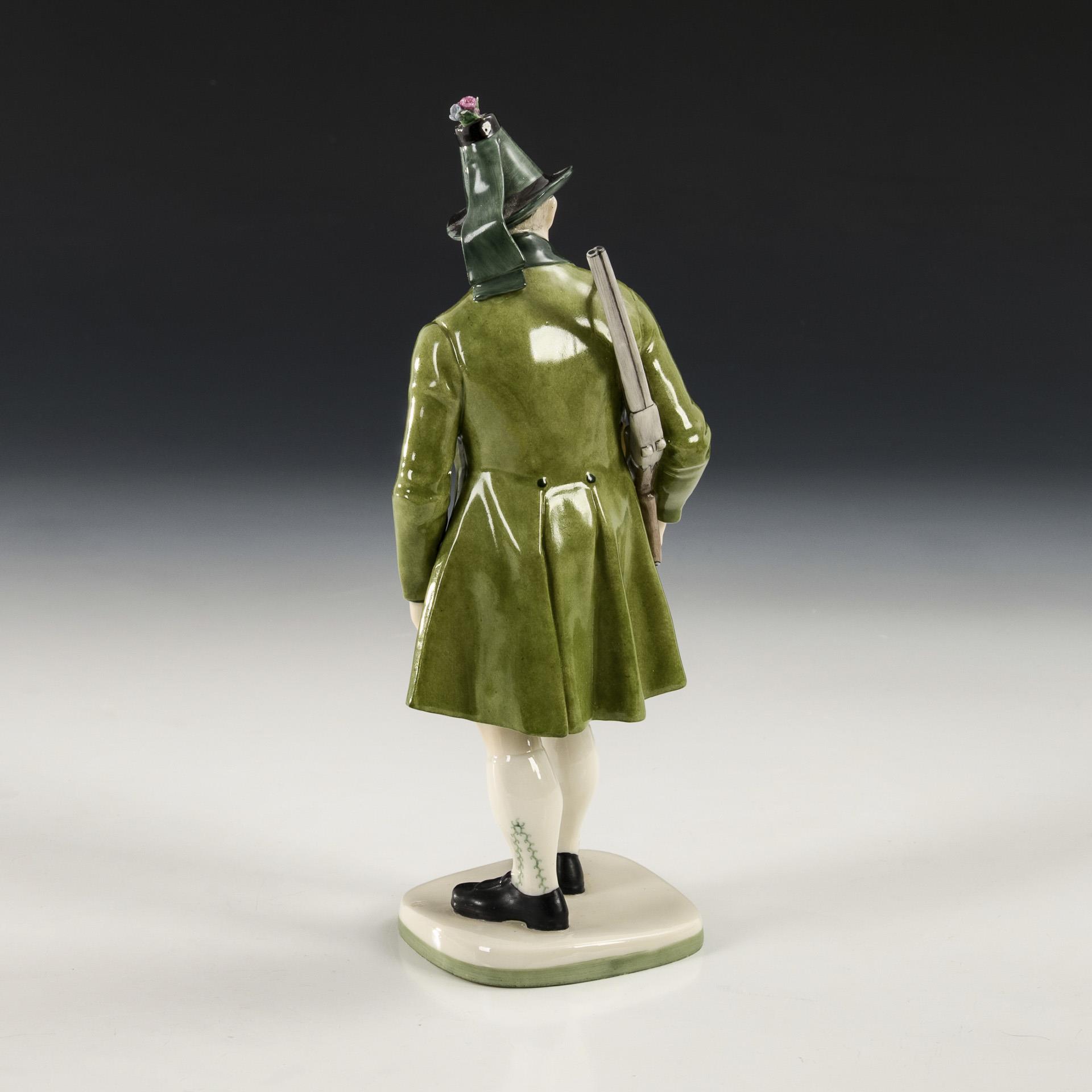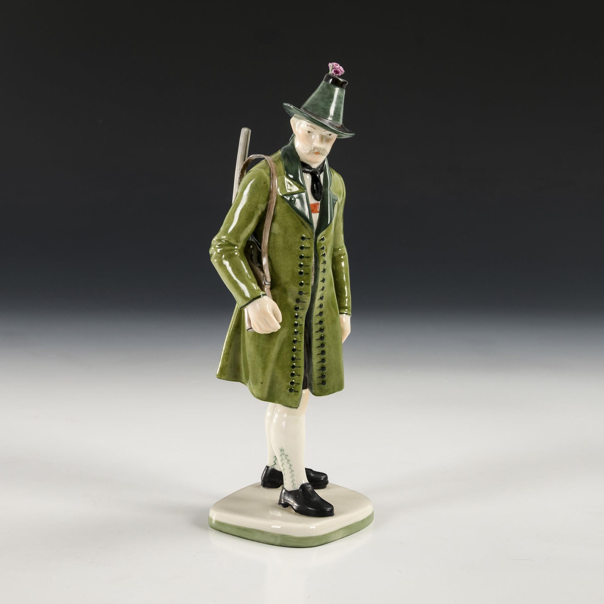 Tiroler Schütze mit grünem Rock, Hut und Gewehr. Blätter am Hutschmuck bestoßen.