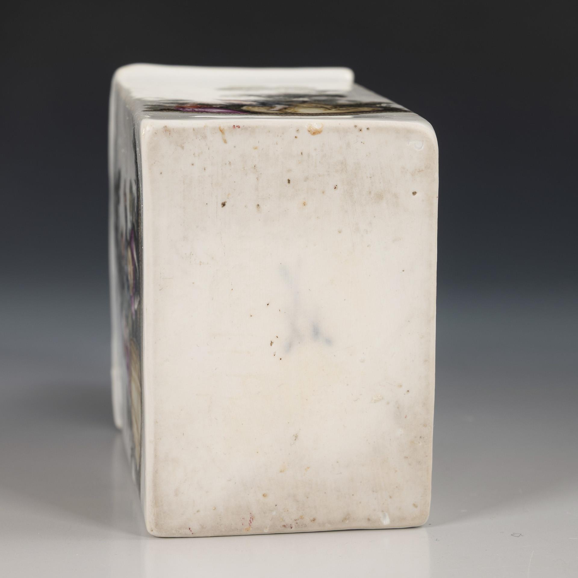 Rechteckige Dose mit Rosenknaufdeckel. Allseitig die Darstellung kleiner Landschaftsinseln mit galanten Paaren und Rokokofiguren. Rosenknauf restauriert.