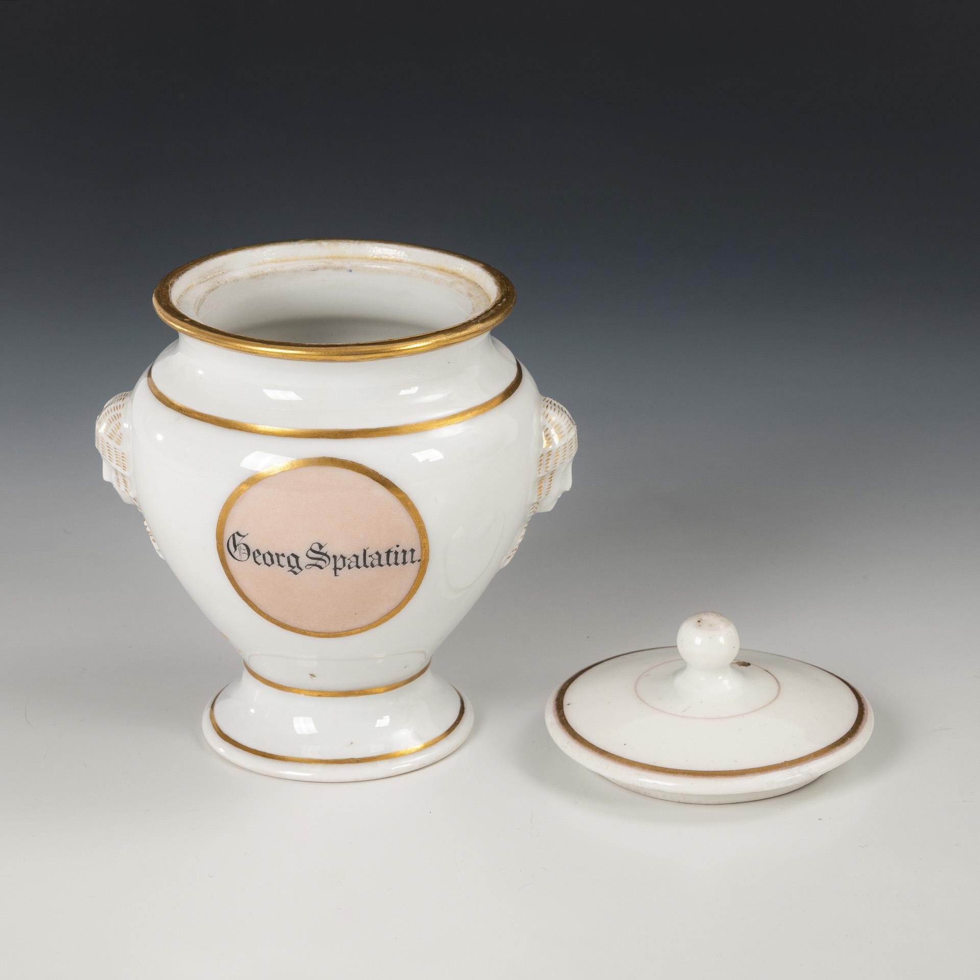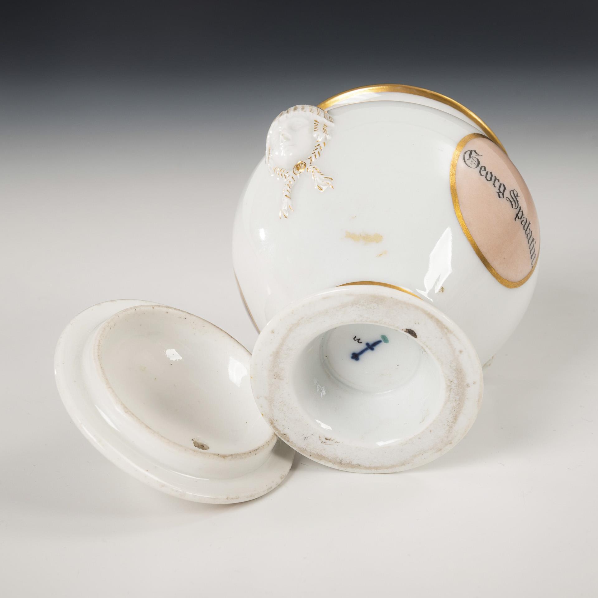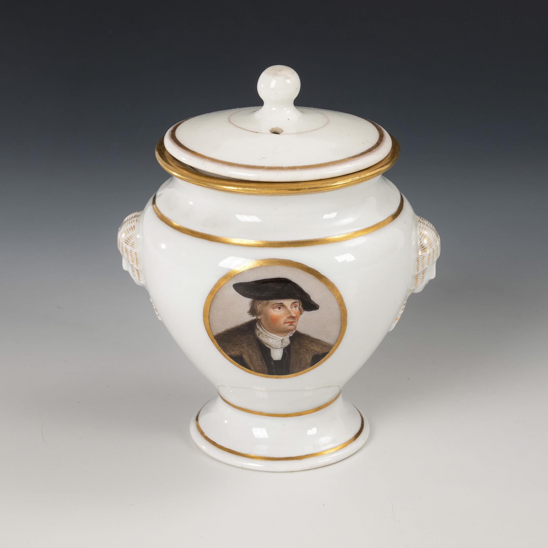 Balusterdose mit zwei Maskaronhandhaben und ergänztem Knaufdeckel. Schauseitig ein Medaillon mit dem Bildnis des Reformators Georg Spalatin (1484-1545), verso bezeichnet.