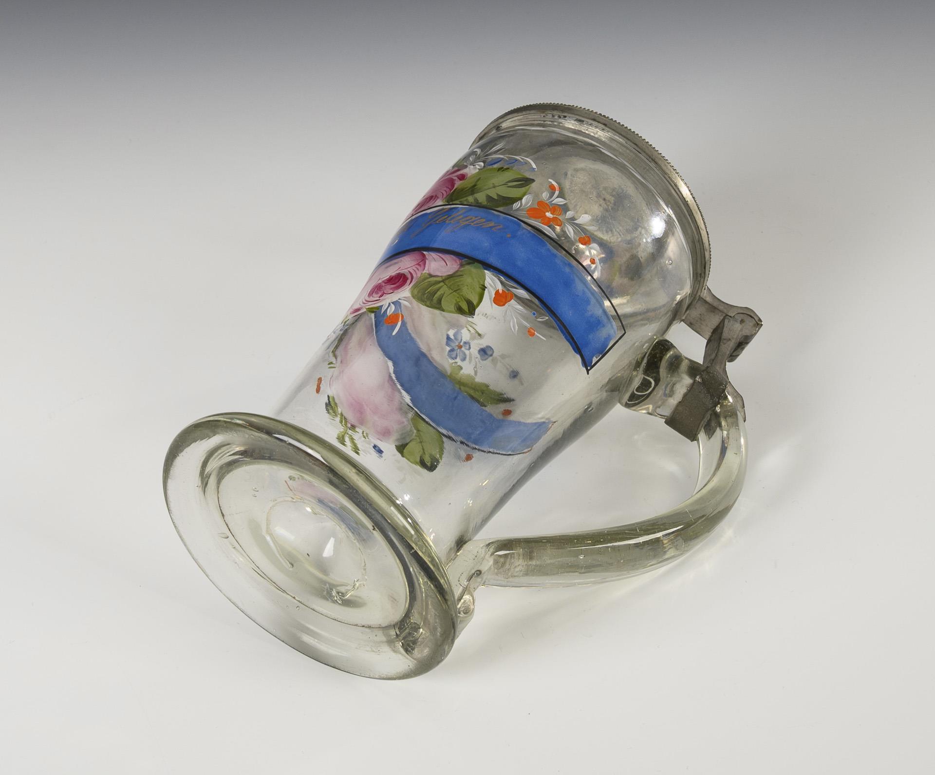 Sich nach oben hin leicht weitender Korpus, ausgestellter Stand, Bandhenkel und zinnmontierter Scharnierdeckel mit der Gravur "18 F W 61."; Abriss. Zwischen Rosen- und Vergissmeinnichtblüten ein blaues Schriftband mit der Aufschrift "An Gottes Segen ist alles gelegen".