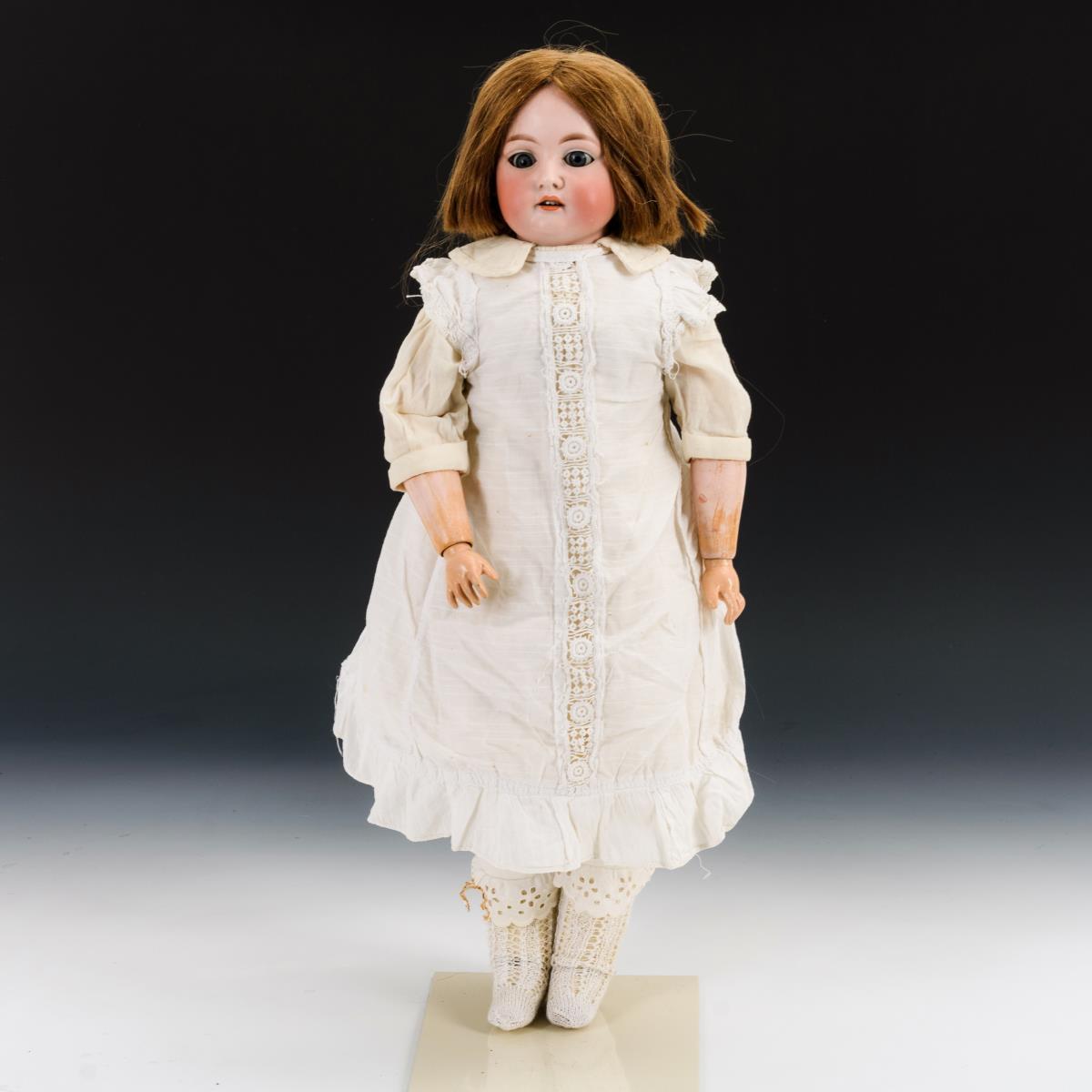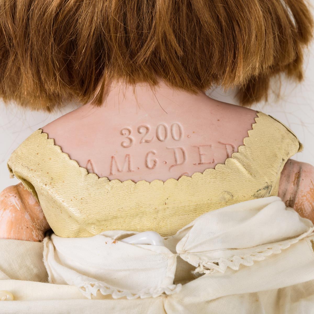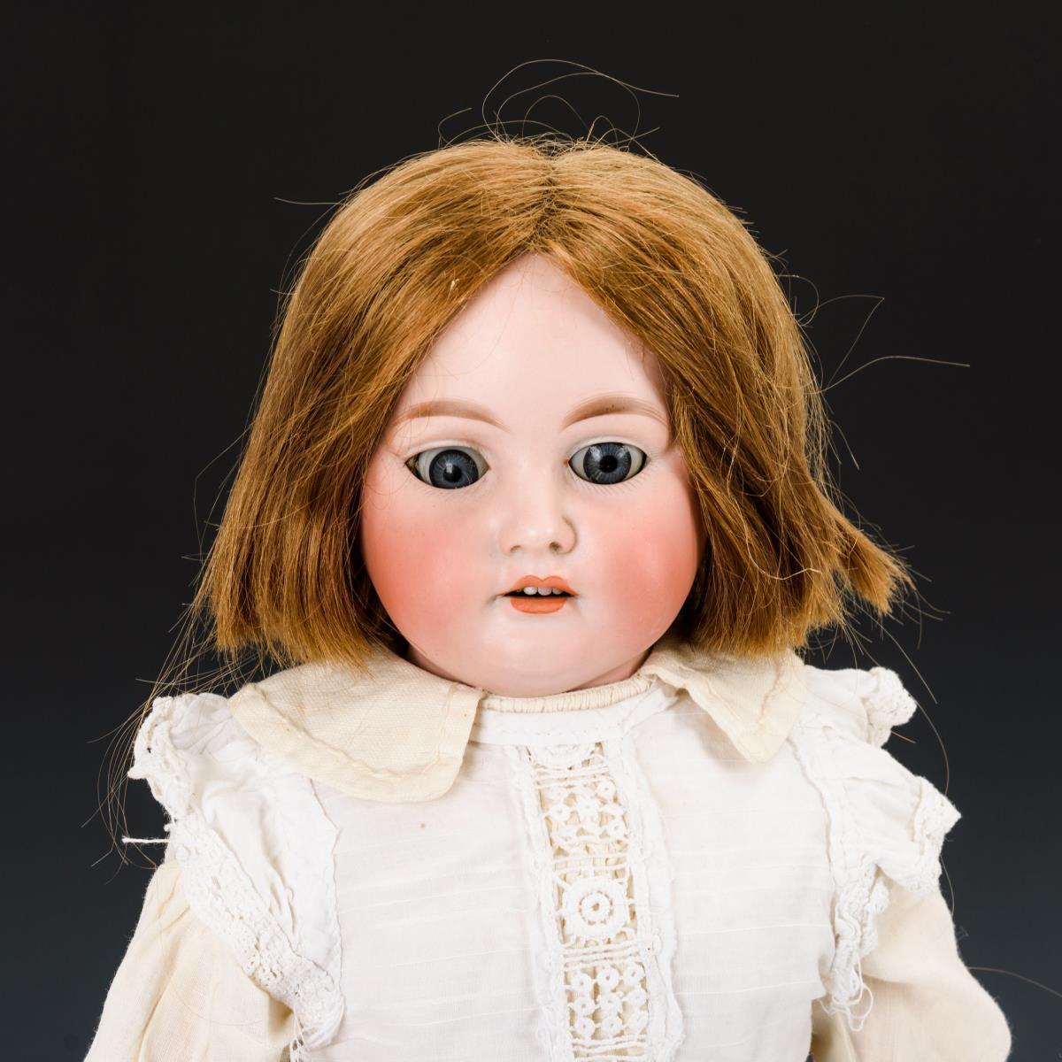 Brustkopf, blaue Schlafaugen, offener Mund mit Zahnreihe, rotblonde Echthaarperücke. Wachstuchkörper mit Gliederarmen. Weißes Kleid. Länglicher Chip/Abplatzer an der Kopfkrone, ohne Lider, 1 Hand übermalt.