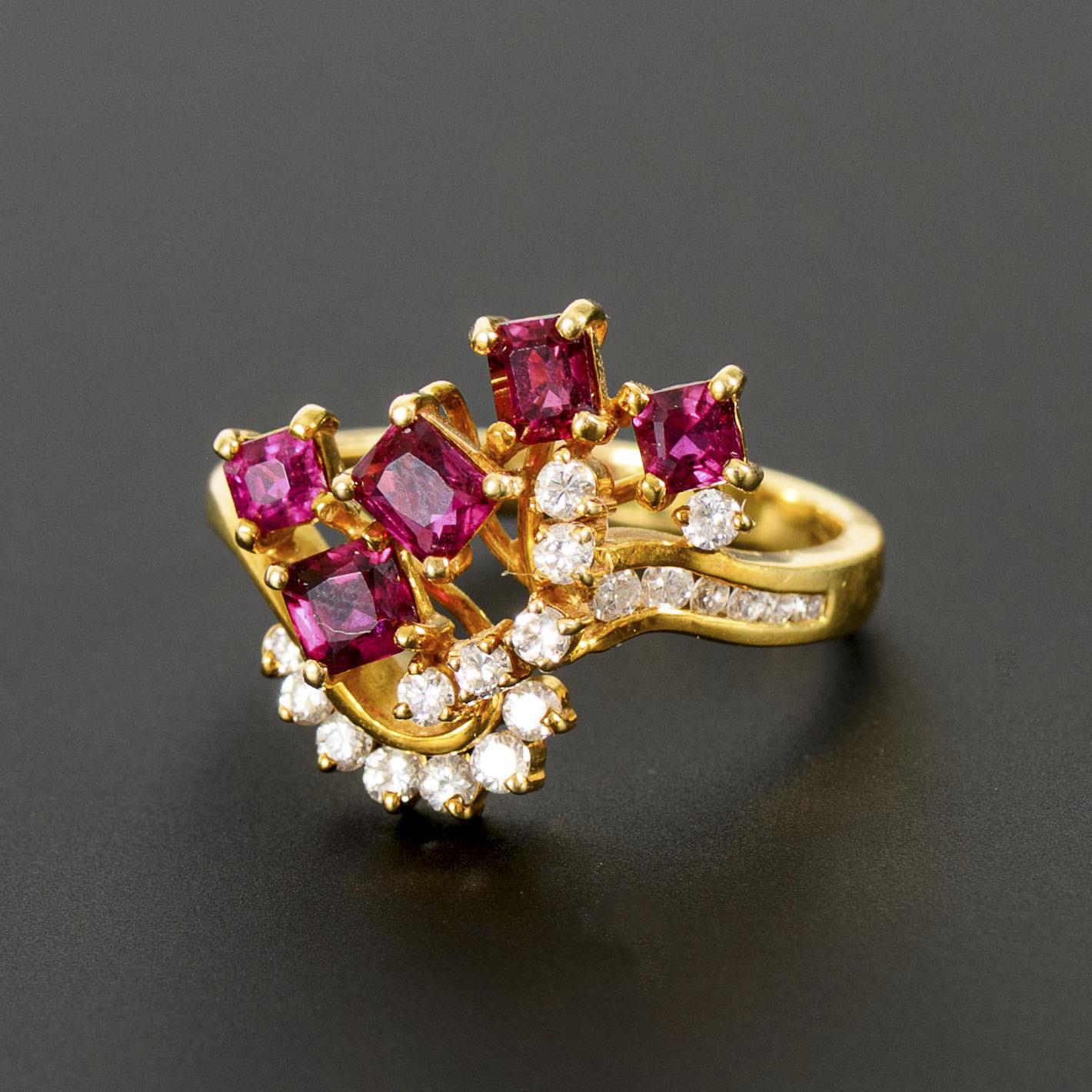 Ring in abstrakt-asymmetrischer Gestaltung mit fünf roten Farbstein-Carrés, wohl Rubine, und Brillanten.