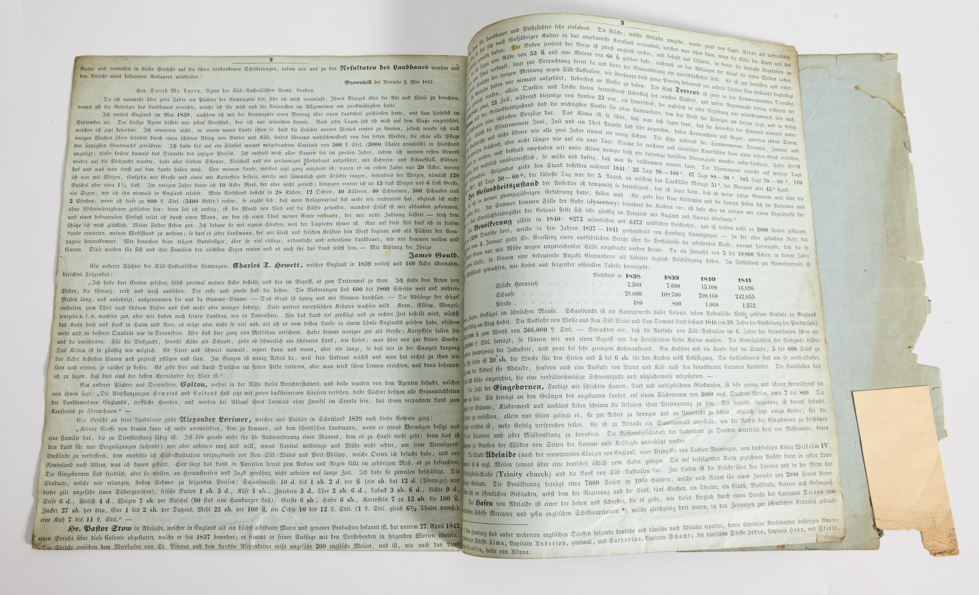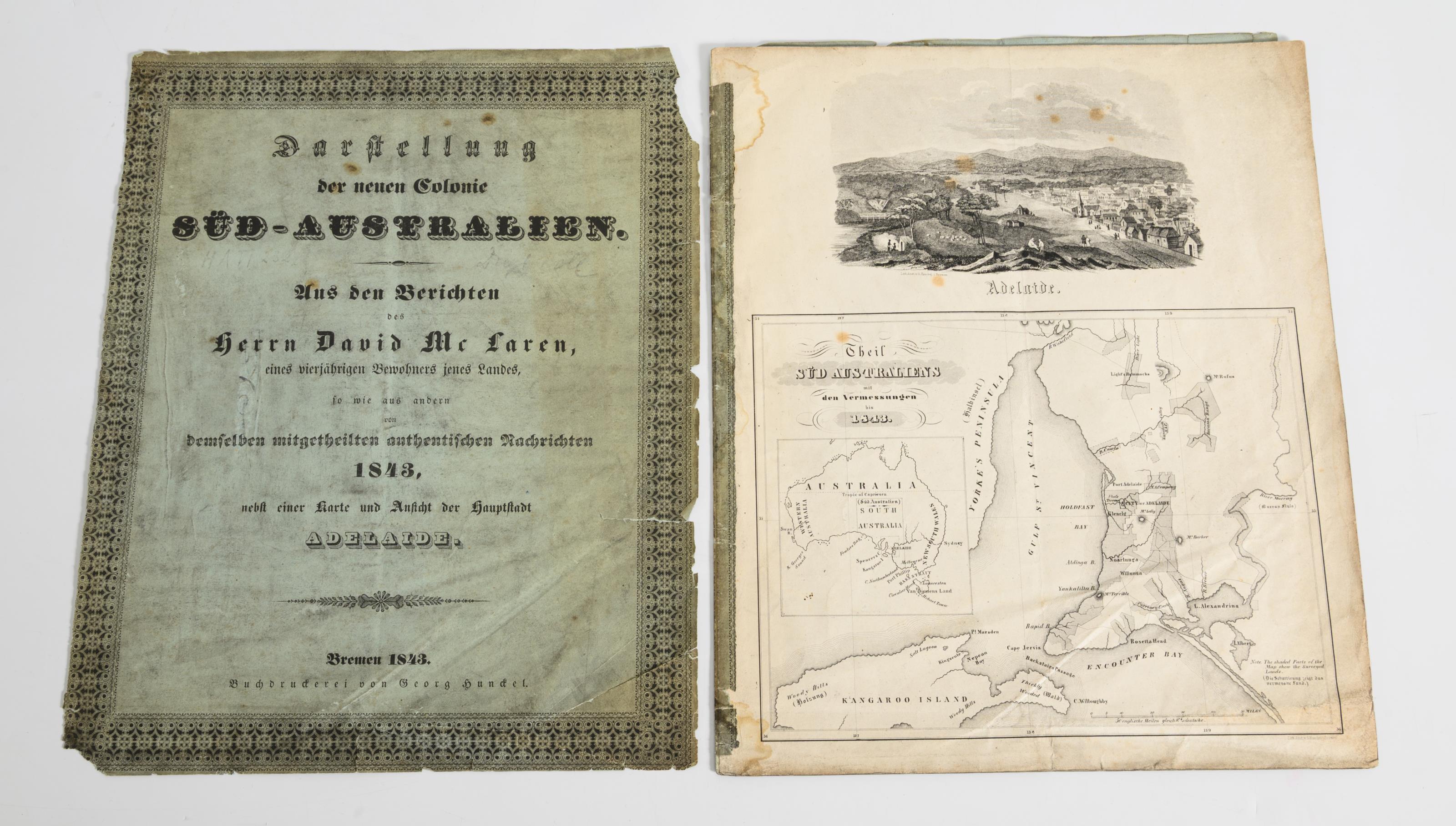 Kupferstich. Nach Bellin, London. Dazu Reste der Publikation "Darstellung der neuen Colonie Süd-Australien. Aus den Berichten des Herrn David McLaren [...] 1843" mit dem Stahlstich einer Karte von Adelaide. Mittelfalz und Knicke in den Ecken.