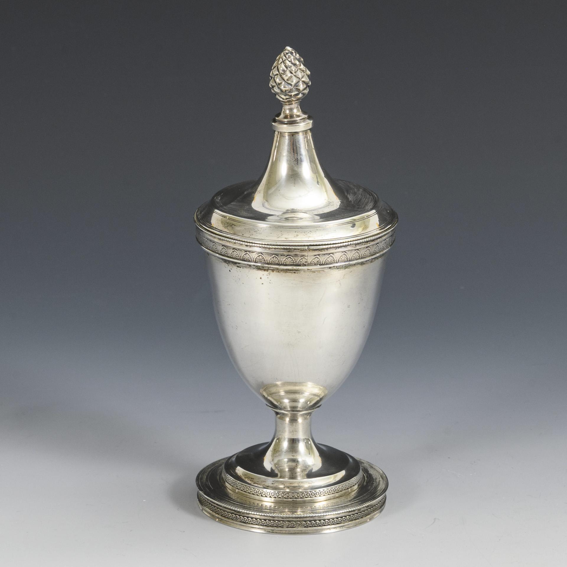 Urnenförmige Empire-Dose mit Zapfenknauf auf dem Steckdeckel. Altersspuren, einige Dellen.