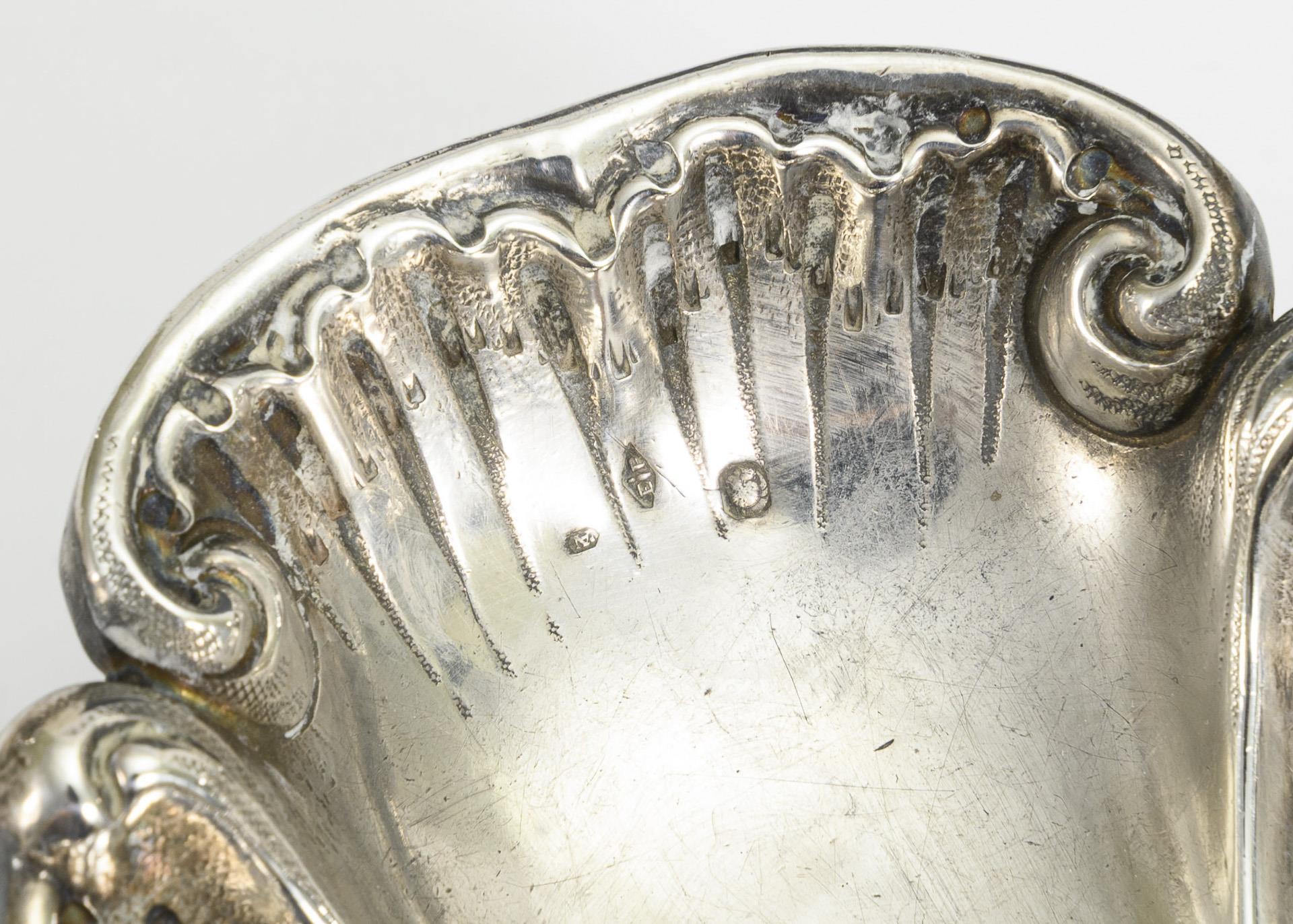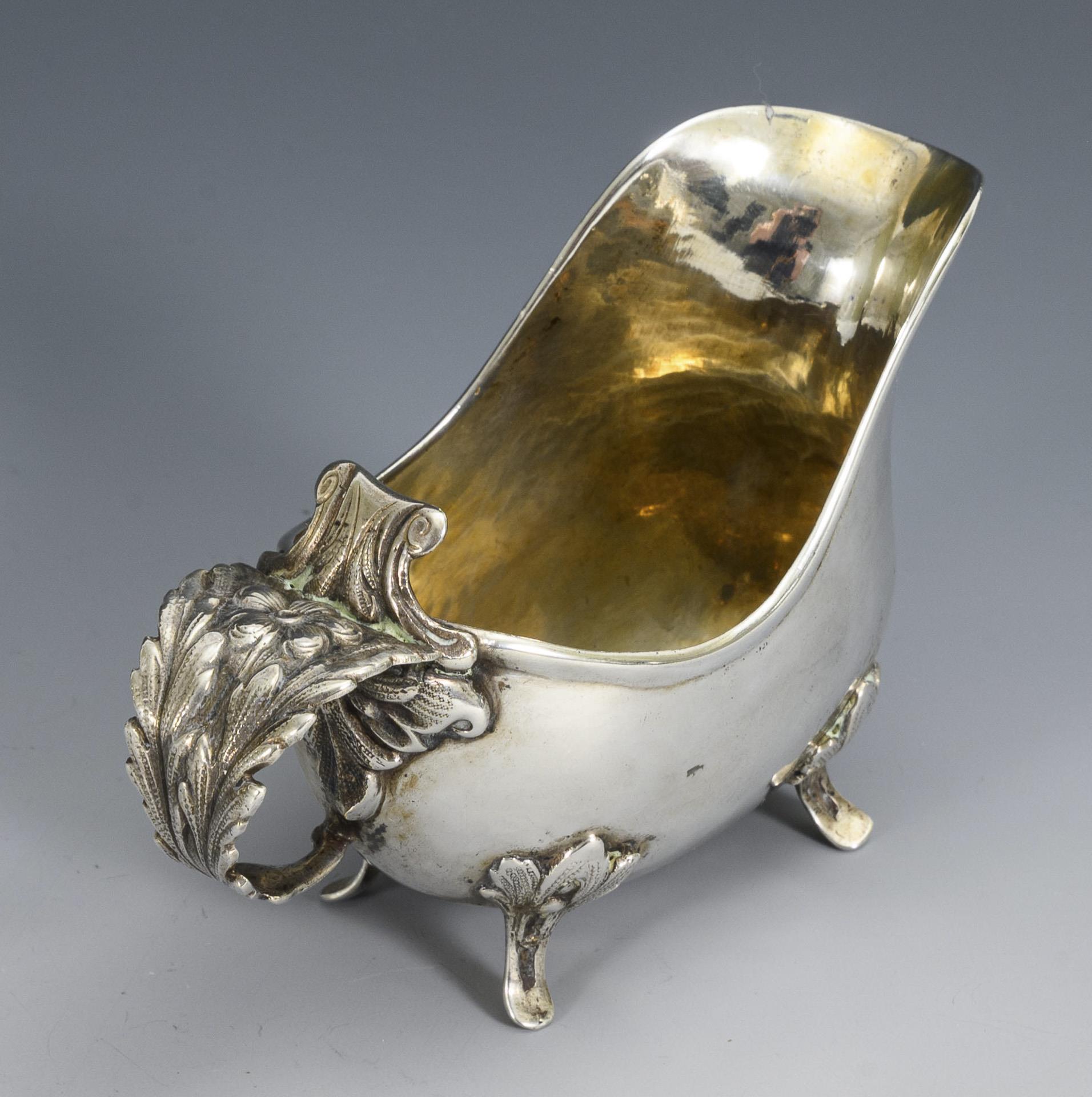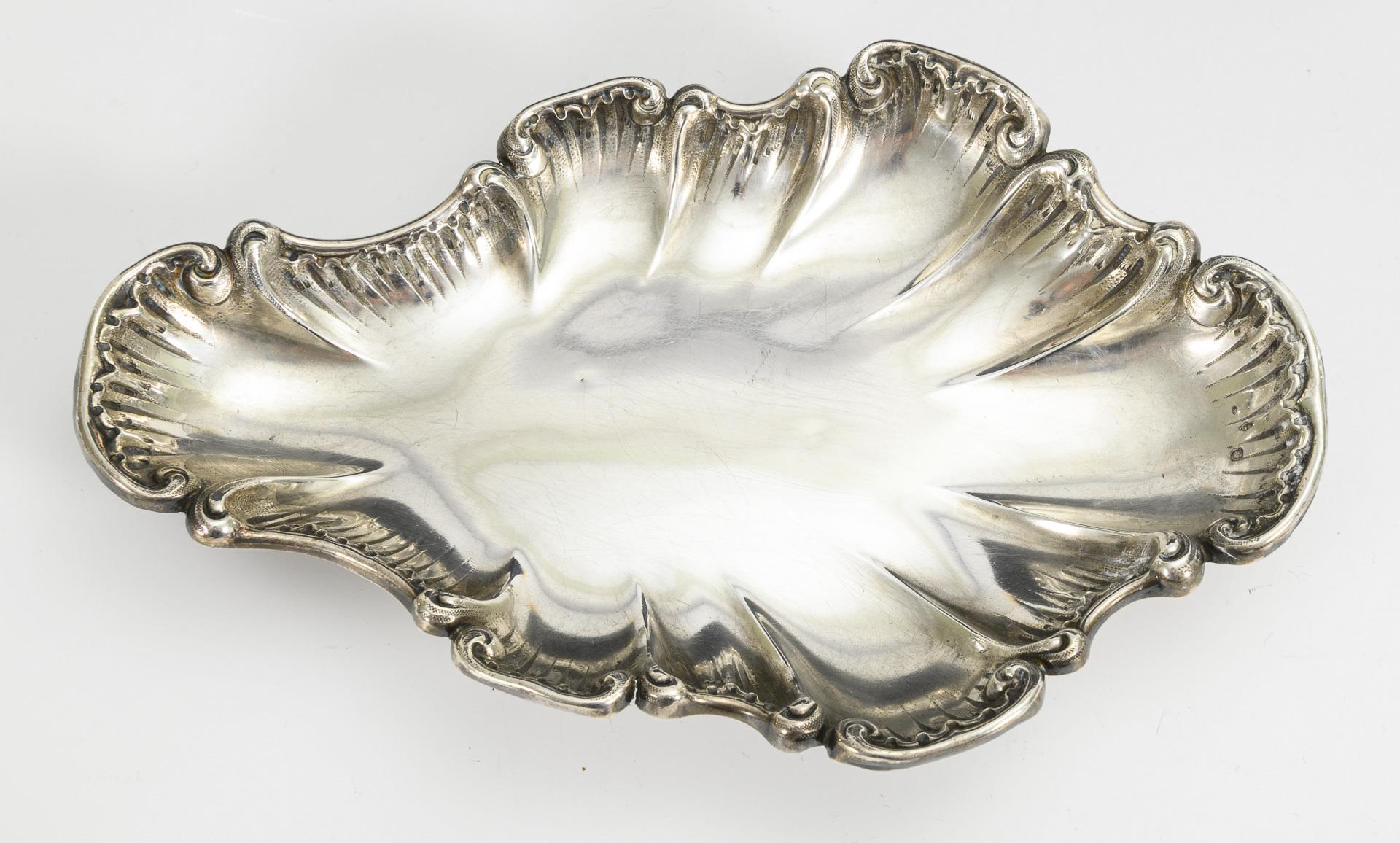 Blattförmige Rocaillenschale auf 3 geschwungenen Füßchen (Minervakopf/Meisterzeichen Emile Faivre/österreichische Importmarke 1901-1921), 3,8 x 21 x 13,5 cm. / Handgetriebener Gießer (ungepunzt, Silber geprüft) mit reliefiertem Blatthenkel, 8 x 13 x 5,5 cm. Schale mit kleinen Dellen.