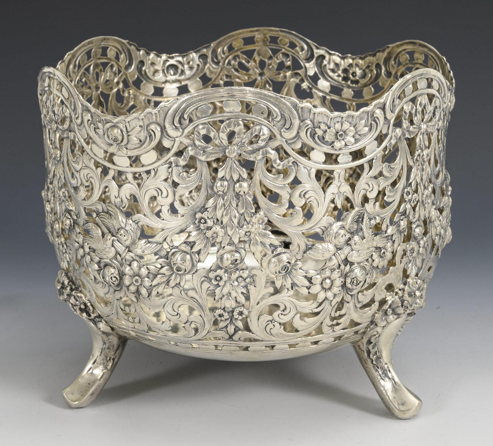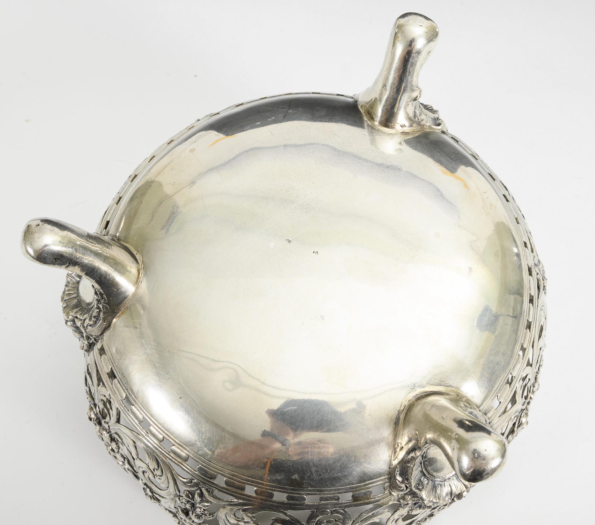 Tiefe, runde Schale mit floral durchbrochener Wandung, auf 3 Füßen. Kleine Dellen im Boden, Lötspuren.