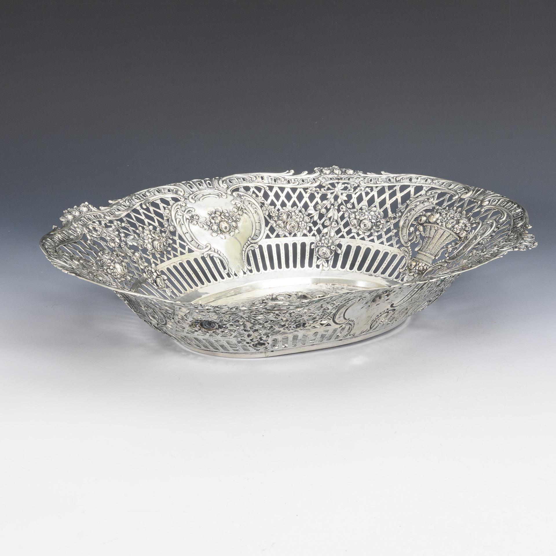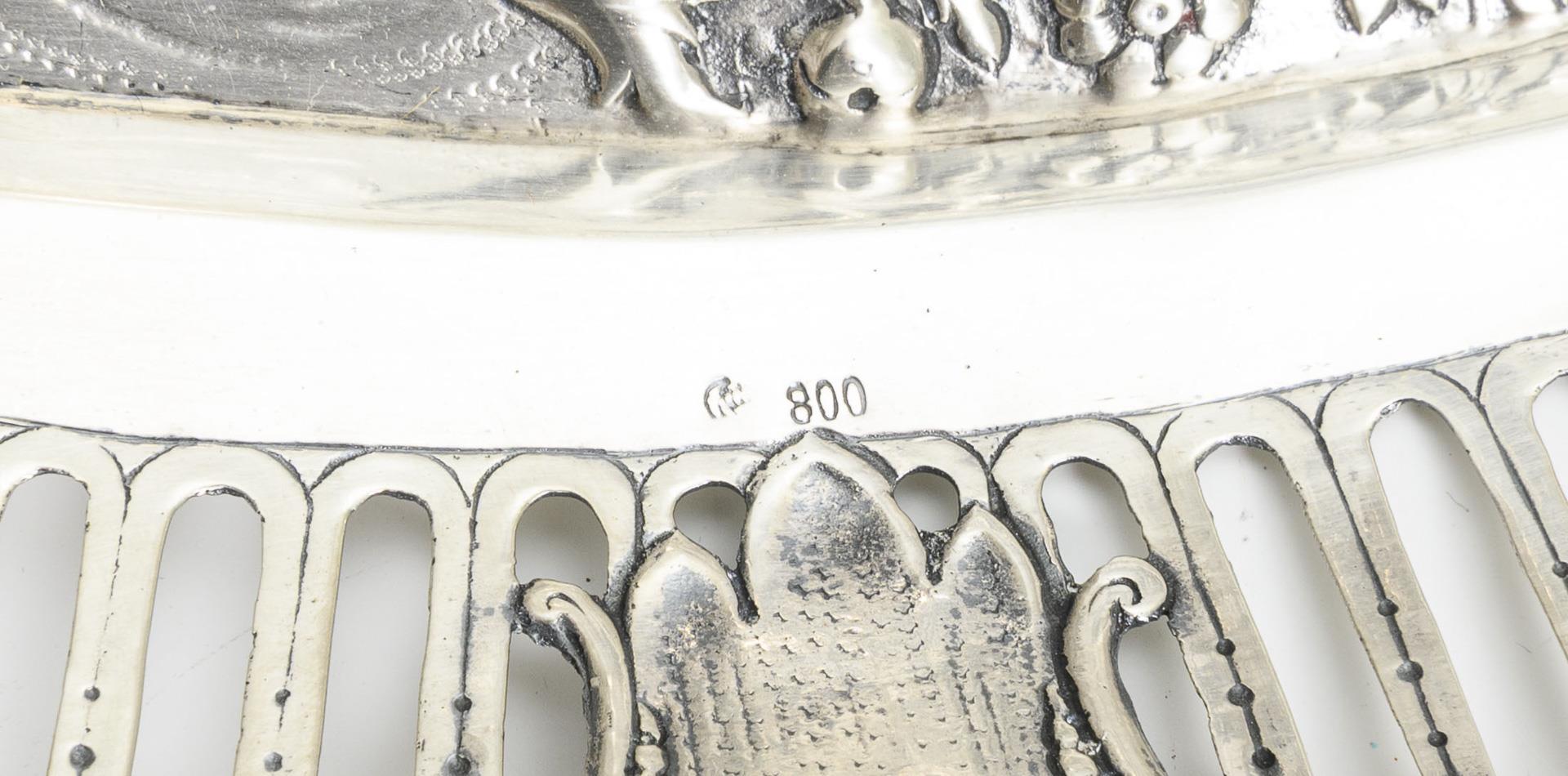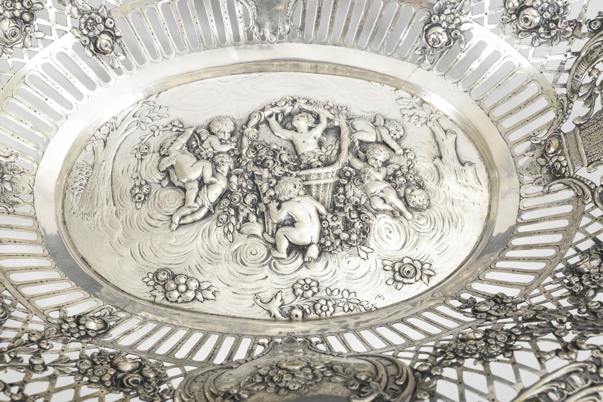 Reich reliefierter, ovaler Korb mit Putten und Blütengirlanden.