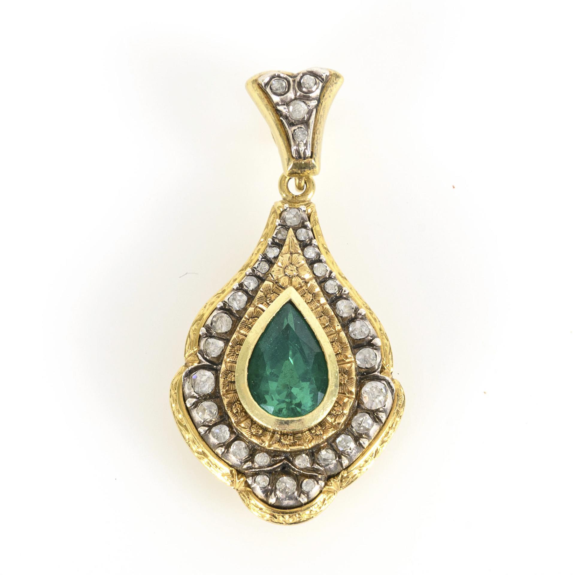 Sie befinden sich hier: Startseite Kategorien Schmuck Historisierender Anhänger mit Smaragd-Doublette und Diamantbesatz