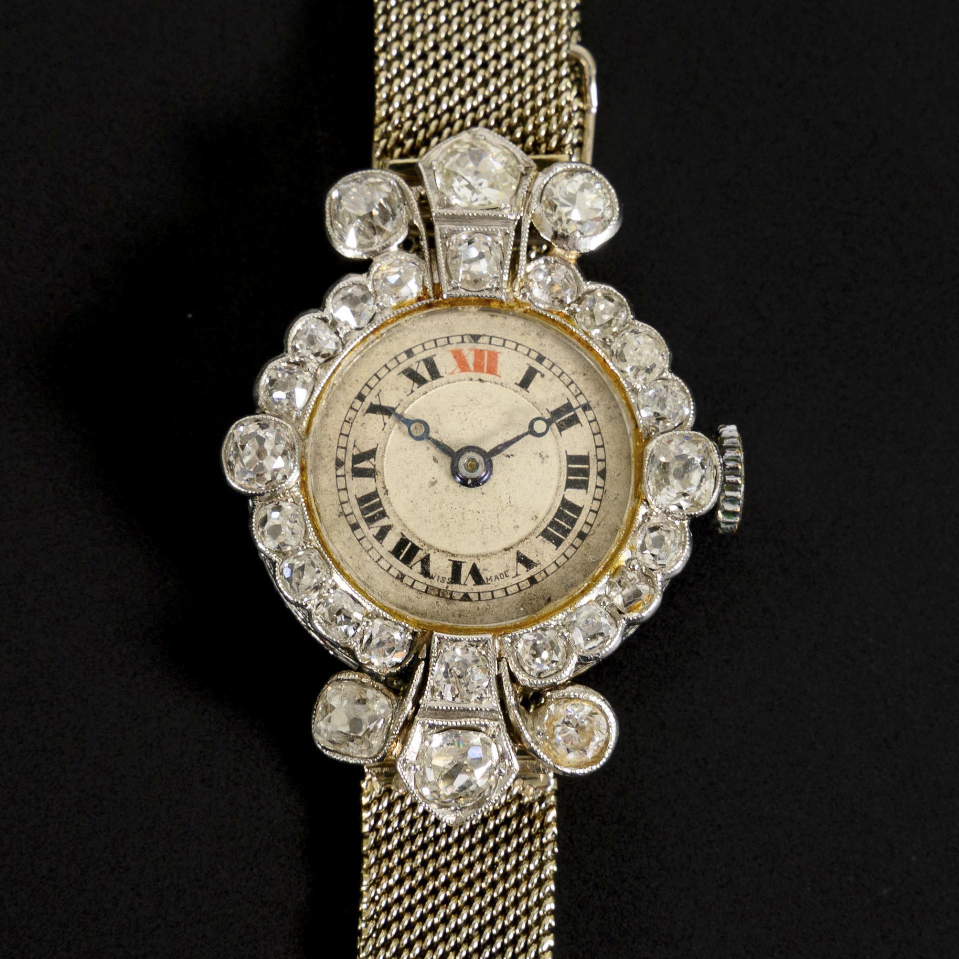 Art déco-Uhr mit Besatz aus 25 Altschliff-Brillanten, an einem Milanaise-Armband.