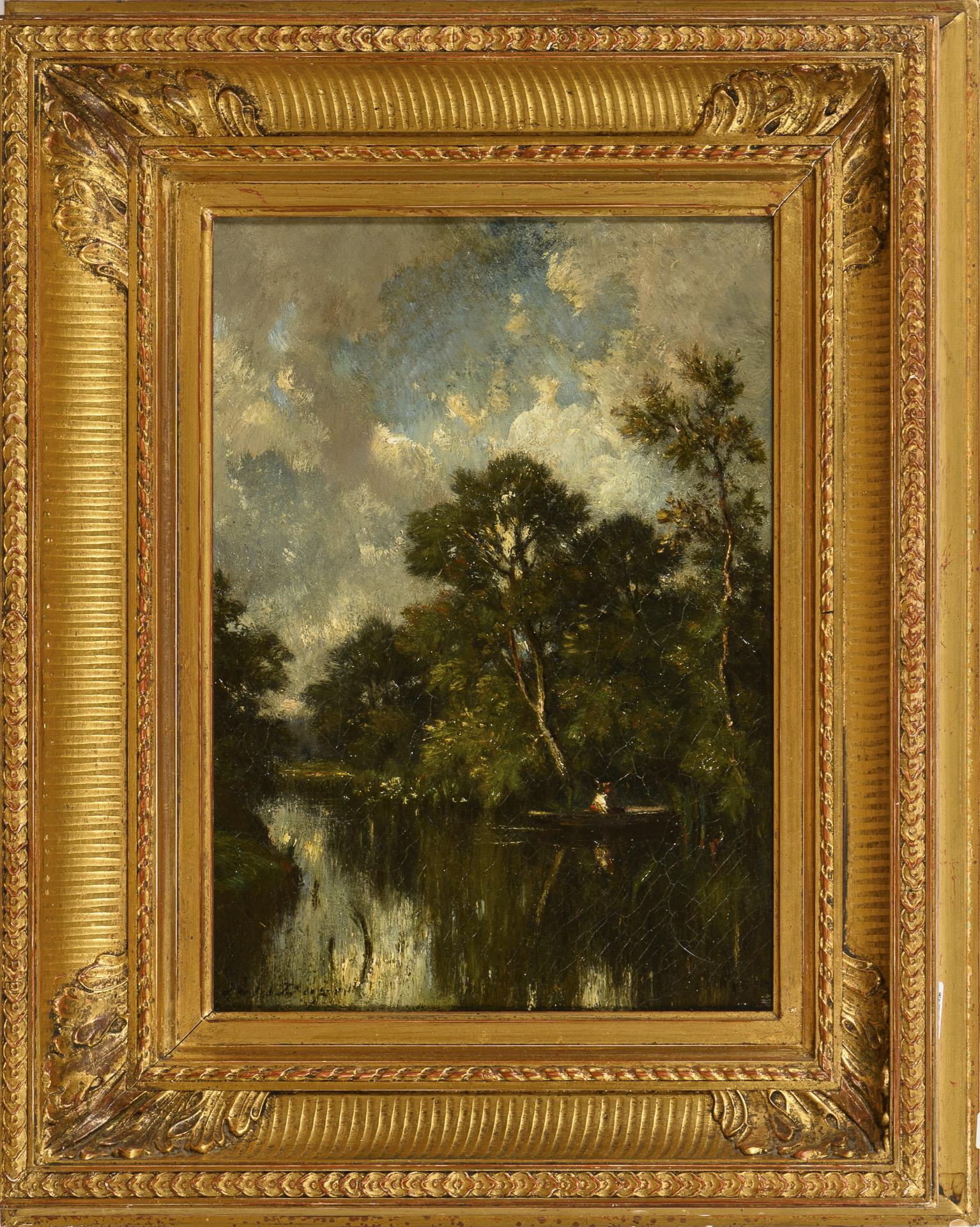 Ruhiger Flusslauf mit Angler im Boot nahe dem dicht bewachsenen Ufer. Anbei Expertise von Claude Marumo vom 22.9.1995. Leichte Altersspuren.