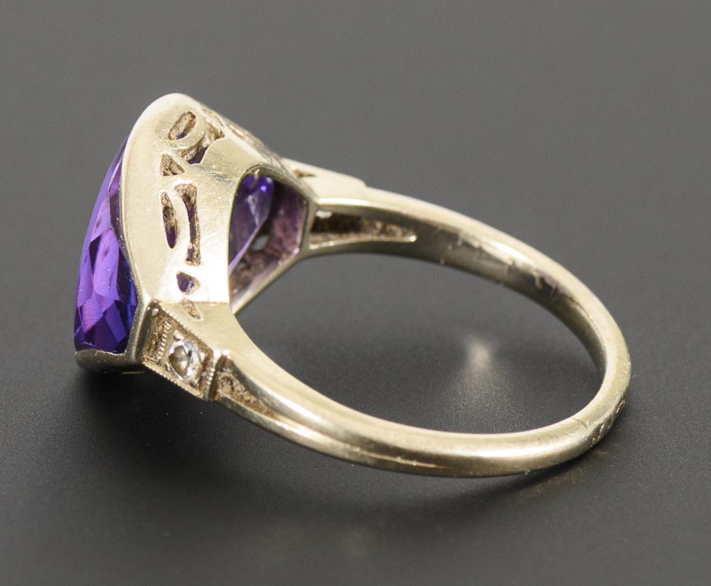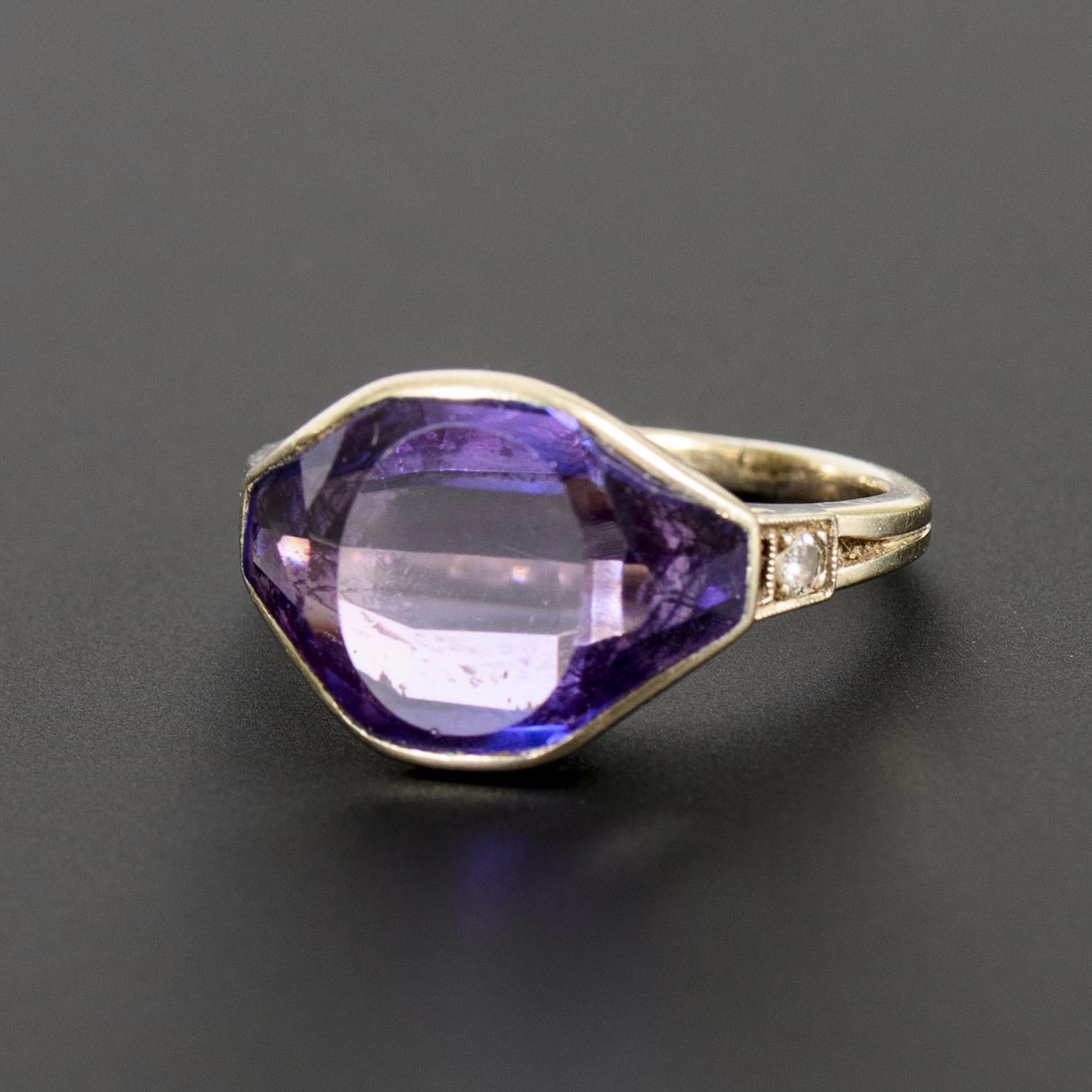 Ring mit einem großen, in ungewöhnlicher Form beschliffenem Amethysten sowie zwei kleinen Diamanten an den Ringschultern. Unterseitig mit einer Vergrößerung der Ringschiene.