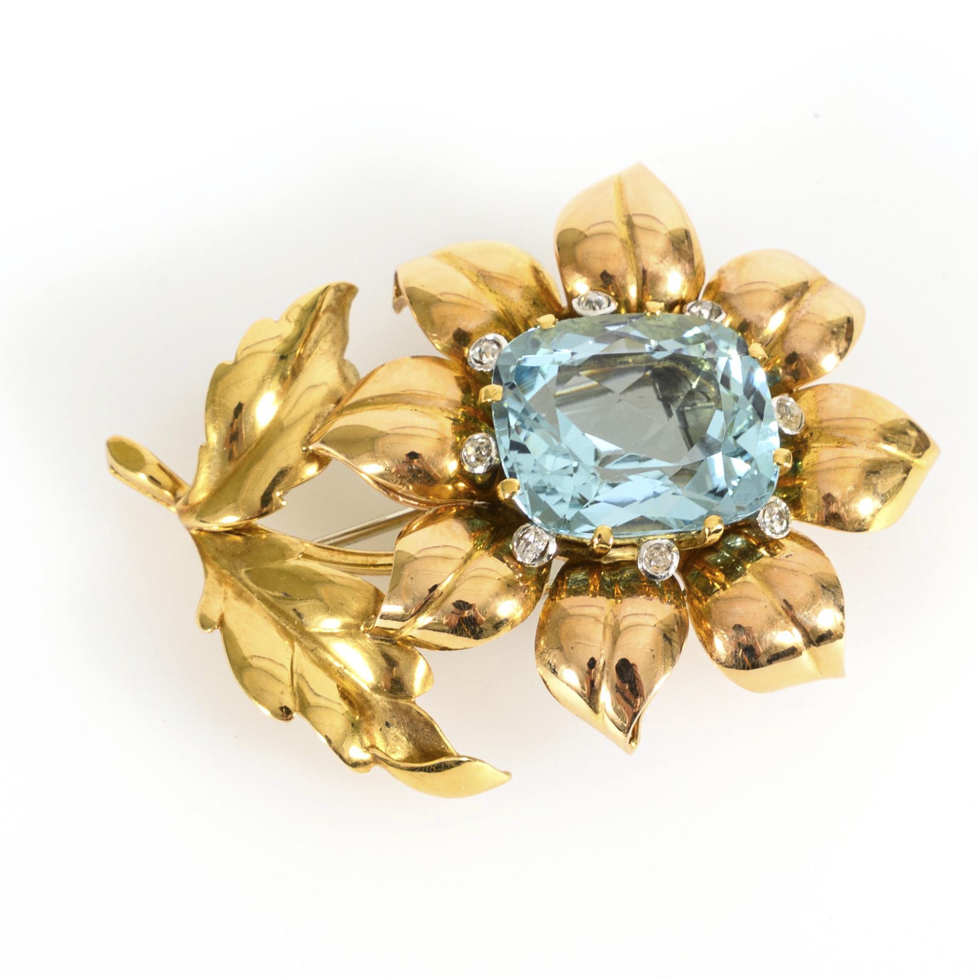 Außergewöhnliche, mehrfarbige Novelty-Brosche in Form einer Blüte mit Blattwerk am Stängel. Umgeben von 7 Altschliff-Diamanten ein großer Aquamarin im Sternschliff. Rückseitig mit zwei Nadeln.
