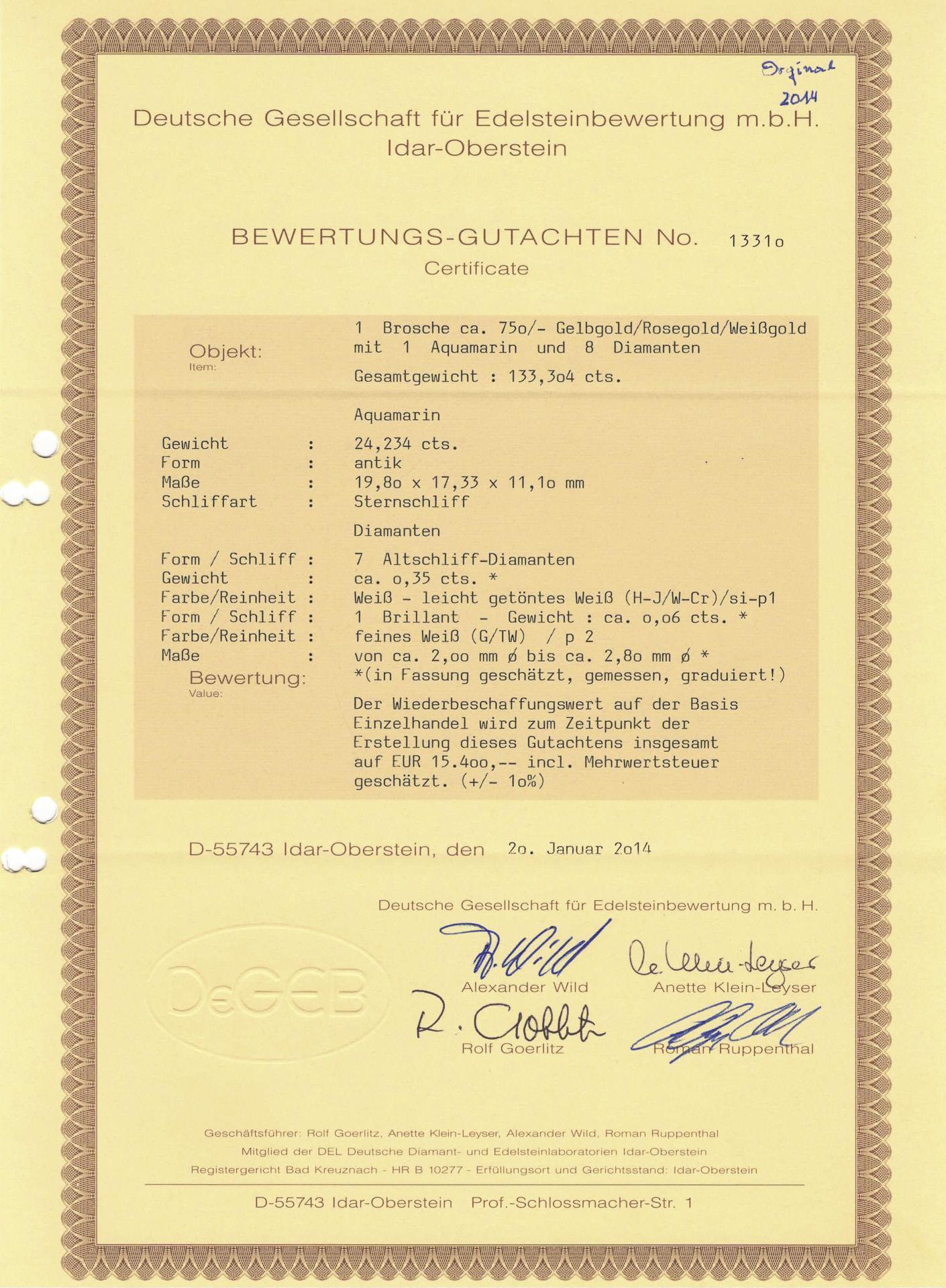 Gelb-, Weiß- und Roségold 750 geprüft. Die Brosche insgesamt max. ca. 59,19 x 38,97 mm, der Aquamarin ca. 19,80 x 17,3.11,10 mm/ca. 24,234 ct; die 7 Altschliff-Diamanten zusammen ca. 0,35 ct/(H-J/W-Cr)/si-p1. 26,66 g.