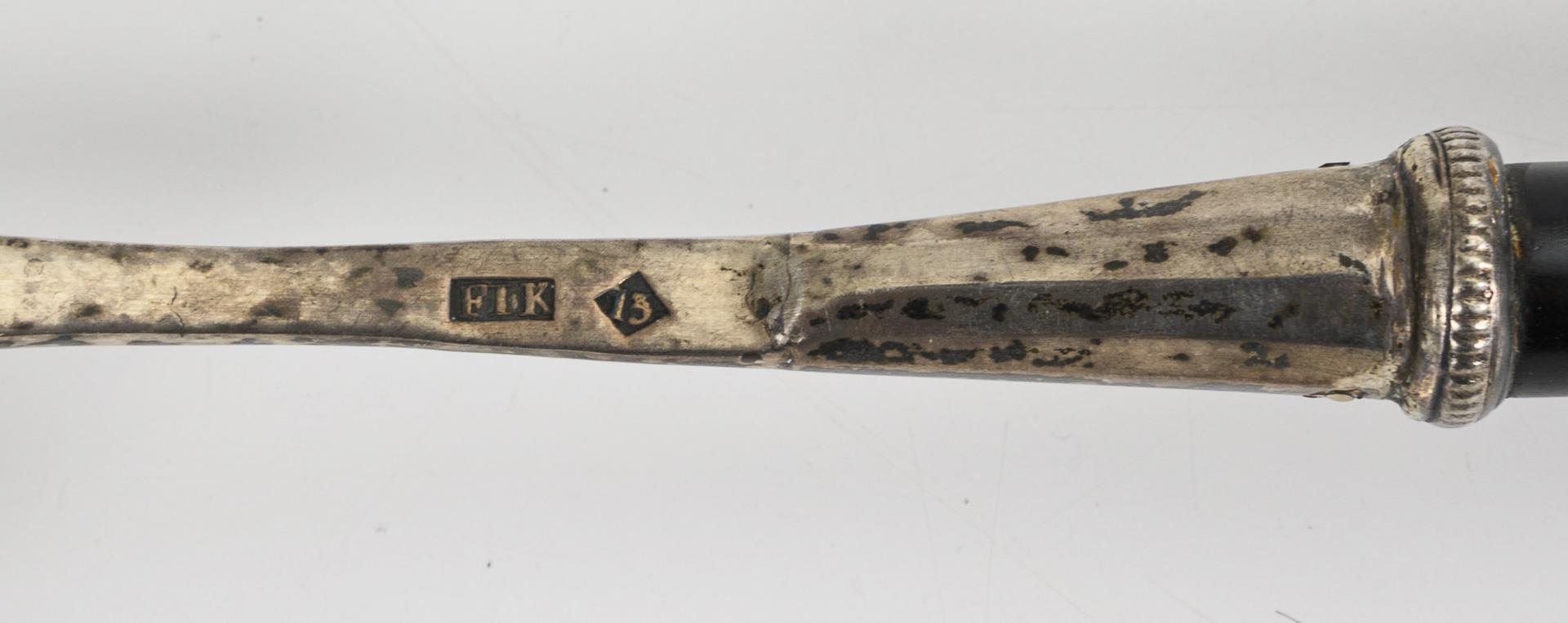 Flache Kelle mit Holzgriff (13 Lot), L 37 cm. / Tortenheber mit Beingriff (13 Lot), L 26 cm. / Floral gravierter Löffel (800), L 22 cm. / Amerikanischer Löffel mit blattförmiger Laffe und Monogrammgravur (Whiting, New York/Sterling), L 23 cm. Einige Dellen und Reparaturstellen. Abschlussknauf am Griff der Kelle fehlt.