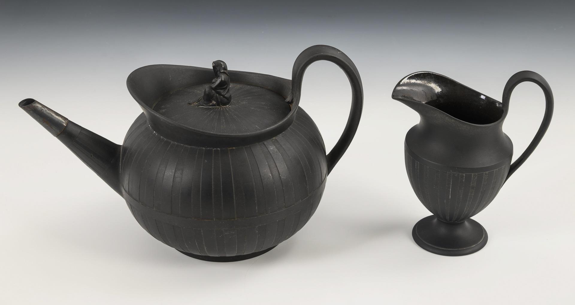 Grün-weiß: Krug (H 19 cm), Kratervase (H 10 cm), Koppchen (H 5 cm), Dose (H 3 cm), 2 verschiedene Schälchen (L 11 und 15,5 cm). / 2x schwarzer Basalt: Teekanne (H 16,5 cm) und Milchkännchen (H 15,5 cm). Kannentülle ergänzt.