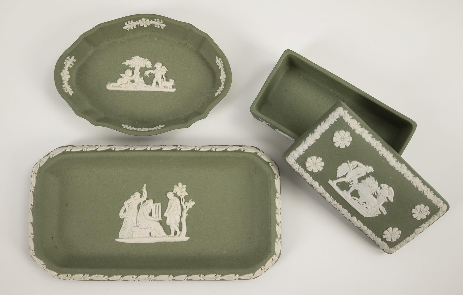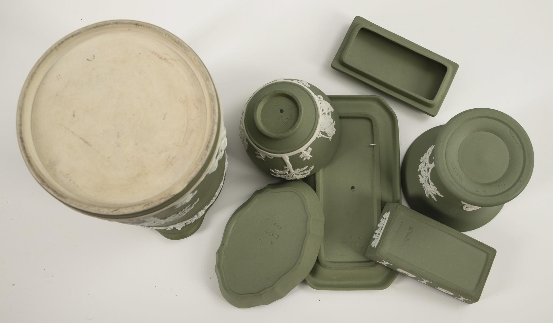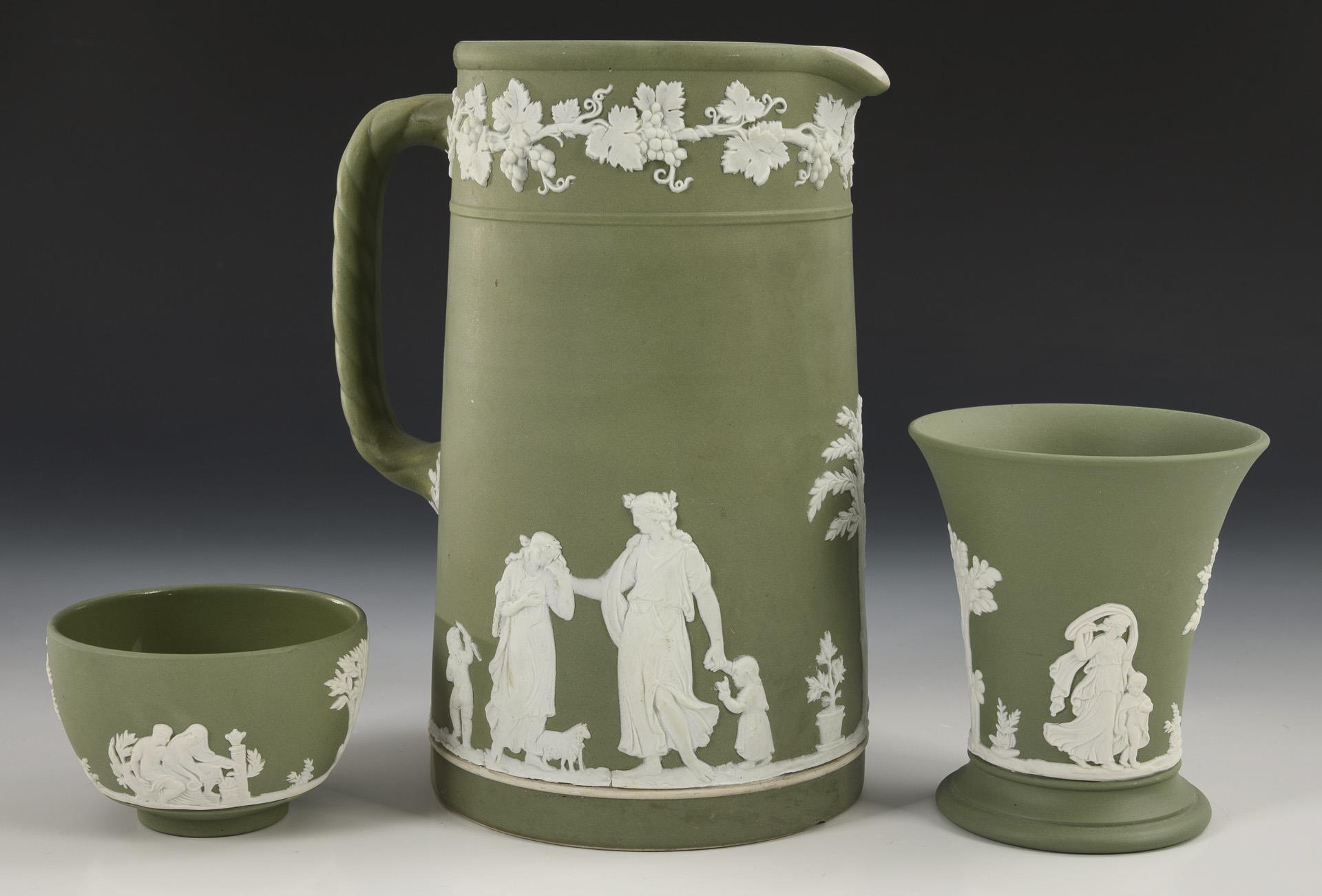 Grüne Jasperware mit weißen Reliefauflagen, Basaltware. H max. 19 cm.