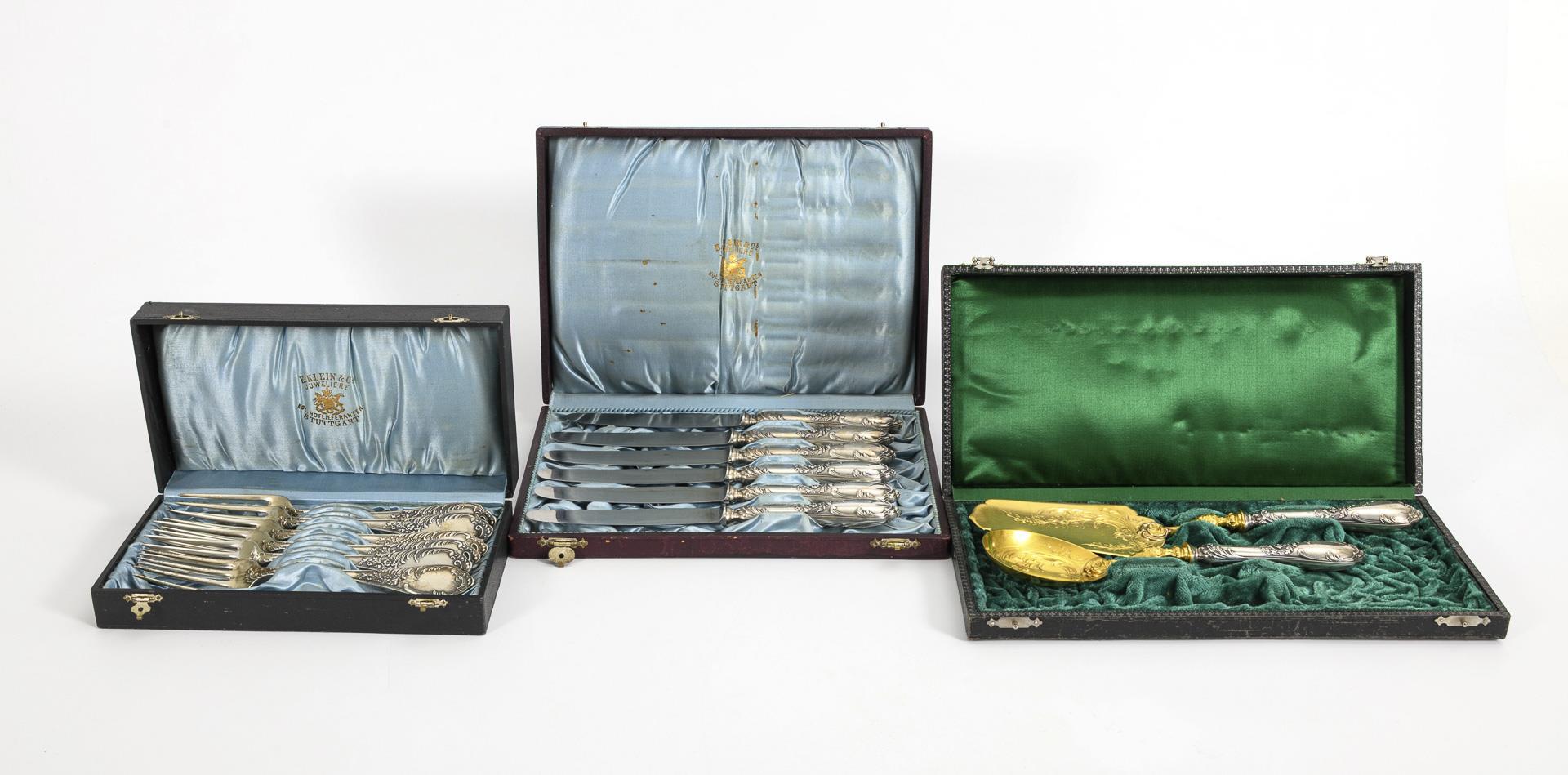 14 Teile in 3 Schatullen: 6 Menümesser, 6 Menügabeln und 2-teiliges Vorlegebesteck, alle mit reliefierten Griffen. Heber minimal verbogen.