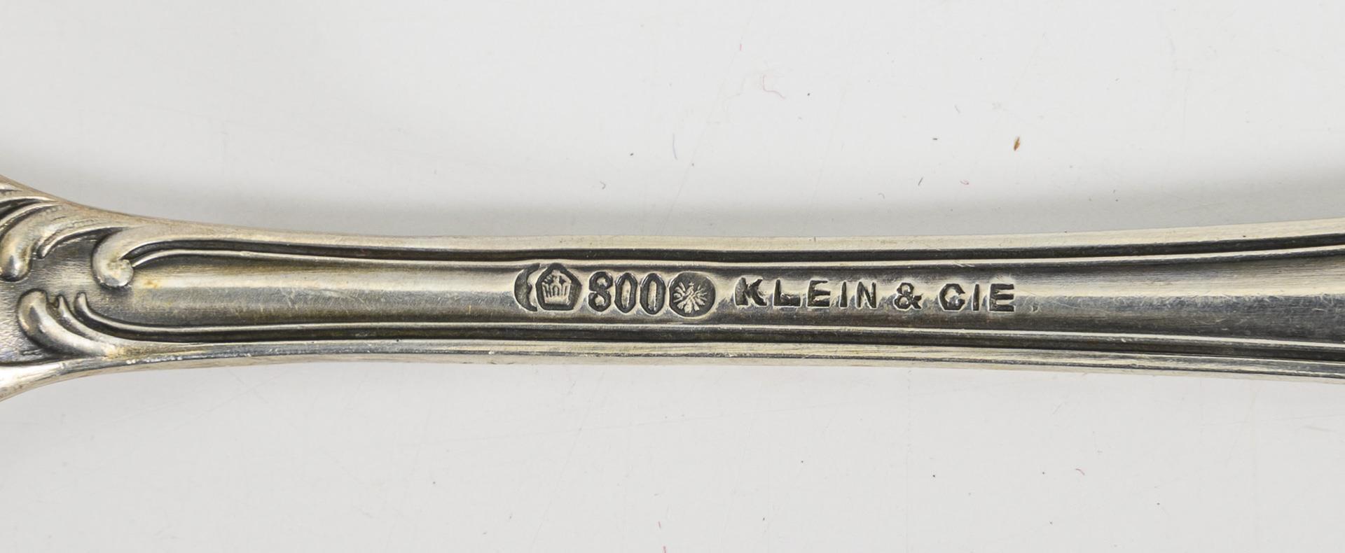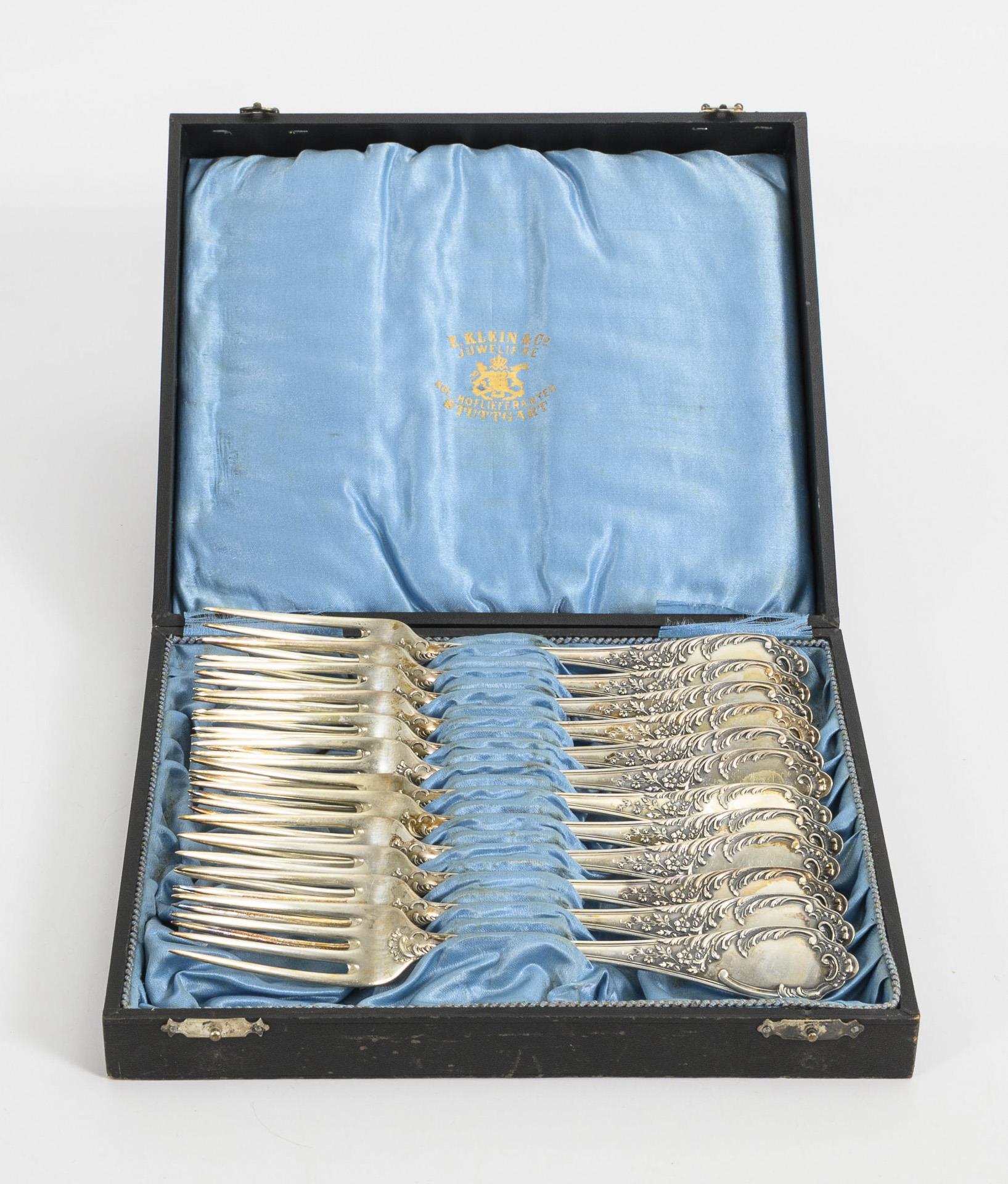 18 gründerzeitlich reliefierte Teile. 12 Gabeln in originaler Juwelierschatulle, (Halbmond/Krone/800/Bruckmann & Söhne gepunzt, mit Juwelierstempel E. Klein), L 21 cm. Dazu 6 Messer (80er Auflage gestempelt), L 25 cm.