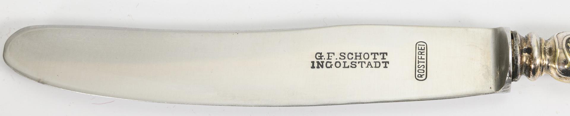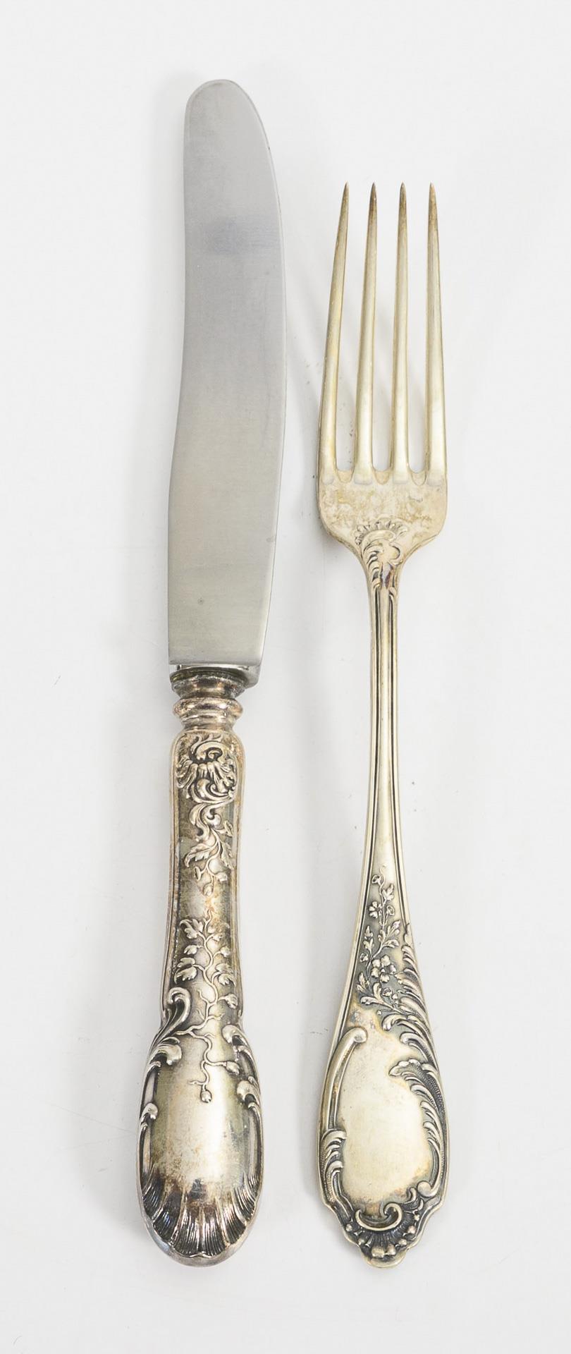 12 silberne Menügabeln und 6 ähnliche versilberte Menümesser.