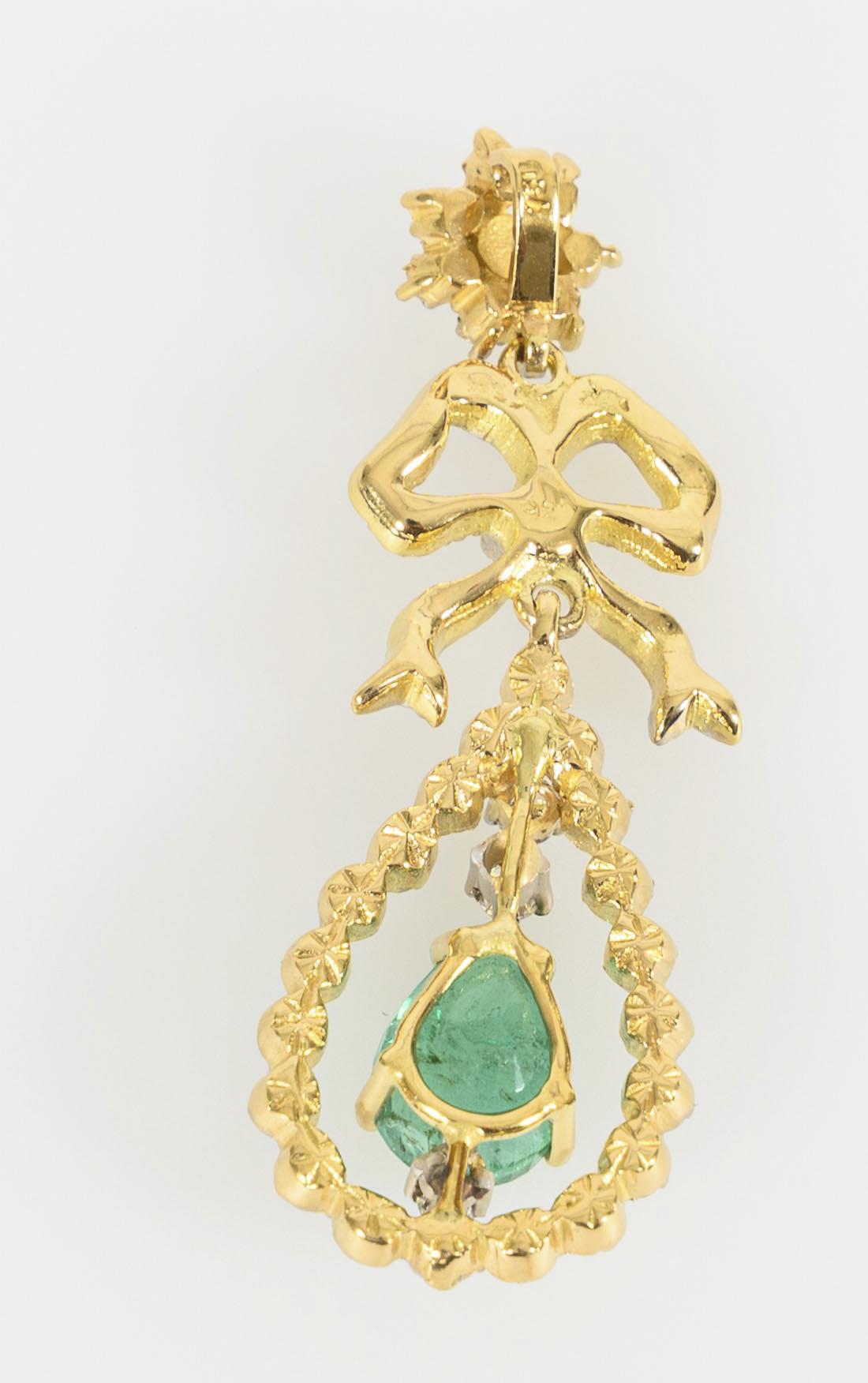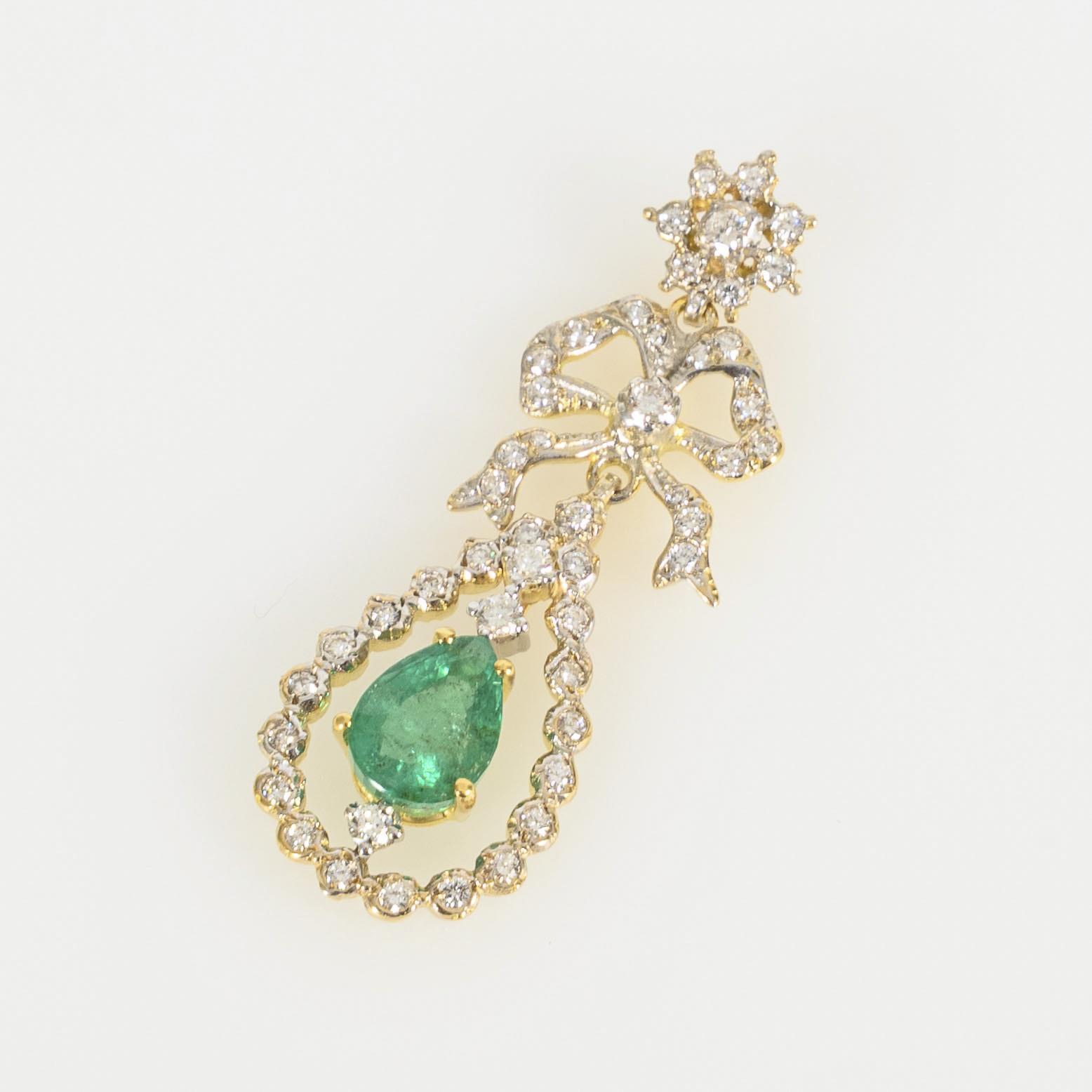 Qualitätvoller Anhänger mit einem tropfenförmigen Smaragd und umfassendem Besatz von 48 Brillanten, stilistisch an Entwürfe aus der Zeit des Spätbarock/Rokoko anknüpfend. Beweglich gearbeitet.